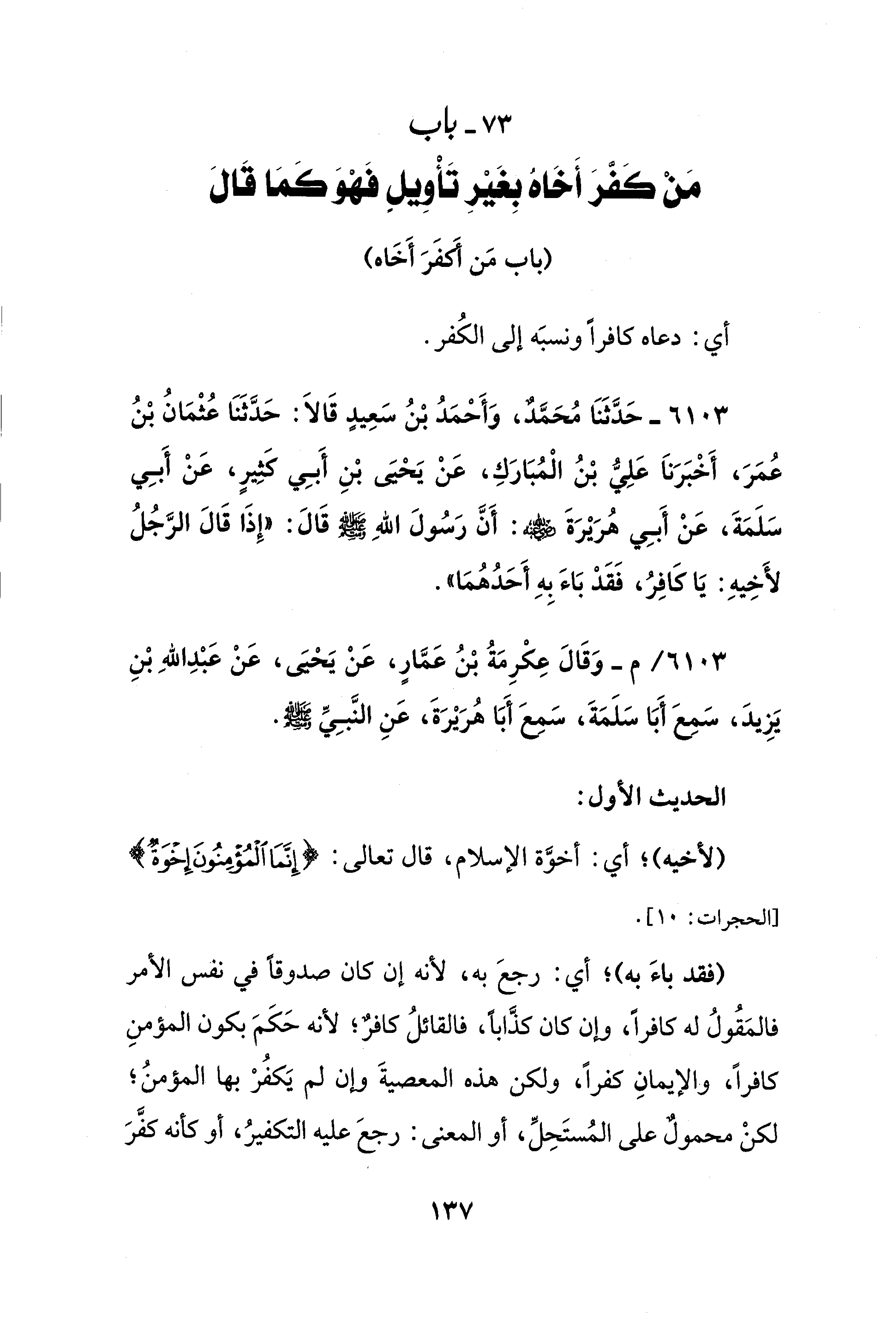 6103 - حَدَّثَنَا مُحَمَّدٌ، وَأَحْمَدُ بْنُ سَعِيدٍ قَالَا: حَدَّثَنَا عُثْمَانُ بْنُ عُمَرَ، أَخْبَرَنَا عَلِيُّ بْنُ الْمُبَارَكِ، عَنْ يَحْيَى بْنِ أَبِي كَثِيرٍ، عَنْ أَبِي سَلَمَةَ، عَنْ أَبِي هُرَيْرَةَ - رضي الله عنه -: أَنَّ رَسُولَ اللهِ - صلى الله عليه وسلم - قَالَ: "إِذَا قَالَ الرَّجُلُ لأَخِيهِ: يَا كَافِرُ، فَقَدْ بَاءَ بِهِ أَحَدُهُمَا".