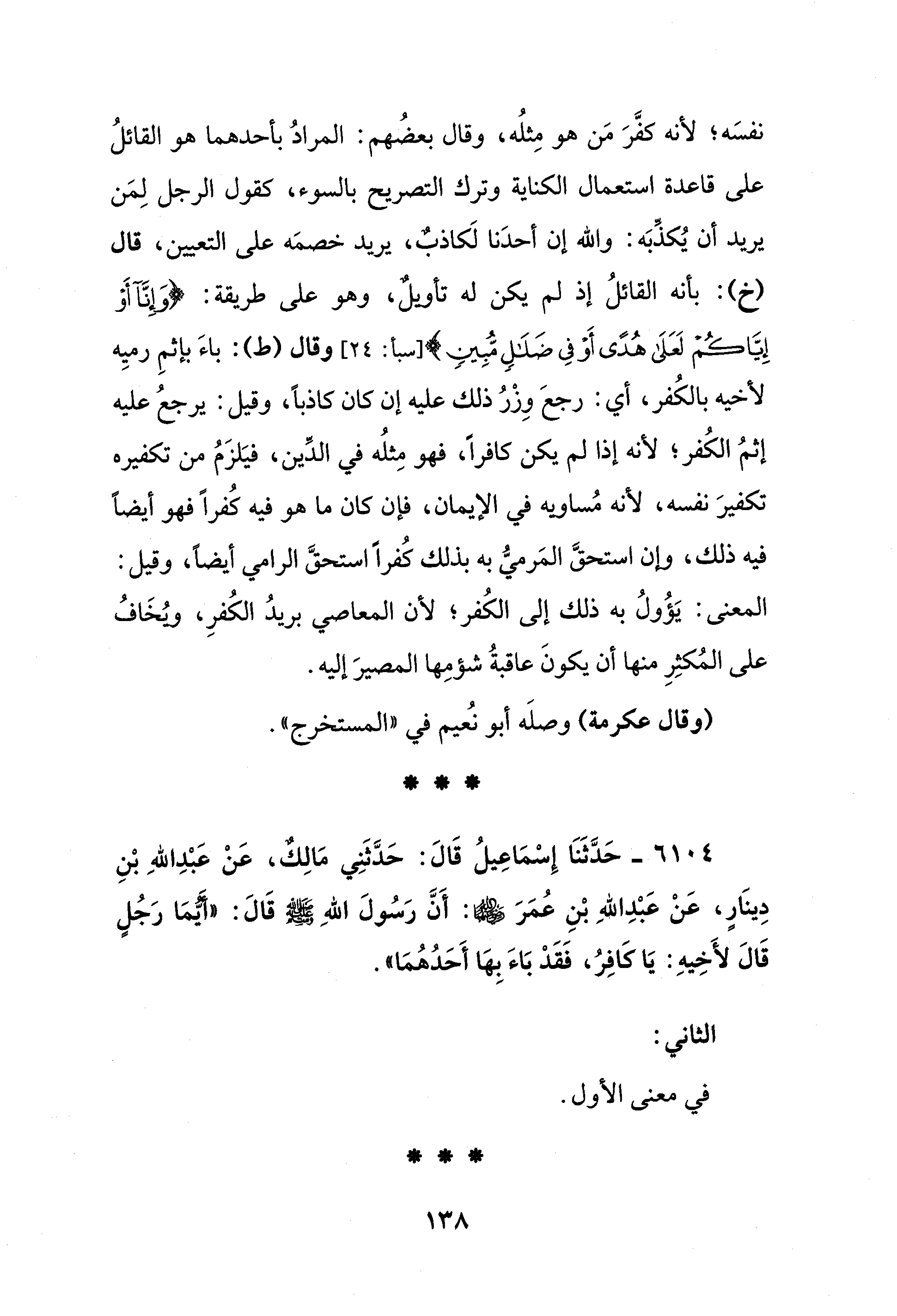 6104 - حَدَّثَنَا إِسْمَاعِيلُ قَالَ: حَدَّثَنِي مَالِكٌ، عَنْ عَبْدِ اللهِ بْنِ دِينَارٍ، عَنْ عَبْدِ اللهِ بْنِ عُمَرَ - رضي الله عنهما -: أَنَّ رَسُولَ اللهِ - صلى الله عليه وسلم - قَالَ: "أَيُّمَا رَجُلٍ قَالَ لأَخِيهِ: يَا كَافِرُ، فَقَدْ بَاءَ بِهَا أَحَدُهُمَا".