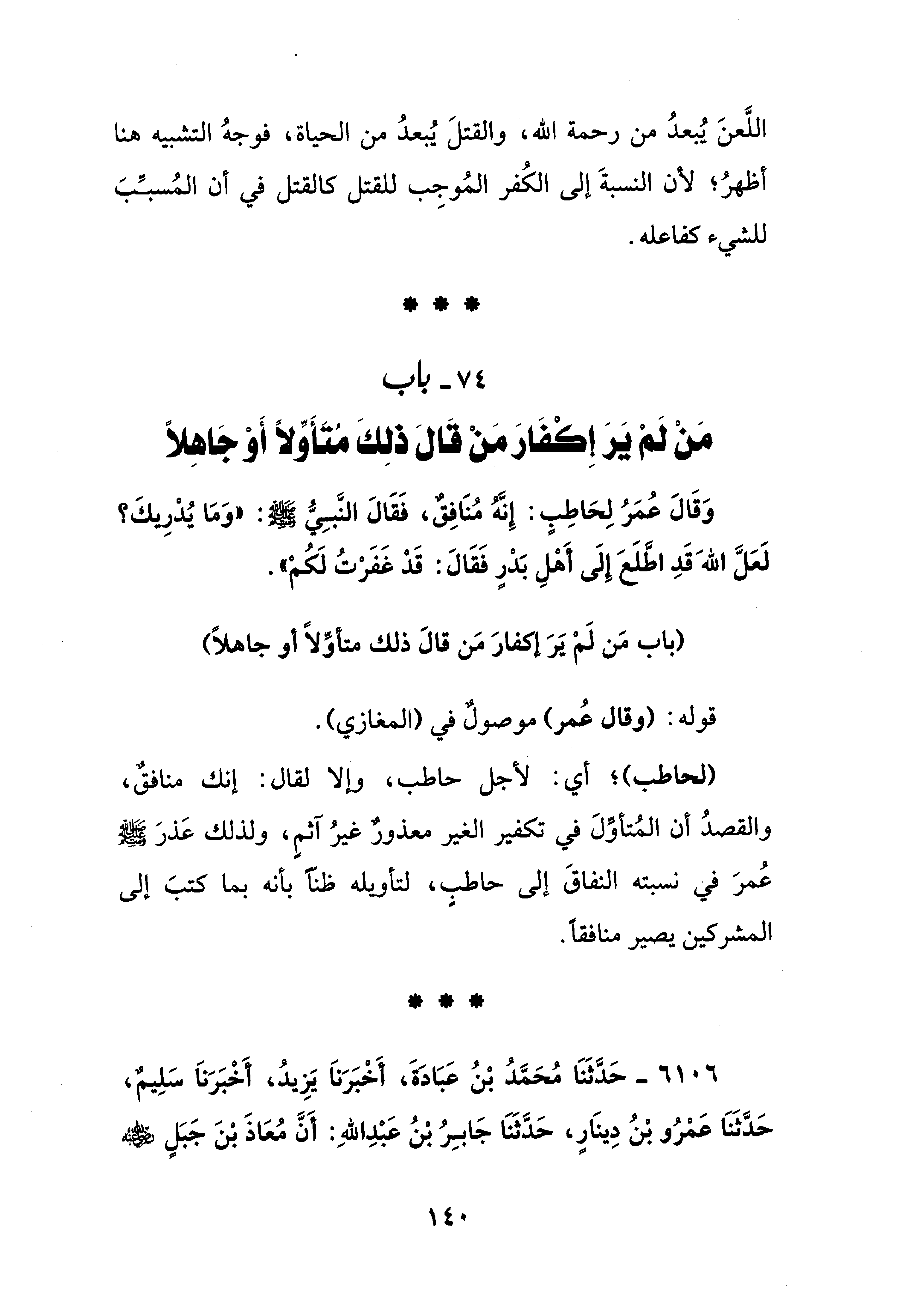 74 - باب مَنْ لَمْ يَرَ إِكْفَارَ مَنْ قَالَ ذلِكَ مُتأَوِّلًا أَوْ جَاهِلًا