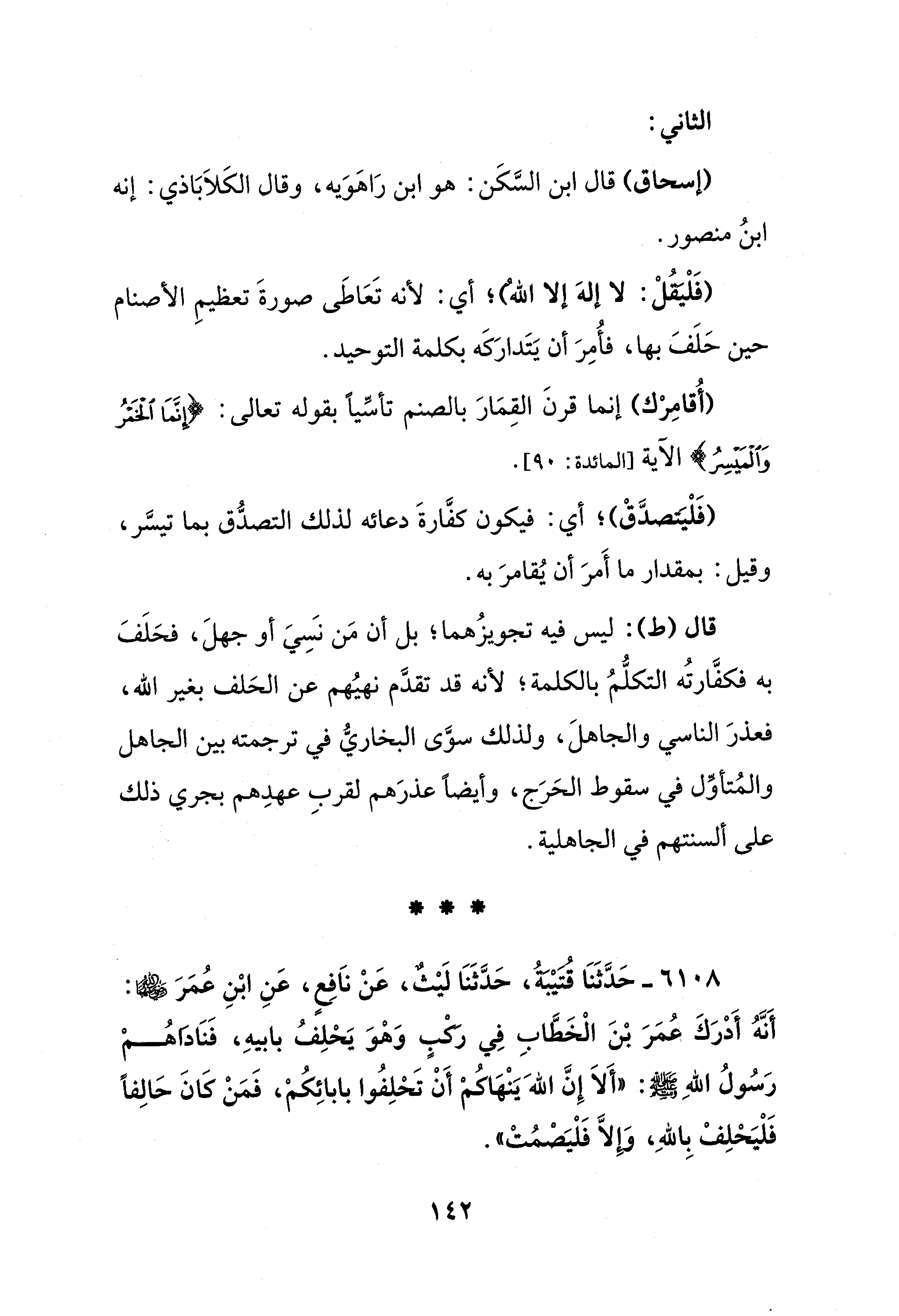 6108 - حَدَّثَنَا قُتَيْبَةُ، حَدَّثَنَا لَيْثٌ، عَنْ نَافِعٍ، عَنِ ابْنِ عُمَرَ - رضي الله عنهما -: أَنَّهُ أَدْرَكَ عُمَرَ بْنَ الْخَطَّابِ فِي رَكْبٍ وَهْوَ يَحْلِفُ بابيهِ، فَنَادَاهُمْ رَسُولُ اللهِ - صلى الله عليه وسلم -: "أَلاَ إِنَّ اللهَ يَنْهَاكُمْ أَنْ تَحْلِفُوا بآبائِكُمْ، فَمَنْ كَانَ حَالِفًا فَلْيَحْلِفْ بِاللهِ، وَإِلَّا فَلْيَصْمُتْ".