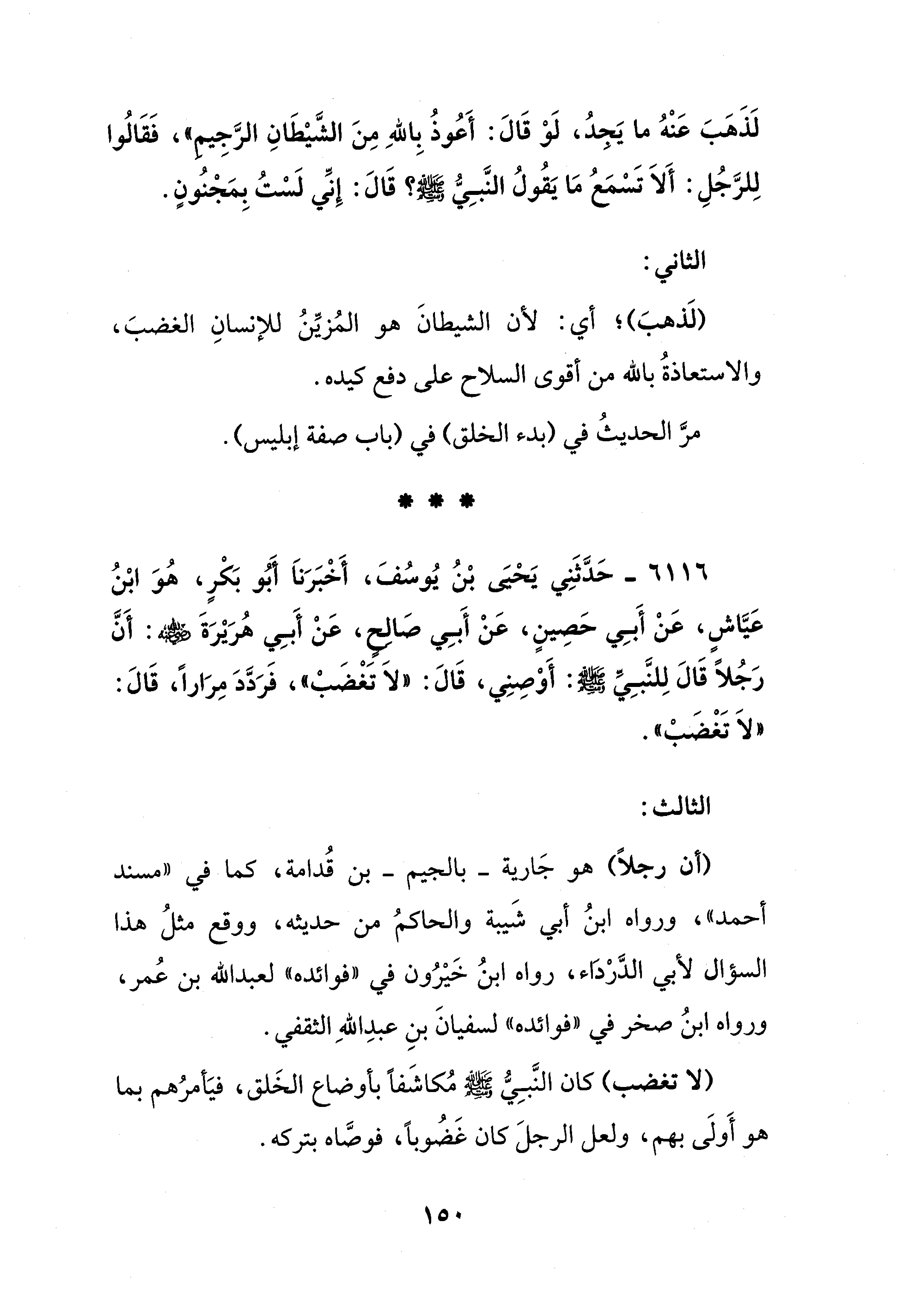 6116 - حَدَّثَنِي يَحْيَى بْنُ يُوسُفَ، أَخْبَرَنَا أَبُو بَكْرٍ، هُوَ ابْنُ عَيَّاشٍ، عَنْ أَبِي حَصِينٍ، عَنْ أَبِي صَالِحِ، عَنْ أَبِي هُرَيْرَةَ - صلى الله عليه وسلم -: أَنَّ رَجُلًا قَالَ لِلنَّبِيِّ - صلى الله عليه وسلم -: أَوْصِنِي، قَالَ: "لَا تغْضَبْ"، فَرَدَّدَ مِرَارًا، قَالَ: "لَا تَغْضَبْ".