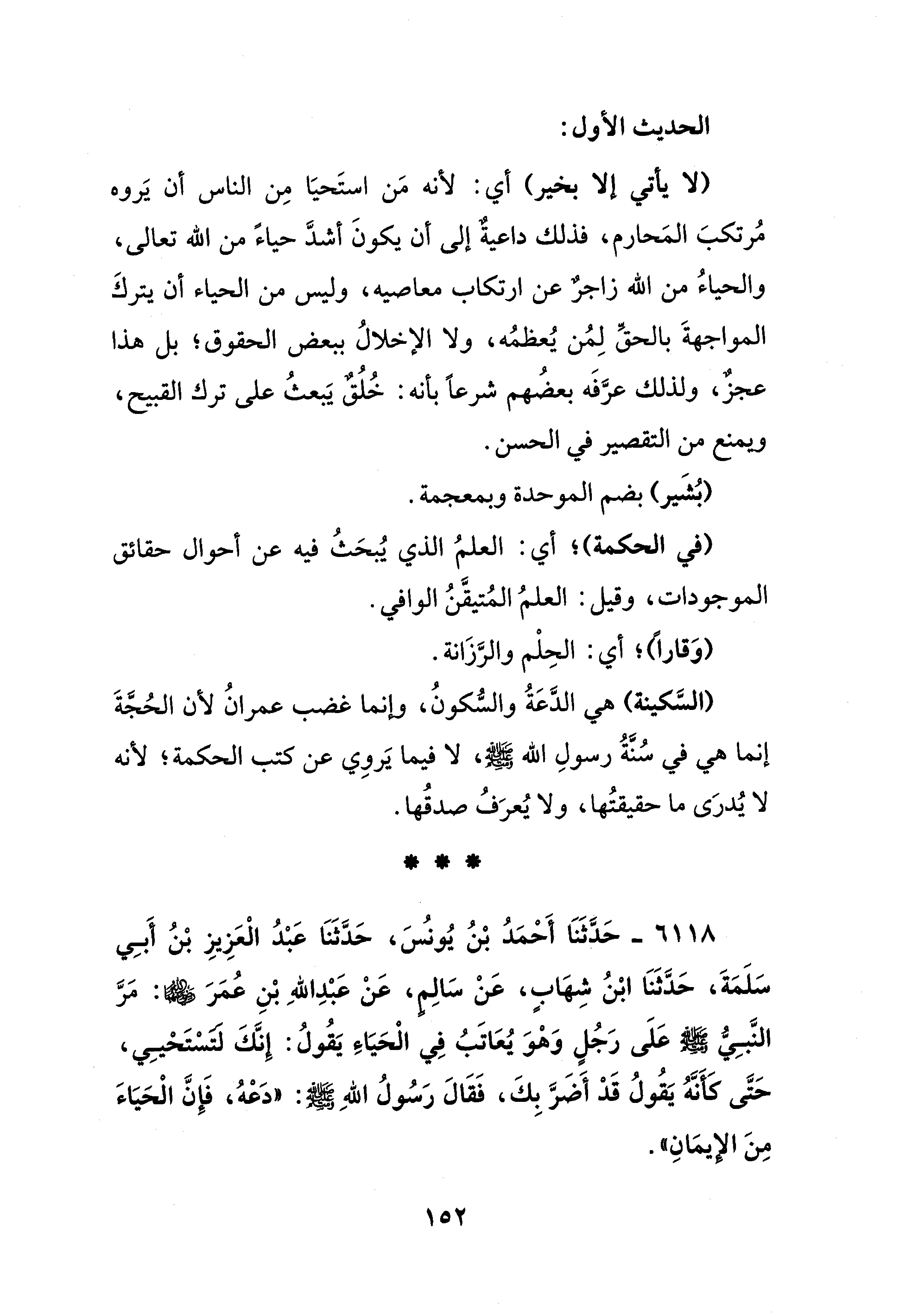 6118 - حَدَّثَنَا أَحْمَدُ بْنُ يُونُسُ، حَدَّثَنَا عَبْدُ الْعَزِيزِ بْنُ أَبِي سَلَمَةَ، حَدَّثَنَا ابْنُ شِهَابٍ، عَنْ سَالِمٍ، عَنْ عَبْدِ اللهِ بْنِ عُمَرَ - رضي الله عنهما -: مَرَّ النَّبِيُّ - صلى الله عليه وسلم - عَلَى رَجُلٍ وَهْوَ يُعَاتَبُ فِي الْحَيَاءِ يَقُولُ: إِنَّكَ لَتَسْتَحْيِي، حَتَّى كَأَنَّهُ يَقُولُ قَدْ أَضَرَّ بِكَ، فَقَالَ رَسُولُ اللهِ - صلى الله عليه وسلم -: "دَعْهُ، فَإِنَّ الْحَيَاءَ مِنَ الإِيمَانِ".