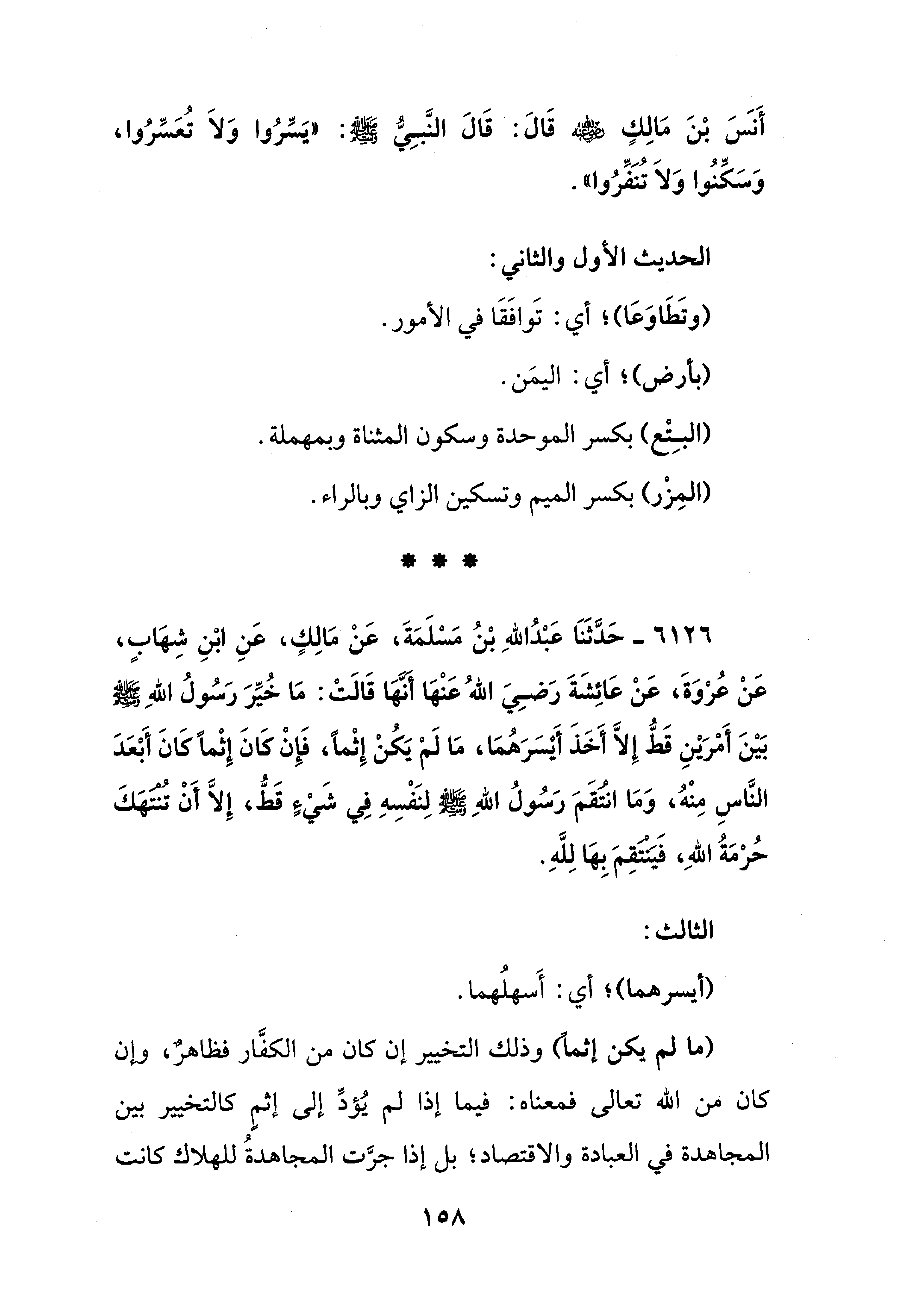 6126 - حَدَّثَنَا عَبْدُ اللهِ بْنُ مَسْلَمَةَ، عَنْ مَالِكٍ، عَنِ ابْنِ شِهَابٍ، عَنْ عُرْوَةَ، عَنْ عَائِشَةَ رَضِيَ اللهُ عَنْهَا أَنَّهَا قَالَتْ: مَا خُيِّرَ رَسُولُ اللهِ - صلى الله عليه وسلم - بَيْنَ أَمْرَيْنِ قَطُّ إِلَّا أَخَذَ أَيْسَرَهُمَا، مَا لَمْ يَكُنْ إِثْمًا، فَإِنْ كَانَ إِثْمًا كَانَ أَبْعَدَ النَّاسِ مِنْهُ، وَمَا انْتَقَمَ رَسُولُ اللهِ - صلى الله عليه وسلم - لِنَفْسِهِ فِي شَيْءٍ قَطُّ، إِلَّا أَنْ تُنْتَهَكَ حُرْمَةُ اللهِ، فَيَنْتَقِمَ بِهَا لِلَّهِ.