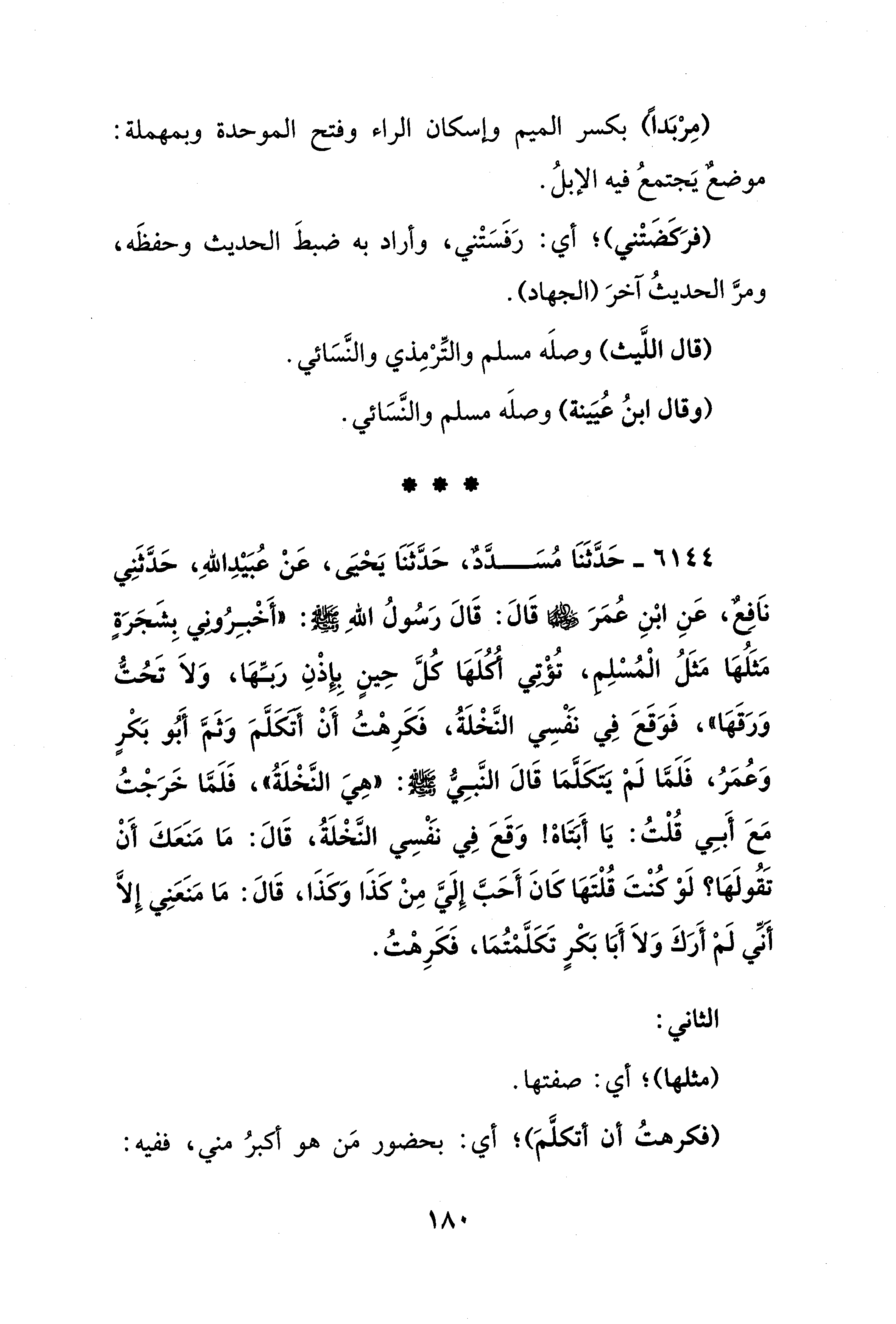 6144 - حَدَّثَنَا مُسَدَّدٌ، حَدَّثَنَا يَحْيَى، عَنْ عُبَيْدِ اللهِ، حَدَّثَنِي نَافِعٌ، عَنِ ابْنِ عُمَرَ - رضي الله عنهما - قَالَ: قَالَ رَسُولُ اللهِ - صلى الله عليه وسلم -: "أَخْبِرُونِي بِشَجَرَةٍ مَثَلُهَا مَثَلُ الْمُسْلِمِ، تُؤْتِي أُكُلَهَا كُلَّ حِينٍ بِإِذْنِ رَبِّهَا، وَلَا تَحُتُّ وَرَقَهَا"، فَوَقَعَ فِي نَفْسِي النَّخْلَةُ، فَكَرِهْتُ أَنْ أَتَكَلَّمَ وَثَمَّ أَبُو بَكْرٍ وَعُمَرُ، فَلَمَّا لَمْ يَتَكَلَّمَا قَالَ النَّبِيُّ - صلى الله عليه وسلم -: "هِيَ النَّخْلَةُ"، فَلَمَّا خَرَجْتُ مَعَ أَبِي قُلْتُ: يَا أَبَتَاهْ! وَقَعَ فِي نَفْسِي النَّخْلَةُ، قَالَ: مَا مَنَعَكَ أَنْ تَقُولَهَا؟ لَوْ كُنْتَ قُلْتَهَا كَانَ أَحَبَّ إِلَيَّ مِنْ كَذَا وَكَذَا، قَالَ: مَا مَنَعَنِي إِلَّا أَنِّي لَمْ أَرَكَ وَلَا أَبَا بَكْرٍ تَكَلَّمْتُمَا، فَكَرِهْتُ.