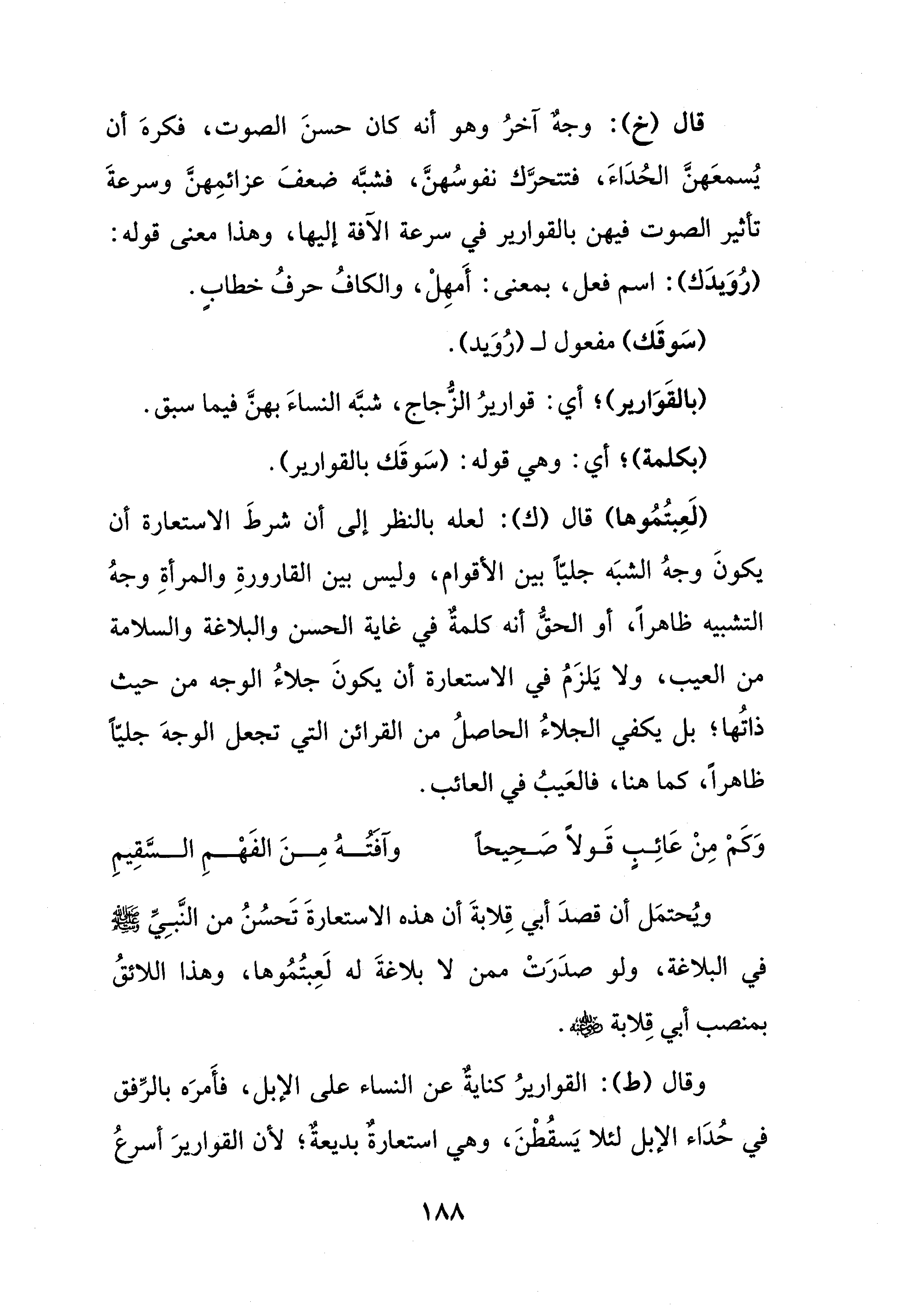 وقال (ط): القواريرُ كنايةٌ عن النساء على الإبل، فأَمرَه بالرِّفق في حُدَاء الإبل لئلا يَسقُطْنَ، وهي استعارةٌ بديعةٌ، لأن القواريرَ أسرعُ