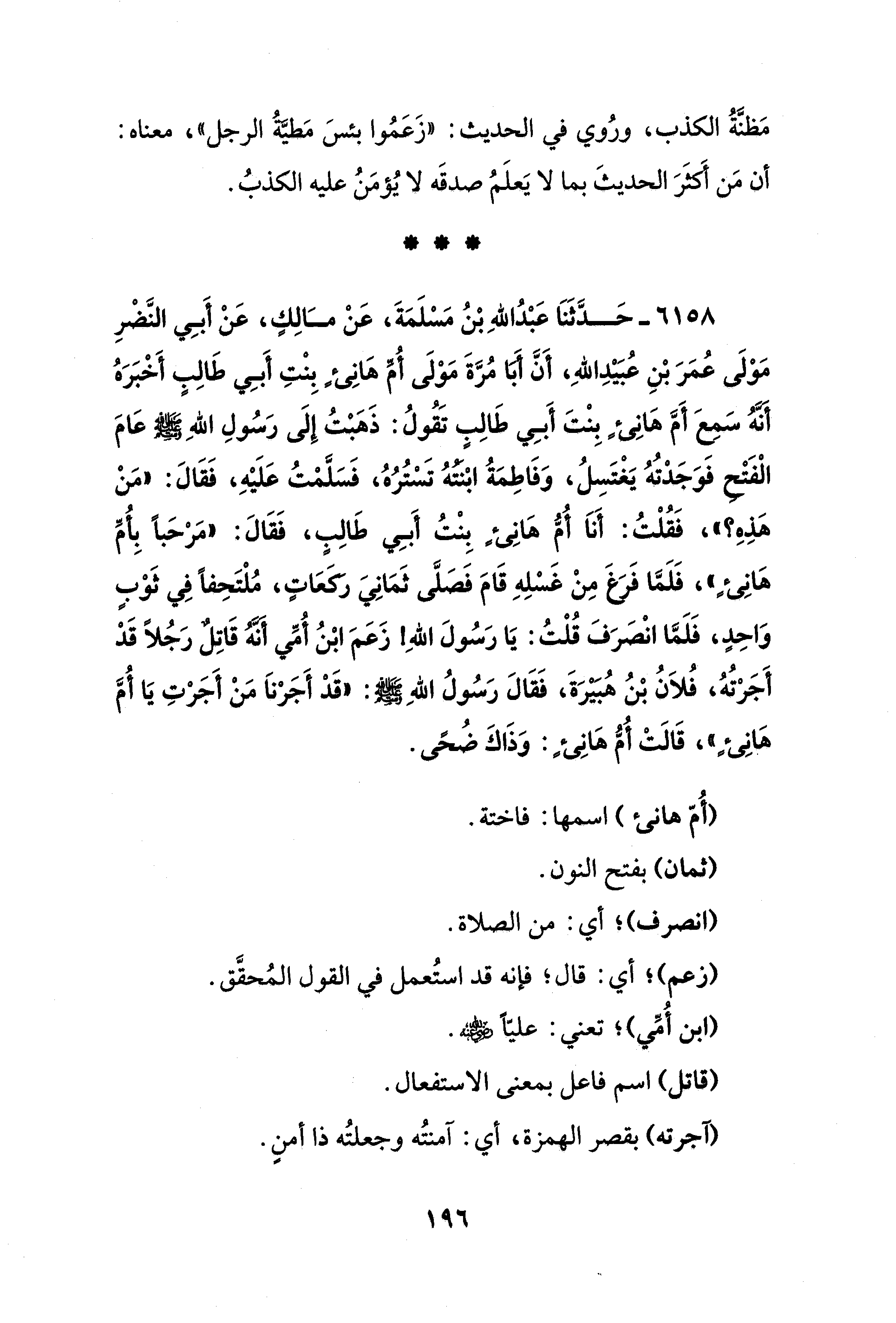 6158 - حَدَّثَنَا عَبْدُ اللهِ بْنُ مَسْلَمَةَ، عَنْ مَالِكٍ، عَنْ أَبِي النَّضْرِ مَوْلَى عُمَرَ بْنِ عُبَيْدِ اللهِ، أَنَّ أَبَا مُرَّةَ مَوْلَى أُمِّ هَانِئٍ بِنْتِ أَبِي طَالِبٍ أَخْبَرَهُ أَنَّهُ سَمِعَ أَمَّ هَانِئٍ بِنْتَ أَبِي طَالِبٍ تَقُولُ: ذَهَبْتُ إِلَى رَسُولِ اللهِ - صلى الله عليه وسلم - عَامَ الْفَتْحِ فوَجَدْتُهُ يَغْتَسِلُ، وَفَاطِمَةُ ابْنَتُهُ تَسْتُرُهُ، فَسَلَّمْتُ عَلَيْهِ، فَقَالَ: "مَنْ هَذِهِ؟ "، فَقُلْتُ: أَنَا أُمُّ هَانِئٍ بِنْتُ أَبِي طَالِبٍ، فَقَالَ: "مَرْحَبًا بِأُمِّ هَانِئٍ"، فَلَمَّا فَرَغَ مِنْ غَسْلِهِ قَامَ فَصَلَّى ثَمَانِيَ ركَعَاتٍ، مُلْتَحِفًا فِي ثَوْبٍ وَاحِدٍ، فَلَمَّا انْصَرَفَ قُلْتُ: يَا رَسُولَ اللهِ! زَعَمَ ابْنُ أُمِّي أَنَّهُ قَاتِلٌ رَجُلًا قَدْ أَجَرْتُهُ، فُلاَنُ بْنُ هُبَيْرَةَ، فَقَالَ رَسُولُ اللهِ - صلى الله عليه وسلم -: "قَدْ أَجَرْنَا مَنْ أَجَرْتِ يَا أُمَّ هَانِئٍ"، قَالَتْ أُمُّ هَانئٍ: وَذَاكَ ضُحىً.