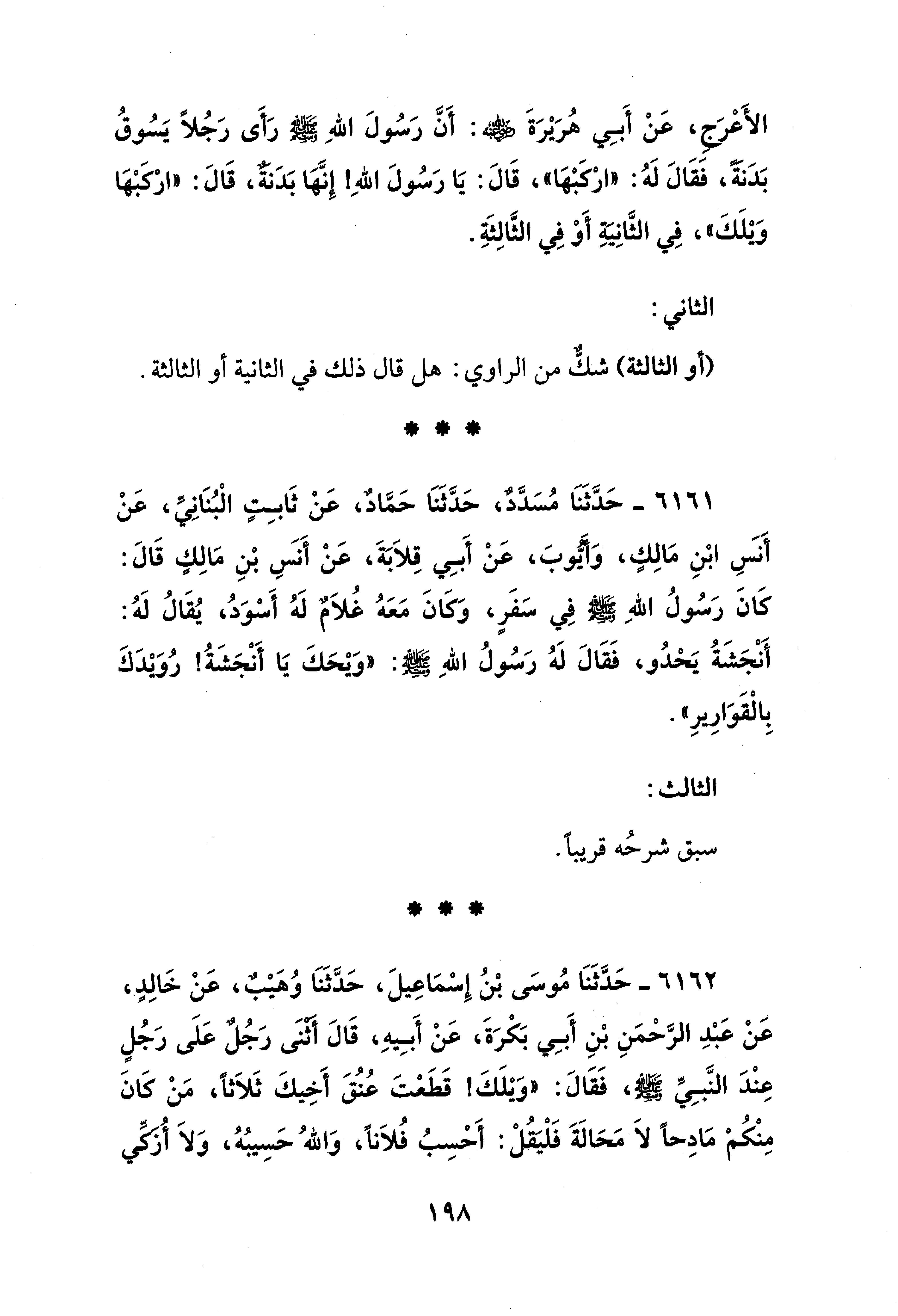 6161 - حَدَّثَنَا مُسَدَّدٌ، حَدَّثَنَا حَمَّادٌ، عَنْ ثَابِتٍ الْبُنَانِيِّ، عَنْ أَنَسِ بْنِ مَالِكٍ، وَأَيُّوبَ، عَنْ أَبِي قِلاَبَةَ، عَنْ أَنَسِ بْنِ مَالِكٍ قَالَ: كَانَ رَسُولُ اللهِ - صلى الله عليه وسلم - فِي سَفَرٍ، وَكَانَ مَعَهُ غُلاَمٌ لَهُ أَسْوَدُ، يُقَالُ لَهُ: أَنْجَشَةُ يَحْدُو، فَقَالَ لَهُ رَسُولُ اللهِ - صلى الله عليه وسلم -: "وَيْحَكَ يَا أَنْجَشَةُ! رُوَيْدَكَ بِالْقَوَارِيرِ".