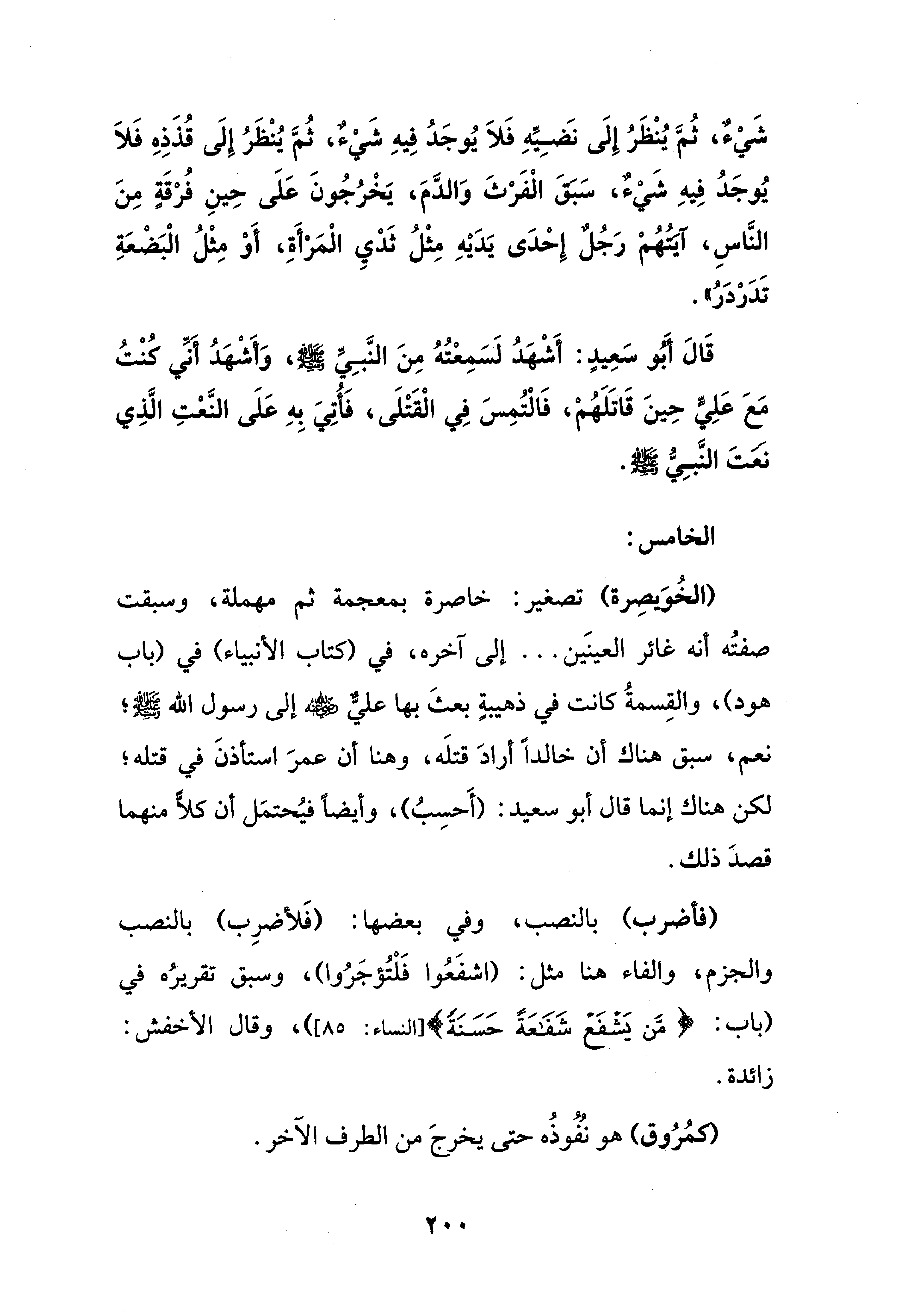قَالَ أَبُو سَعِيدٍ: أَشْهَدُ لَسَمِعْتُهُ مِنَ النَّبِيِّ - صلى الله عليه وسلم -، وَأَشْهَدُ أَنِّي كُنْتُ مَعَ عَلِيٍّ حِينَ قَاتَلَهُمْ، فَالْتُمِسَ فِي الْقَتْلَى، فَأُتِيَ بِهِ عَلَى النَّعْتِ الَّذِي نَعَتَ النَّبِيُّ - صلى الله عليه وسلم -.