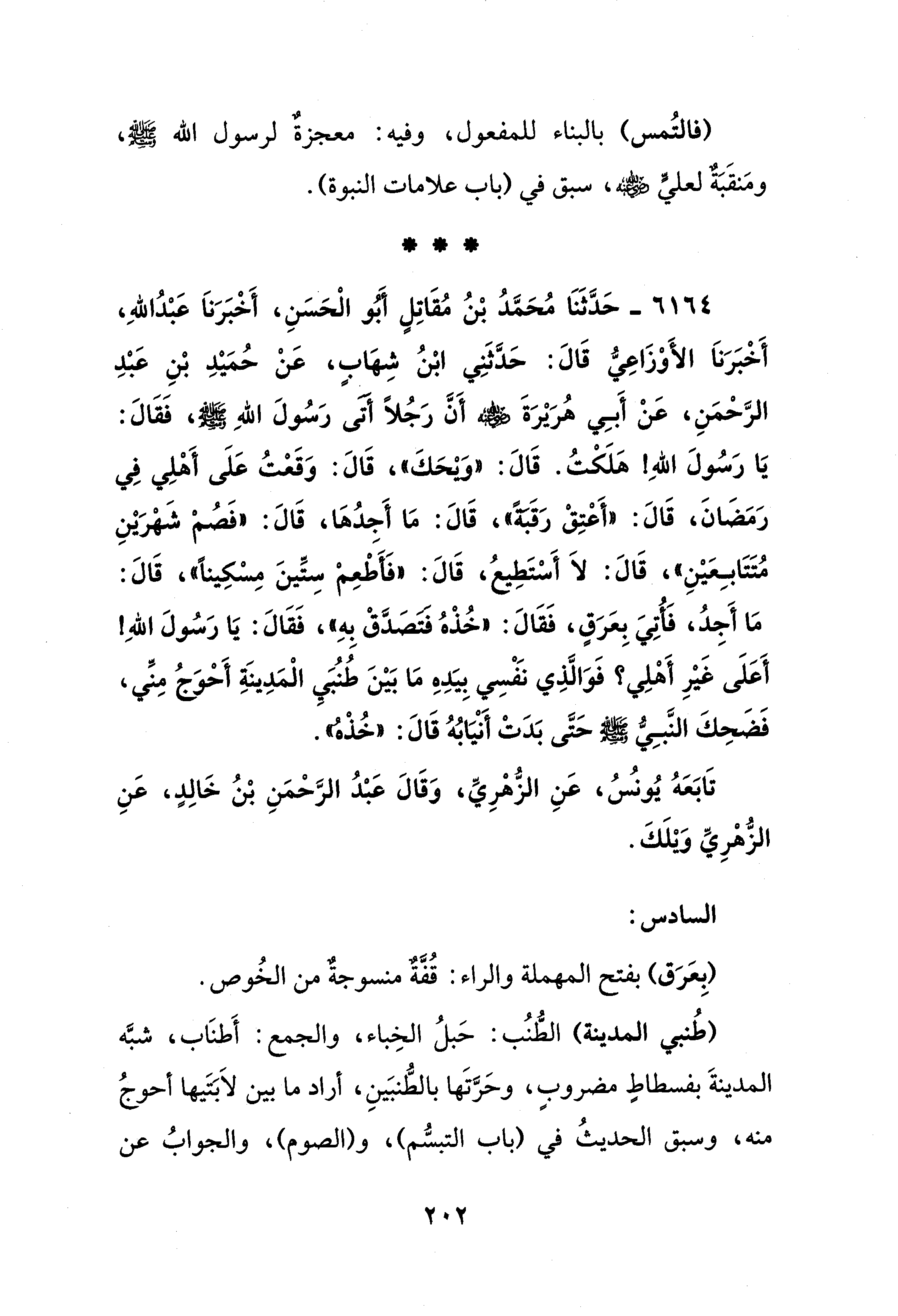 6164 - حَدَّثَنَا مُحَمَّدُ بْنُ مُقَاتِلٍ أَبُو الْحَسَنِ، أَخْبَرَنَا عَبْدُ اللهِ، أَخْبَرَنَا الأَوْزَاعِيُّ قَالَ: حَدَّثَنِي ابْنُ شِهَابٍ، عَنْ حُمَيْدِ بْنِ عَبْدِ الرَّحْمَنِ، عَنْ أَبِي هُرَيْرَةَ - رضي الله عنه - أَنَّ رَجُلًا أَتَى رَسُولَ اللهِ - صلى الله عليه وسلم -، فَقَالَ: يَا رَسُولَ اللهِ! هَلَكْتُ. قَالَ: "وَيْحَكَ"، قَالَ: وَقَعْتُ عَلَى أَهْلِي فِي رَمَضَانَ، قَالَ: "أَعْتِقْ رَقَبَةً"، قَالَ: مَا أَجِدُهَا، قَالَ: "فَصُمْ شَهْرَيْنِ مُتَتَابِعَيْنِ"، قَالَ: لَا أَسْتَطِيعُ، قَالَ: "فَأَطْعِمْ سِتِّينَ مِسْكِينًا"، قَالَ: مَا أَجِدُ، فَأُتِيَ بِعَرَقٍ، فَقَالَ: "خُذْهُ فَتَصَدَّقْ بِهِ"، فَقَالَ: يَا رَسُولَ اللهِ! أَعَلَى غَيْرِ أَهْلِي؟ فَوَالَّذِي نَفْسِي بِيَدِهِ مَا بَيْنَ طُنُبَيِ الْمَدِينَةِ أَحْوَجُ مِنِّي، فَضَحِكَ النَّبِيُّ - صلى الله عليه وسلم - حَتَّى بَدَتْ أَنْيَابُهُ قَالَ: "خُذْهُ".
