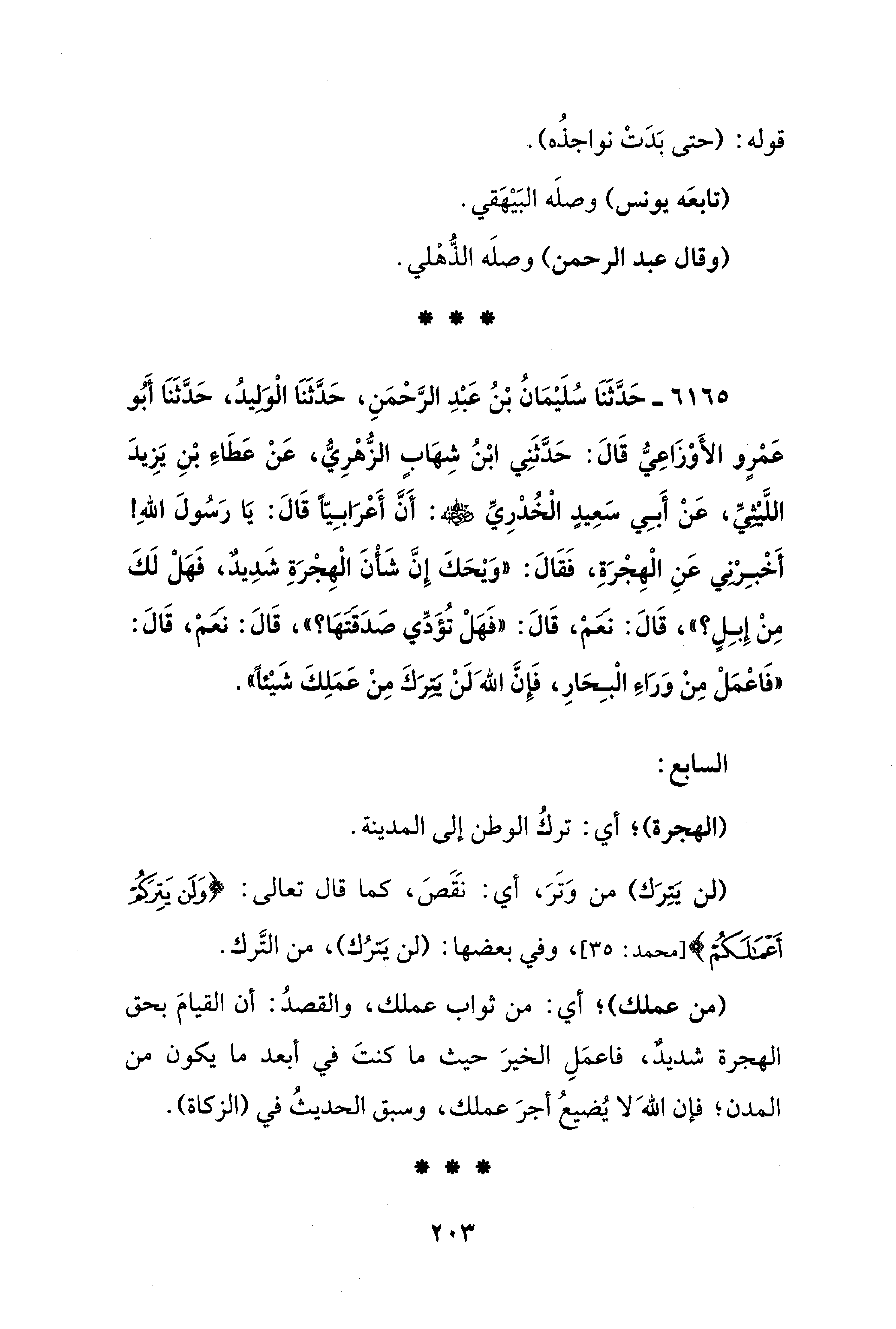 6165 - حَدَّثَنَا سُلَيْمَانُ بْنُ عَبْدِ الرَّحْمَنِ، حَدَّثَنَا الْوَلِيدُ، حَدَّثَنَا أَبُو عَمْرٍو الأَوْزَاعِيُّ قَالَ: حَدَّثَنِي ابْنُ شِهَابٍ الزُّهْرِيُّ، عَنْ عَطَاءِ بْنِ يَزِيدَ اللَّيْثِيِّ، عَنْ أَبِي سَعِيدٍ الْخُدْرِيِّ - رضي الله عنه -: أَنَّ أَعْرَابِيًّا قَالَ: يَا رَسُولَ اللهِ! أَخْبِرْنِي عَنِ الْهِجْرَةِ، فَقَالَ: "وَيْحَكَ إِنَّ شَأْنَ الْهِجْرَةِ شَدِيدٌ، فَهَلْ لَكَ مِنْ إِبِلٍ؟ "، قَالَ: نَعَمْ، قَالَ: "فَهَلْ تُؤَدِّي صَدَقَتَهَا؟ "، قَالَ: نَعَمْ، قَالَ: "فَاعْمَلْ مِنْ وَرَاءِ الْبِحَارِ، فَإِنَّ اللهَ لَنْ يَتِرَكَ مِنْ عَمَلِكَ شَيْئًا".