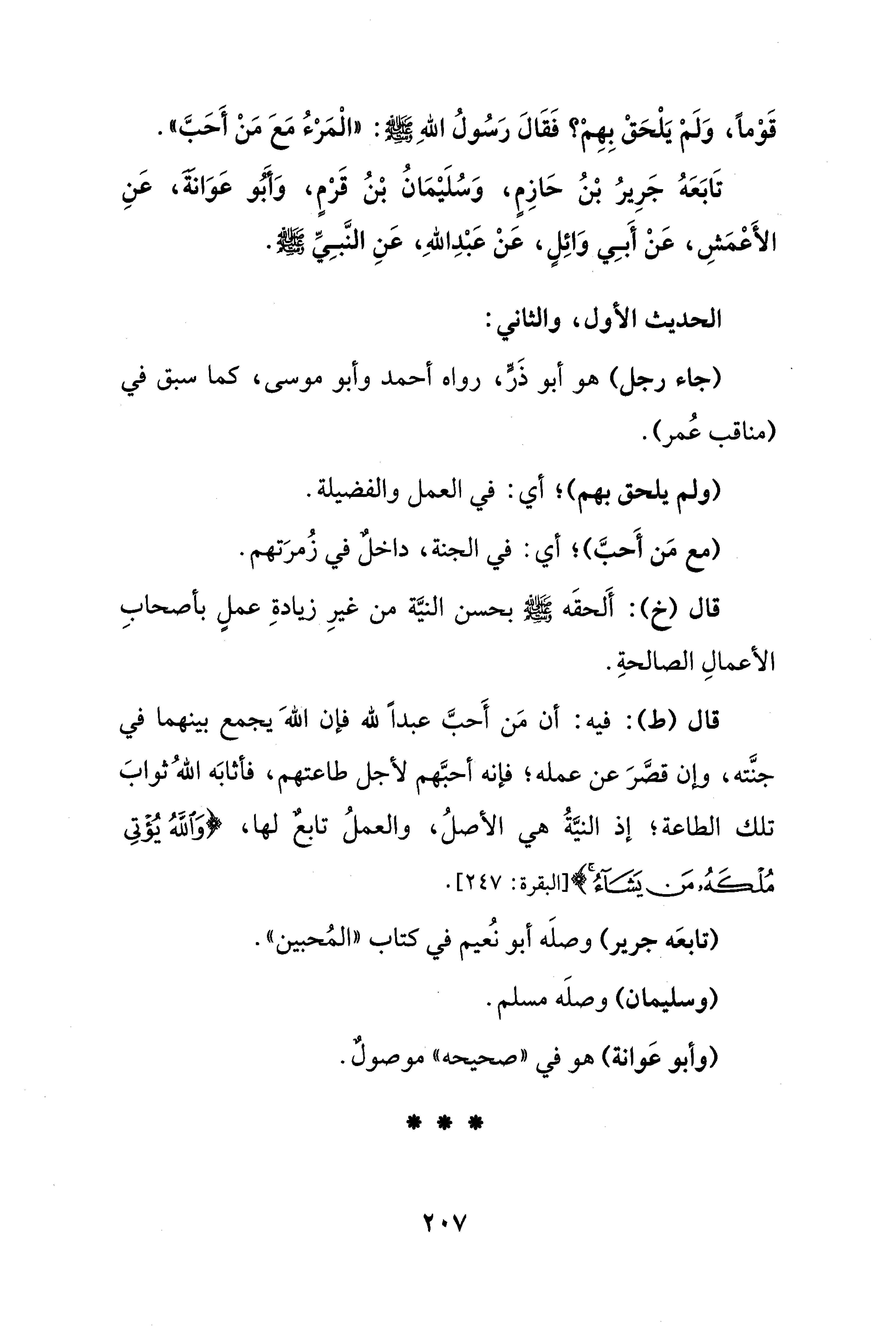قال (ط): فيه: أن مَن أَحبَّ عبدًا لله فإن اللهَ يجمع بينهما في جنَّته، وإن قصَّرَ عن عمله؛ فإنه أحبَّهم لأجل طاعتهم، فأثابَه اللهُ ثوابَ تلك الطاعة؛ إذ النيَّةُ هي الأصلُ، والعملُ تابعٌ لها، {وَاللَّهُ يُؤْتِي مُلْكَهُ مَنْ يَشَاءُ} [البقرة: 247].