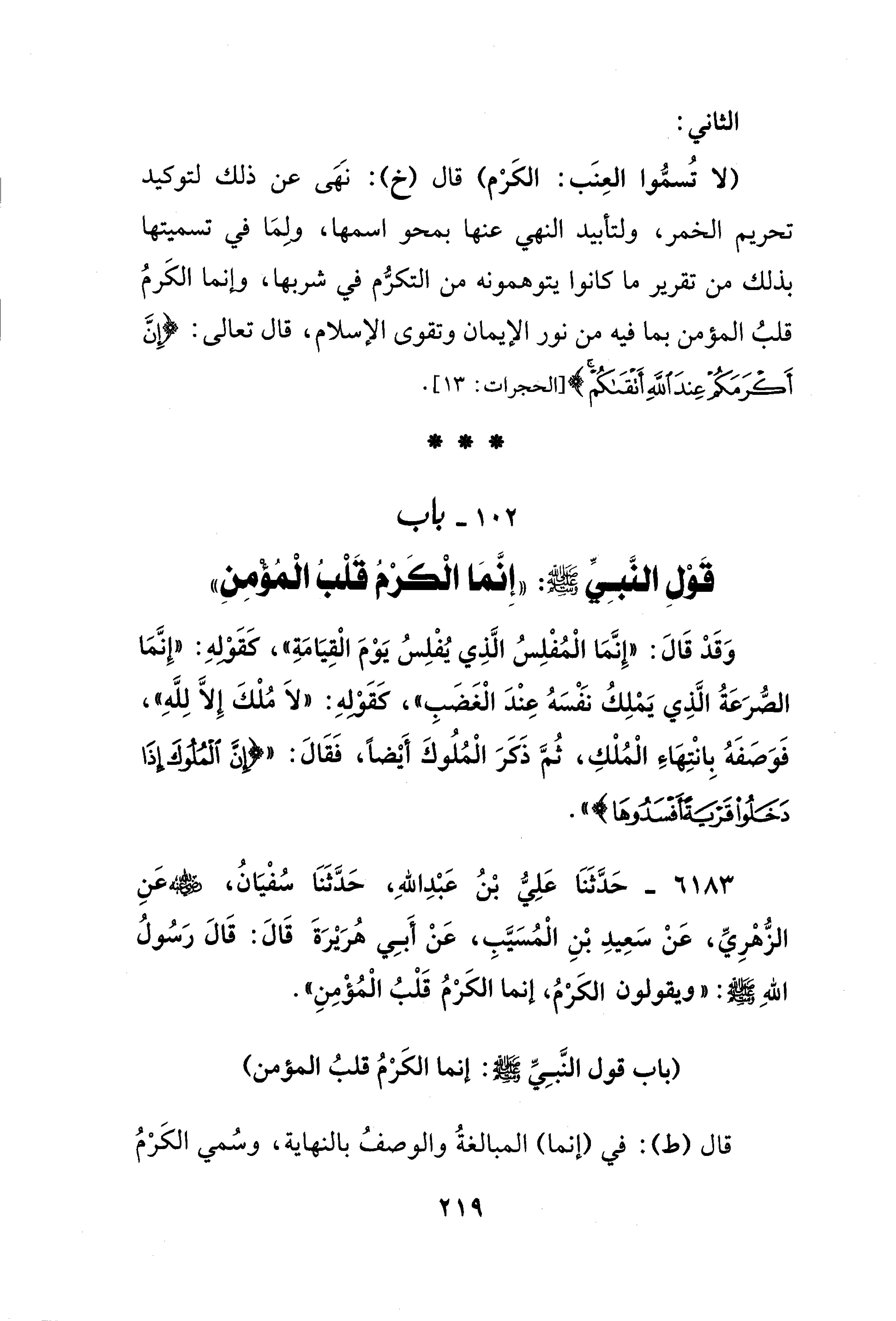 (لا تُسمُّوا العِنَب: الكَرْم) قال (خ): نَهَى عن ذلك لتوكيد تحريم الخمر، ولتأبيد النهي عنها بمحو اسمها، ولِمَا في تسميتها بذلك من تقرير ما كانوا يتوهمونه من التكرُّم في شربها، وإنما الكَرمُ قلبُ المؤمن بما فيه من نور الإيمان وتقوى الإسلام، قال تعالى: {إِنَّ أَكْرَمَكُمْ عِنْدَ اللَّهِ أَتْقَاكُمْ} [الحجرات: 13].