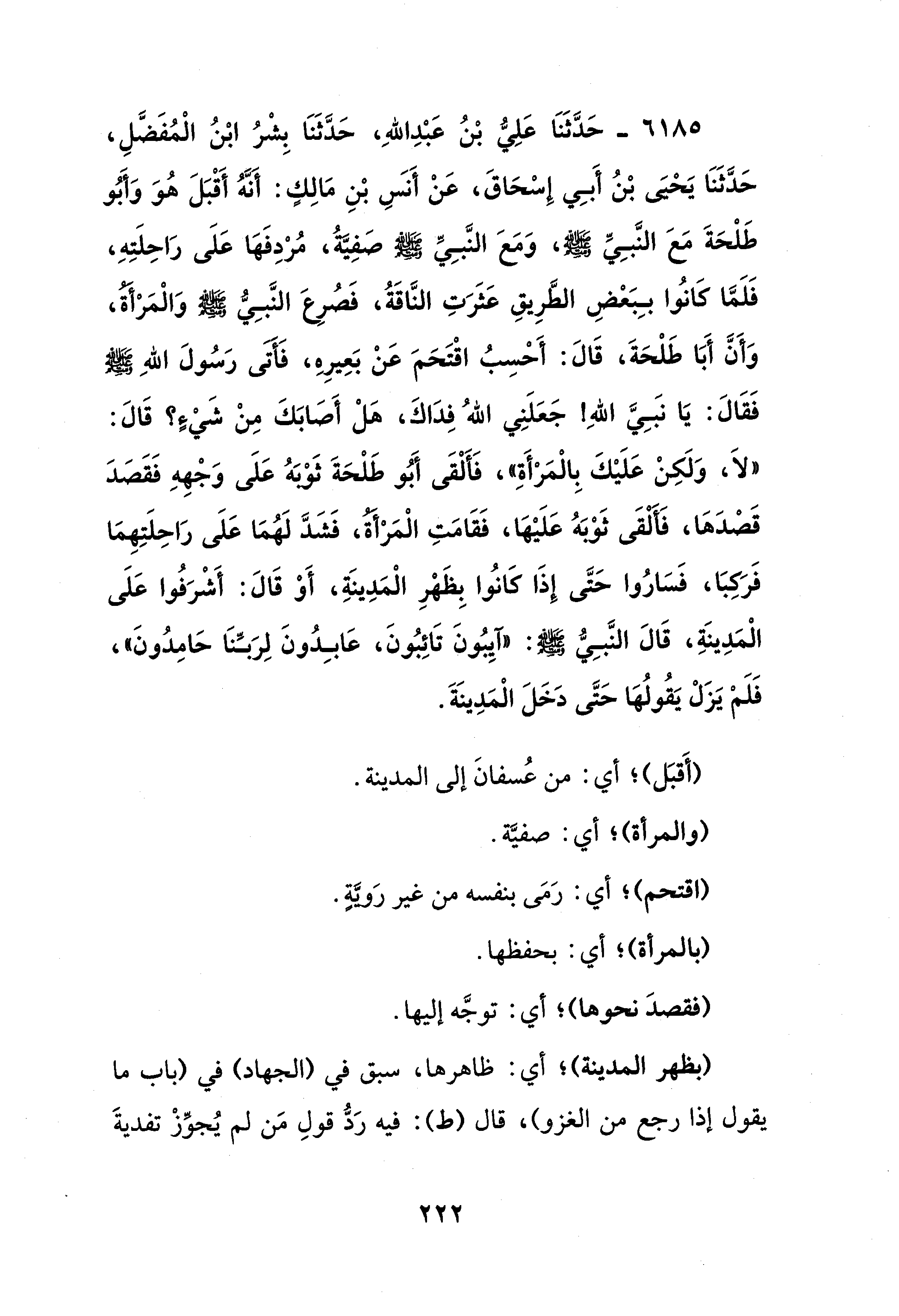 6185 - حَدَّثَنَا عَلِيُّ بْنُ عَبْدِ اللهِ، حَدَّثَنَا بِشْرُ ابْنُ الْمُفَضَّلِ، حَدَّثَنَا يَحْيَى بْنُ أَبِي إِسْحَاقَ، عَنْ أَنس بْنِ مَالِكٍ: أَنَّهُ أَقْبَلَ هُوَ وَأَبُو طَلْحَةَ مَعَ النَّبِيِّ - صلى الله عليه وسلم -، وَمَعَ النَّبِيِّ - صلى الله عليه وسلم - صَفِيَّةُ، مُرْدِفَهَا عَلَى رَاحِلَتِهِ، فَلَمَّا كَانُوا بِبَعْضِ الطَّرِيقِ عَثَرَتِ النَّاقَةُ، فَصُرِعَ النَّبِيُّ - صلى الله عليه وسلم - وَالْمَرْأَةُ، وَأَنَّ أَبَا طَلْحَةَ، قَالَ: أَحْسِبُ اقْتَحَمَ عَنْ بَعِيرِهِ، فَأَتَى رَسُولَ اللهِ - صلى الله عليه وسلم - فَقَالَ: يَا نبَيَّ اللهِ! جَعَلَنِي اللهُ فِدَاكَ، هَلْ أَصَابَكَ مِنْ شَيْء؟ قَالَ: "لَا، وَلَكِنْ عَلَيْكَ بِالْمَرْأَةِ"، فَأَلْقَى أبُو طَلْحَةَ ثَوْبَهُ عَلَى وَجْهِهِ فَقَصَدَ قَصْدَهَا، فَأَلْقَى ثَوْبَهُ عَلَيْهَا، فَقَامَتِ الْمَرْأَهُ، فَشَدَّ لَهُمَا عَلَى رَاحِلَتِهِمَا فَرَكبَا، فَسَارُوا حَتَّى إِذَا كَانُوا بِظَهْرِ الْمَدِينَةِ، أَوْ قَالَ: أَشْرَفُوا عَلَى الْمَدِينَةِ، قَالَ النَّبِيُّ - صلى الله عليه وسلم -: "آيِبُونَ تَائِبُونَ، عَابِدُونَ لِرَبِّنَا حَامِدُونَ"، فَلَمْ يَزَلْ يَقُولُهَا حَتَّى دَخَلَ الْمَدِينَةَ.
