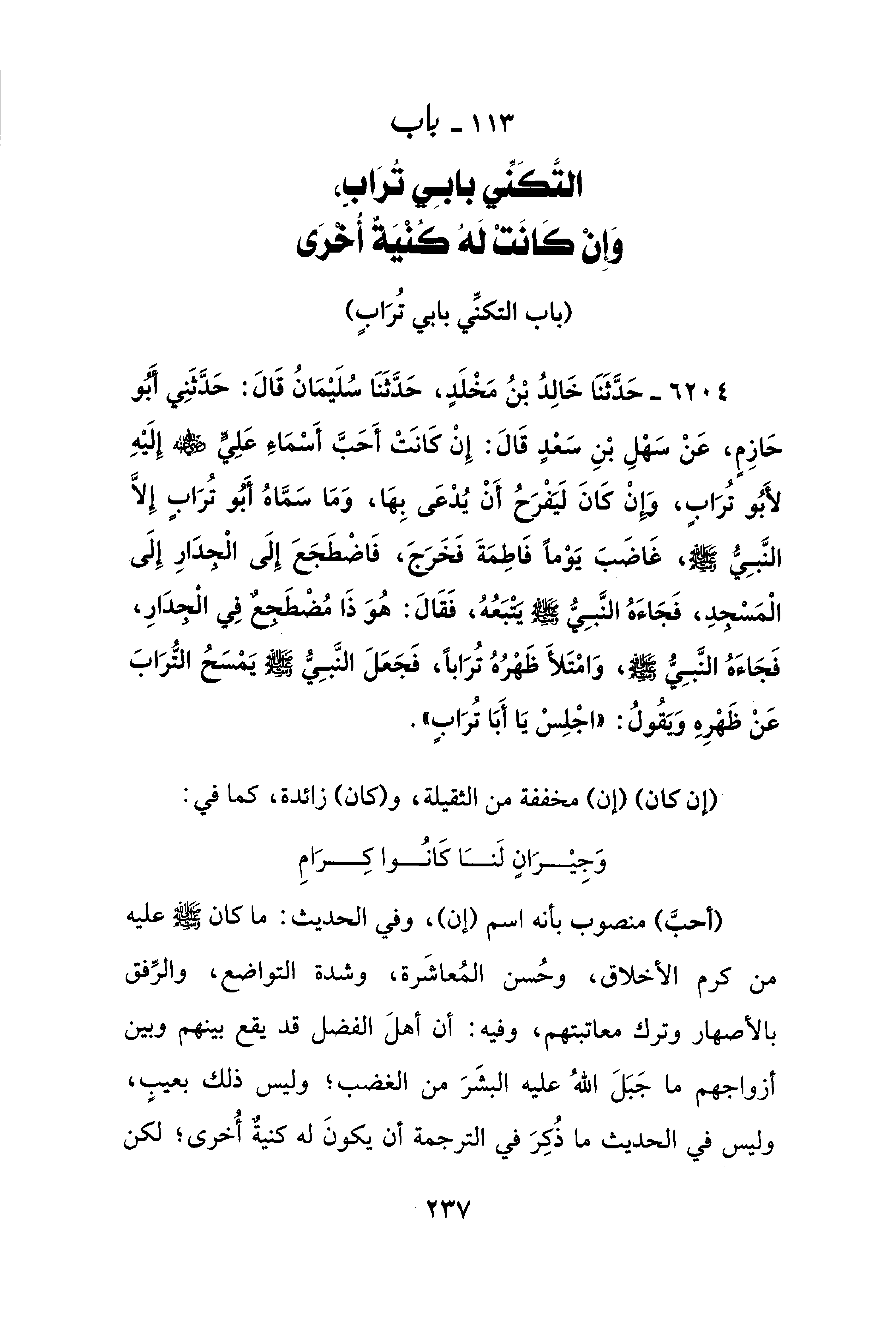 6204 - حَدَّثَنَا خَالِدُ بْنُ مَخْلَدٍ، حَدَّثَنَا سُلَيْمَانُ قَالَ: حَدَّثَنِي أَبُو حَازِمٍ، عَنْ سَهْلِ بْنِ سَعْدٍ قَالَ: إِنْ كَانَتْ أَحَبَّ أَسْمَاءَ عَلِيٍّ - رضي الله عنه - إِلَيْهِ لأَبُو تُرَابٍ، وَإِنْ كَانَ لَيَفْرَحُ أَنْ يُدْعَى بِهَا، وَمَا سَمَّاهُ أَبُو تُرَابٍ إِلَّا النَّبِيُّ - صلى الله عليه وسلم -، غَاضَبَ يَوْمًا فَاطِمَةَ فَخَرَجَ، فَاضْطَجَعَ إِلَى الْجدَارِ إِلَى الْمَسْجدِ، فَجَاءَهُ النَّبِيُّ - صلى الله عليه وسلم - يَتْبَعُهُ، فَقَالَ: هُوَ ذَا مُضْطَجعٌ فِي الْجدَارِ، فَجَاءَهُ النَّبِيُّ - صلى الله عليه وسلم -، وَامْتَلأَ ظَهْرُهُ تُرَابًا، فَجَعَلَ النَّبِيُّ - صلى الله عليه وسلم - يَمْسَحُ التُّرَابَ عَنْ ظَهْرِهِ وَيَقُولُ: "اجْلِسْ يَا أَبَا تُرَابٍ".