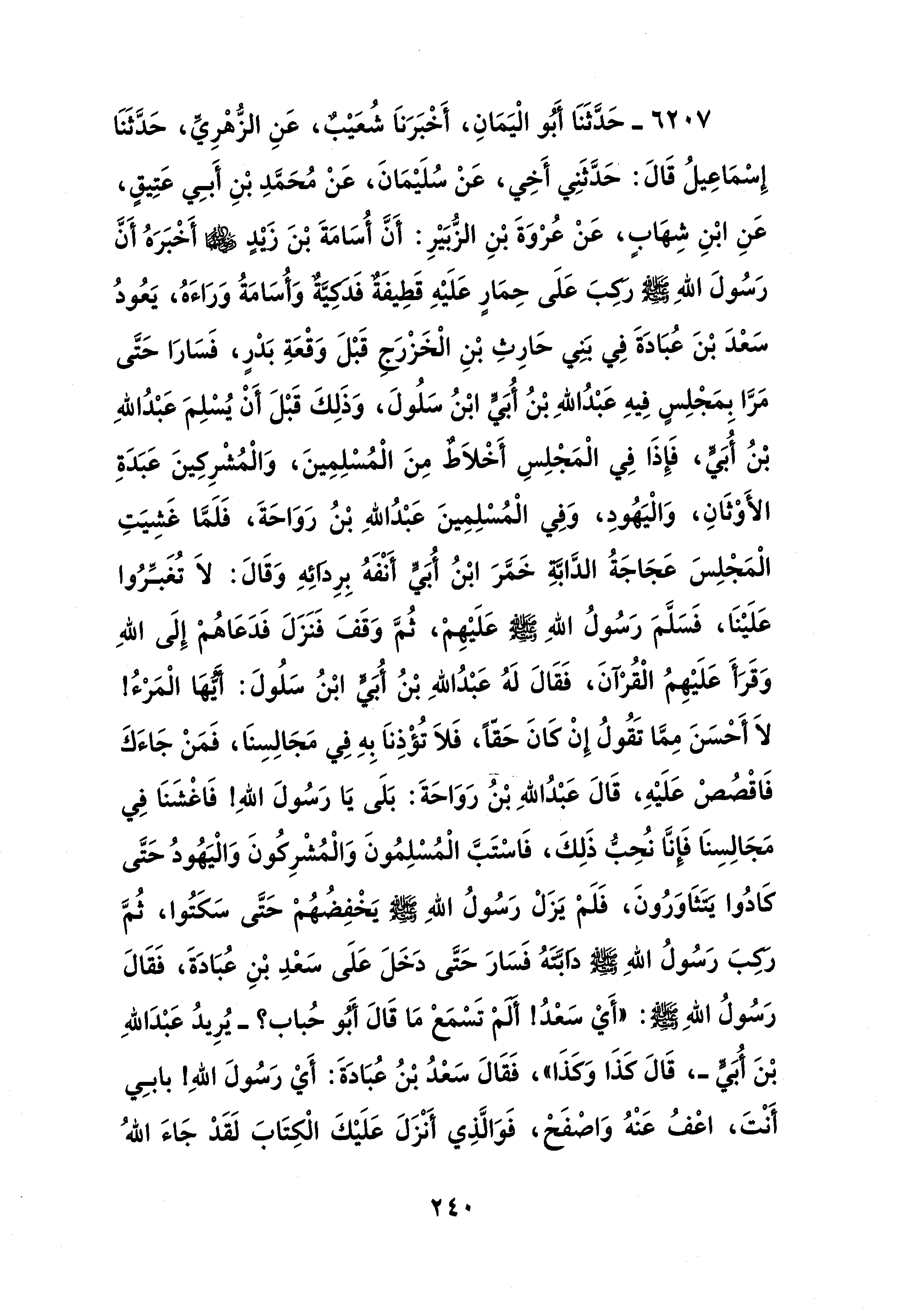 6207 - حَدَّثَنَا أَبُو الْيَمَانِ، أَخْبَرَنَا شُعَيْبٌ، عَنِ الزُّهْرِيِّ، حَدَّثَنَا إِسْمَاعِيلُ قَالَ: حَدَّثَنِي أَخِي، عَنْ سُلَيْمَانَ، عَنْ مُحَمَّدِ بْنِ أَبِي عَتِيقٍ، عَنِ ابْنِ شِهَابٍ، عَنْ عُرْوَةَ بْنِ الزُّبَيْرِ: أَنَّ أُسَامَةَ بْنَ زَيْدٍ - رضي الله عنهما - أَخْبَرَهُ أَنَّ رَسُولَ اللهِ - صلى الله عليه وسلم - رَكِبَ عَلَى حِمَارٍ عَلَيْهِ قَطِيفَةٌ فَدَكيَّةٌ وَأُسَامَةُ وَرَاءَهُ، يَعُودُ سَعْدَ بْنَ عُبَادَةَ فِي بَنِي حَارِثِ بْنِ الْخَزْرجَ قَبْلَ وَقْعَةِ بَدْرٍ، فَسَارَا حَتَّى مَرَّا بِمَجْلِسٍ فِيهِ عَبْدُ اللهِ بْنُ أبُيٍّ ابْنُ سَلُولَ، وَذَلِكَ قَبْلَ أَنْ يُسْلِمَ عَبْدُ اللهِ بْنُ أُبَيٍّ، فَإِذَا فِي الْمَجْلِسِ أَخْلاَطٌ مِنَ الْمُسْلِمِينَ، وَالْمُشْرِكِينَ عَبَدَةِ الأَوْثَانِ، وَالْيَهُودِ، وَفِي الْمُسْلِمِينَ عَبْدُ اللهِ بْنُ رَوَاحَةَ، فَلَمَّا غَشِيَتِ الْمَجْلِسَ عَجَاجَةُ الدَّابَّةِ خَمَّرَ ابْنُ أُبَيِّ أَنْفَهُ بِرِدَائِهِ وَقَالَ: لَا تُغَبِّرُوا عَلَيْنَا، فَسَلَّمَ رَسُولُ اللهِ - صلى الله عليه وسلم - عَلَيْهِمْ، ثُمَّ وَقَفَ فَنَزَلَ فَدَعَاهُمْ إِلَى اللهِ وَقَرَأَ عَلَيْهِمُ الْقُرْآنَ، فَقَالَ لَهُ عَبْدُ اللهِ بْنُ أُبَيٍّ بْنُ سَلُولَ: أَيُّهَا الْمَرْءُ! لَا أَحْسَنَ مِمَّا تَقُولُ إِنْ كَانَ حَقًّا، فَلَا تُؤْذِنَا بِهِ فِي مَجَالِسِنَا، فَمَنْ جَاءَكَ فَاقْصُصْ عَلَيْهِ، قَالَ عَبْدُ اللهِ بْنُ رَوَاحَةَ: بَلَى يَا رَسُولَ اللهِ! فَاغْشَنَا فِي مَجَالِسِنَا فَإِنَّا نُحِبُّ ذَلِكَ، فَاسْتَبَّ المُسْلِمُونَ وَالْمُشْرِكُونَ وَالْيَهُودُ حَتَّى كَادُوا يتَثَاوَرُونَ، فَلَمْ يَزَلْ رَسُولُ اللهِ - صلى الله عليه وسلم - يَخْفِضُهُمْ حَتَّى سَكَتُوا، ثُمَّ رَكِبَ رَسُولُ اللهِ - صلى الله عليه وسلم - دَابَّتَهُ فَسَارَ حَتَّى دَخَلَ عَلَى سَعْدِ بْنِ عُبَادَةَ، فَقَالَ رَسُولُ اللهِ - صلى الله عليه وسلم -: "أَيْ سَعْدُ! أَلَمْ تَسْمَعْ مَا قَالَ أَبُو حُباب؟ -يُرِيدُ عَبْدَ اللهِ بْنَ أُبَيٍّ-، قَالَ كَذَا وَكَذَا"، فَقَالَ سَعْدُ بْنُ عُبَادَةَ: أَيْ رَسُولَ اللهِ! بأبِي أَنْتَ، اعْفُ عَنْهُ وَاصْفَحْ، فَوَالَّذِي أَنْزَلَ عَلَيْكَ الْكِتَابَ لَقَدْ جَاءَ اللهُ