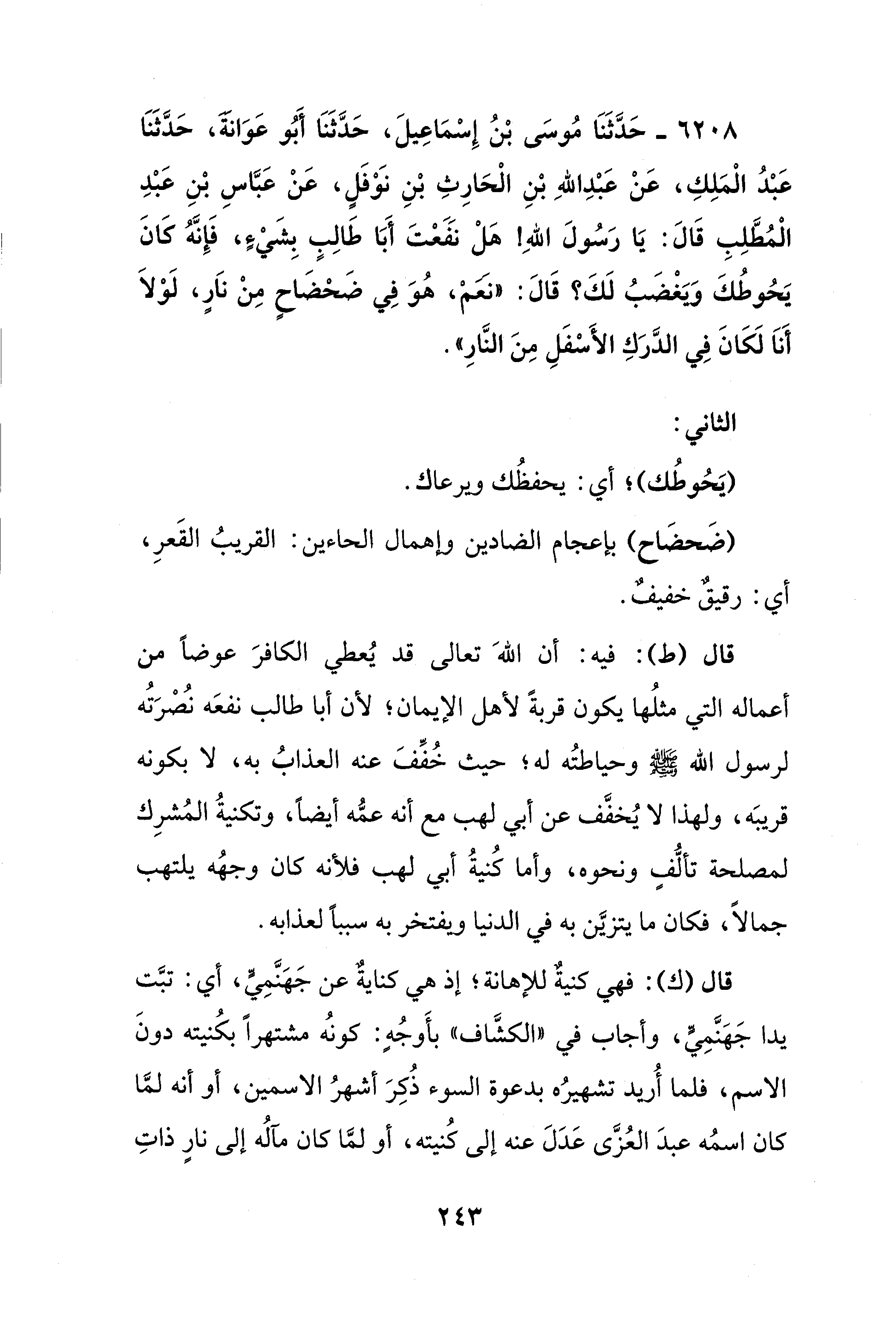 6208 - حَدَّثَنَا مُوسَى بْنُ إِسْمَاعِيلَ، حَدَّثَنَا أَبُو عَوَانَة، حَدَّثَنَا عَبْدُ الْمَلِكِ، عَنْ عَبْدِ اللهِ بْنِ الْحَارِثِ بْنِ نوفَلٍ، عَنْ عَبَّاسِ بْنِ عَبْدِ الْمُطَّلِبِ قَالَ: يَا رَسُولَ اللهِ! هَلْ نَفَعْتَ أَبَا طَالِبٍ بِشَيْءٍ، فَإِنَّهُ كَانَ يَحُوطُكَ وَيَغْضَبُ لَكَ؟ قَالَ: "نَعَمْ، هُوَ فِي ضَحْضَاحٍ مِنْ نَارٍ، لَوْلَا أَنَا لَكَانَ فِي الدَّرَكِ الأَسفَلِ مِنَ النَّارِ".