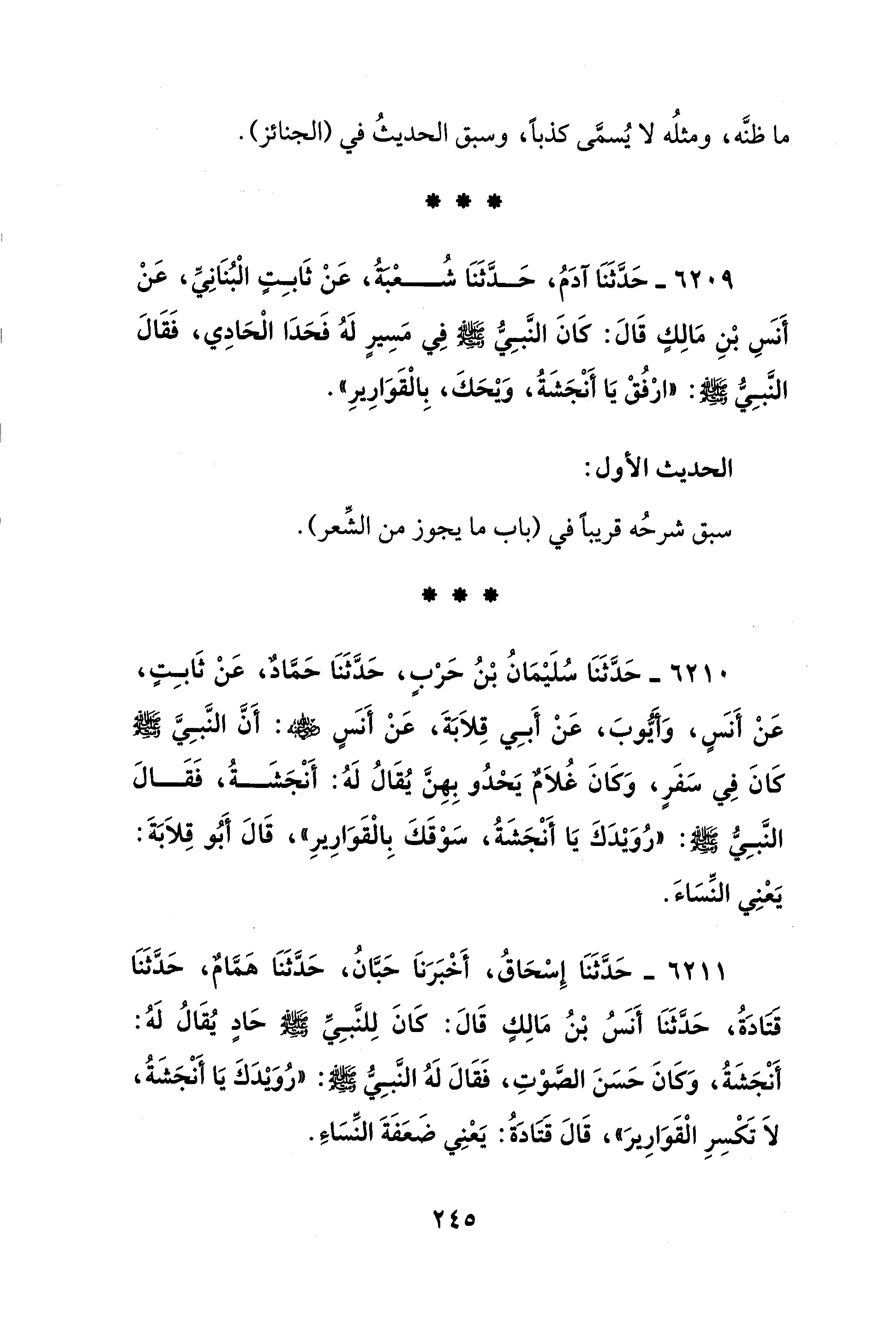 6210 - حَدَّثَنَا سُلَيْمَانُ بْنُ حَرْبٍ، حَدَّثَنَا حَمَّادٌ، عَنْ ثَابِتٍ، عَنْ أَنسٍ، وَأَيُّوبَ، عَنْ أَبِي قِلاَبةَ، عَنْ أَنسٍ - رضي الله عنه -: أَنَّ النَّبِيَّ - صلى الله عليه وسلم - كَانَ فِي سَفَرٍ، وَكَانَ غُلاَمٌ يَحْدُو بِهِنَّ يُقَالُ لَهُ: أَنْجَشَةُ، فَقَالَ النَّبِيُّ - صلى الله عليه وسلم -: "رُويْدَكَ يَا أَنْجَشَةُ، سَوْقَكَ بِالْقَوَارِيرِ"، قَالَ أَبُو قِلاَبَةَ: يَعْنِي النِّسَاءَ.