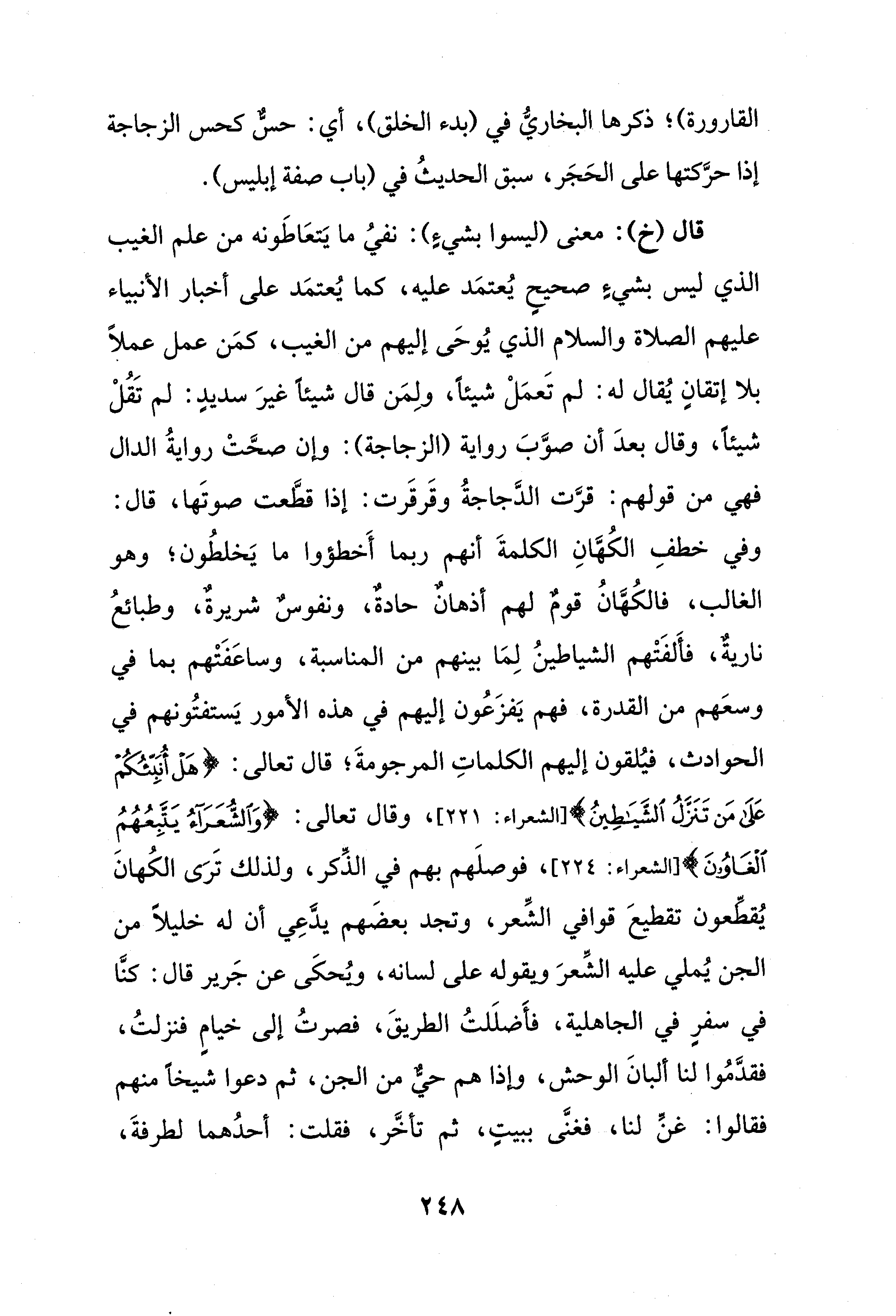 قال (خ): معنى (ليسوا بشيءٍ): نفيُ ما يَتعَاطَونه من علم الغيب الذي ليس بشيءٍ صحيحٍ يُعتمَد عليه، كما يُعتمَد على أخبار الأنبياء عليهم الصلاة والسلام الذي يُوحَى إليهم من الغيب، كمَن عمل عملًا بلا إتقانٍ يُقال له: لم تَعمَلْ شيئًا، ولِمَن قال شيئًا غيرَ سديدٍ: لم تَقُلْ شيئًا، وقال بعدَ أن صوَّبَ رواية (الزجاجة): وإن صحَّتْ روايةُ الدال فهي من قولهم: قرَّت الدَّجاجةُ وقَرقَرت: إذا قطَّعت صوتَها، قال: وفي خطفِ الكُهَّانِ الكلمةَ أنهم ربما أَخطؤوا ما يَخلطُون؛ وهو الغالب، فالكُهَّانُ قومٌ لهم أذهانٌ حادةٌ، ونفوسٌ شريرةٌ، وطبائعُ ناريةٌ، فأَلفَتْهم الشياطينُ لِمَا بينهم من المناسبة، وساعَفَتْهم بما في وسعَهم من القدرة، فهم يَفزَعُون إليهم في هذه الأمور يَستفتُونهم في الحوادث، فيُلقون إليهم الكلماتِ المرجومةَ؛ قال تعالى: {هَلْ أُنَبِّئُكُمْ عَلَى مَنْ تَنَزَّلُ الشَّيَاطِينُ} [الشعراء: 221]، وقال تعالى: {وَالشُّعَرَاءُ يَتَّبِعُهُمُ الْغَاوُونَ} [الشعراء: 224]، فوصلَهم بهم في الذِّكر، ولذلك تَرَى الكُهان يُقطِّعون تقطيعَ قوافي الشِّعر، وتجد بعضَهم يدَّعِي أن له خليلًا من الجن يُملي عليه الشِّعرَ ويقوله على لسانه، ويُحكَى عن جَرير قال: كنَّا في سفرٍ في الجاهلية، فأَضلَلتُ الطريقَ، فصرتُ إلى خيامٍ فنزلتُ، فقدَّمُوا لنا ألبانَ الوحش، وإذا هم حيٌّ من الجن، ثم دعوا شيخًا منهم فقالوا: غنِّ لنا، فغنَّى ببيتٍ، ثم تأخَّر، فقلت: أحدُهما لطرفةَ،