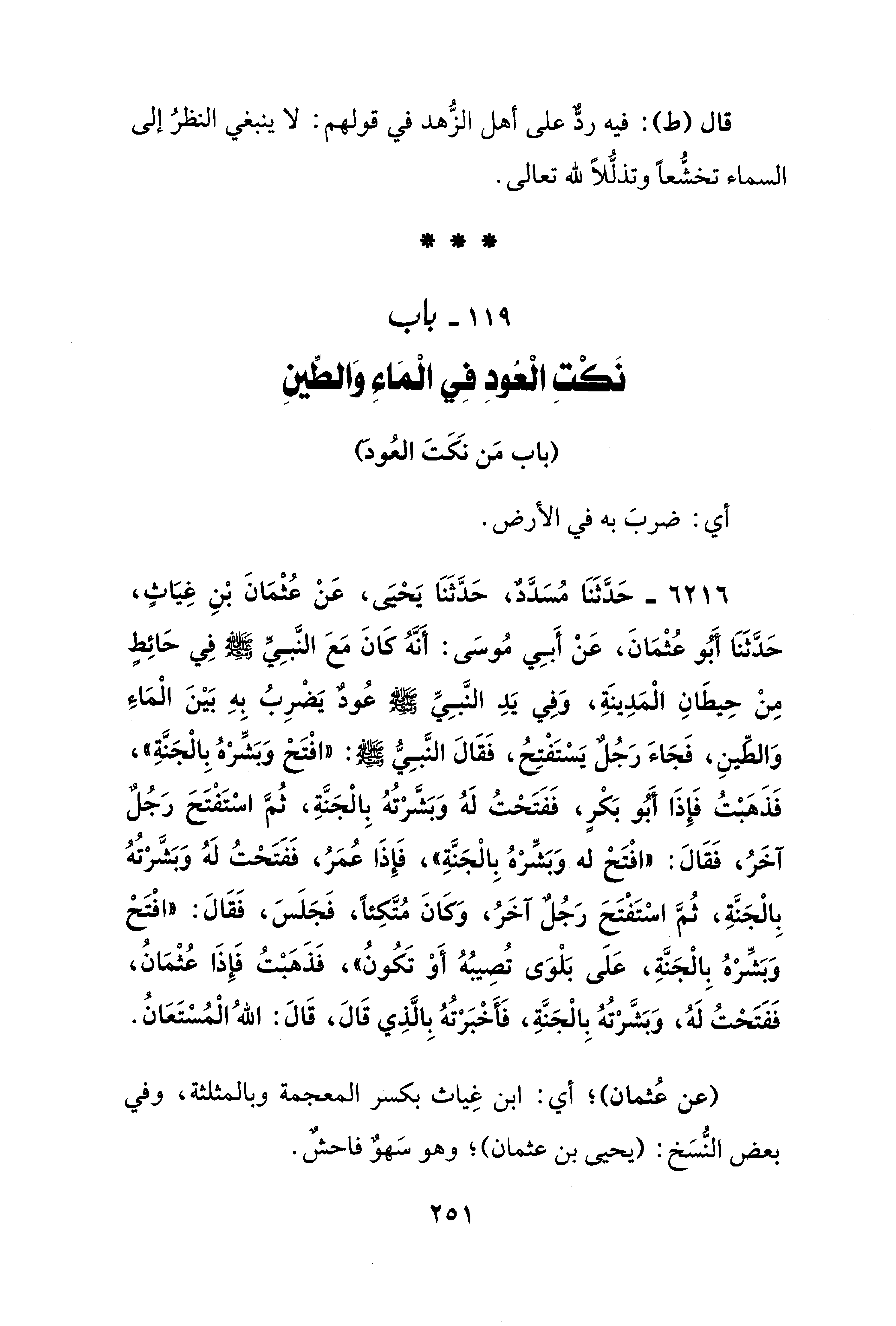 6216 - حَدَّثَنَا مُسَدَّدٌ، حَدَّثَنَا يَحْيَى، عَنْ عُثْمَانَ بْنِ غِيَاثٍ، حَدَّثَنَا أَبُو عُثْمَانَ، عَنْ أَبِي مُوسَى: أَنَّهُ كَانَ مَعَ النَّبِيِّ - صلى الله عليه وسلم - فِي حَائِطٍ مِنْ حِيطَانِ الْمَدِينَةِ، وَفِي يَدِ النَّبِيِّ - صلى الله عليه وسلم - عُودٌ يَضْرِبُ بهِ بَيْنَ الْمَاءِ وَالطينِ، فَجَاءَ رَجُلٌ يَسْتَفْتِحُ، فَقَالَ النَّبِيُّ - صلى الله عليه وسلم -: "افْتَحْ وَبَشِّرْهُ بِالْجَنَّةِ"، فَذَهَبْتُ فَإِذَا أَبُو بَكْرٍ، فَفَتَحْتُ لَهُ وَبَشَّرْتُهُ بِالْجَنَّةِ، ثُمَّ اسْتَفْتَحَ رَجُلٌ آخَرُ، فَقَالَ: "افْتَحْ له وَبَشِّرْهُ بِالْجَنَّةِ"، فَإِذَا عُمَرُ، فَفَتَحْتُ لَهُ وَبَشَّرْتُهُ بِالْجَنَّةِ، ثُمَّ اسْتَفْتَحَ رجُلٌ آخَرُ، وَكَانَ مُتَّكِئًا، فَجَلَسَ، فَقَالَ: "افْتَحْ وَبَشِّرْهُ بِالْجَنَّةِ، عَلَى بَلْوَى تُصِيبُهُ أَوْ تَكُونُ"، فَذَهَبْتُ فَإذَا عُثْمَان، فَفَتَحْتُ لَهُ، وَبَشَّرْتُهُ بِالْجَنَّةِ، فَأَخْبَرْتُهُ بِالَّذِي قَالَ، قَالَ: اللهُ الْمُسْتَعَانُ.