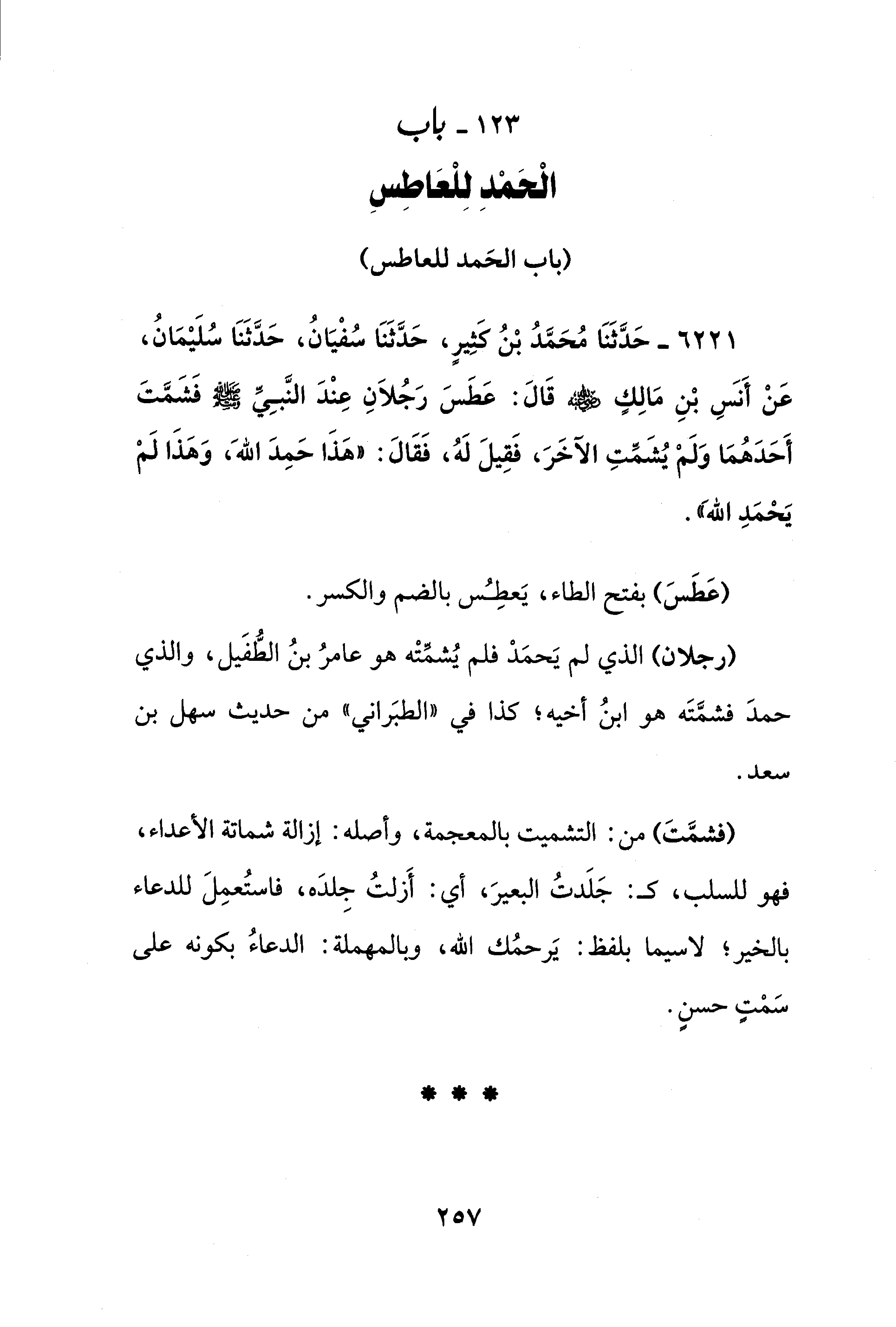 6221 - حَدَّثَنَا مُحَمَّدُ بْنُ كَثِيرٍ، حَدَّثَنَا سُفْيَانُ، حَدَّثَنَا سُلَيْمَانُ، عَنْ أَنس بْنِ مَالِكٍ - رضي الله عنه - قَالَ: عَطَسَ رَجُلاَنِ عِنْدَ النَّبِيِّ - صلى الله عليه وسلم - فَشَمَّتَ أَحَدَهُمَا وَلَمْ يُشَمِّتِ الآخَرَ، فَقِيلَ لَهُ، فَقَالَ: "هَذَا حَمِدَ اللهَ، وَهَذَا لَمْ يَحْمَدِ الله".