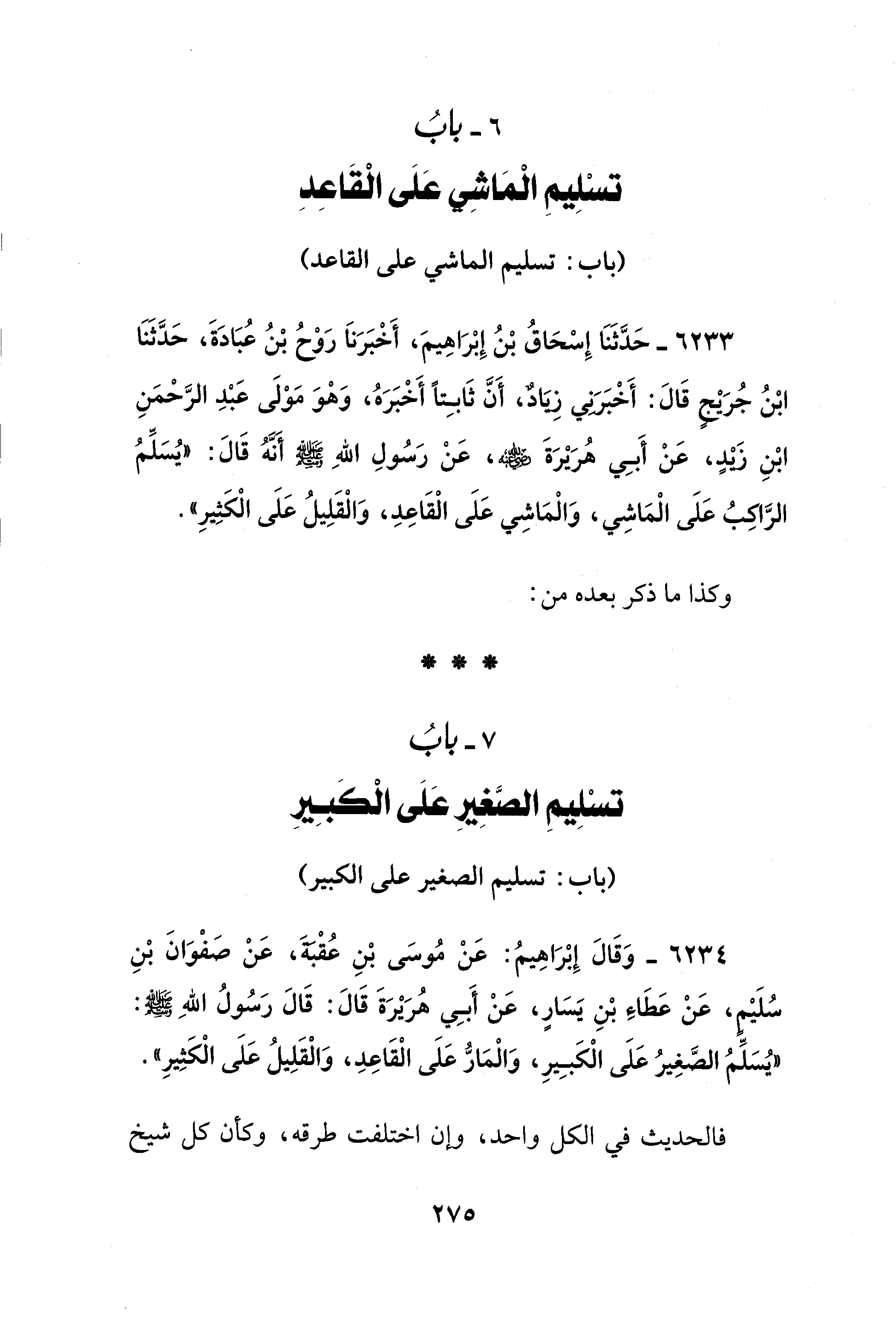 6233 - حَدَّثَنَا إِسْحَاقُ بْنُ إِبْرَاهِيمَ، أَخْبَرَنَا رَوْحُ بْنُ عُبَادَةَ، حَدَّثَنَا ابْنُ جُرَيْجٍ قَالَ: أَخْبَرَني زِيَادٌ، أَنَّ ثَابِتًا أَخْبَرَهُ، وَهْوَ مَوْلَى عَبْدِ الرَّحْمَنِ بْنِ زيدٍ، عَنْ أَبِي هُرَيْرَةَ - رضي الله عنه -، عَنْ رَسُولِ اللهِ - صلى الله عليه وسلم - أنَّهُ قَالَ: "يُسَلِّمُ الرَّاكِبُ عَلَى الْمَاشِي، وَالْمَاشِي عَلَى الْقَاعِدِ، وَالْقَلِيلُ عَلَى الْكَثِيرِ".