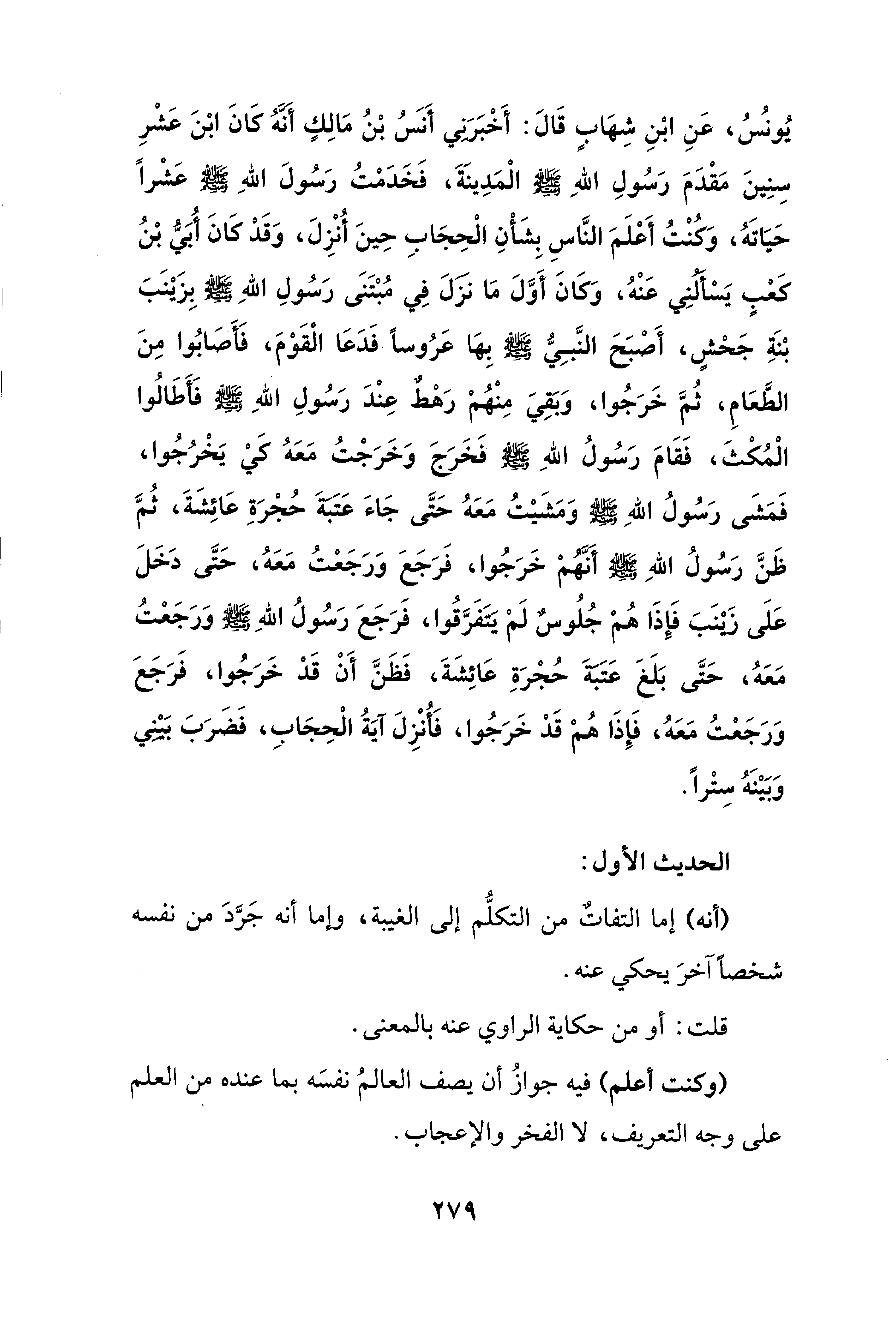 يُونُسُ، عَنِ ابْنِ شِهَابٍ قَالَ: أَخْبَرَنِي أَنسُ بْنُ مَالِكٍ أَنَّهُ كَانَ ابْنَ عَشْرِ سِنِينَ مَقْدَمَ رَسُولِ اللهِ - صلى الله عليه وسلم - الْمَدِينَةَ، فَخَدَمْتُ رَسُولَ اللهِ - صلى الله عليه وسلم - عَشْرًا حَيَاتَهُ، وَكُنْتُ أَعْلَمَ النَّاسِ بِشَأْنِ الْحِجَابِ حِينَ أُنْزِلَ، وَقَدْ كَانَ أُبَيُّ بْنُ كعْبٍ يَسْأَلُنِي عَنْهُ، وَكَانَ أَوَّلَ مَا نزَلَ فِي مُبْتَنَى رَسُولِ اللهِ - صلى الله عليه وسلم - بِزَيْنَبَ بْنَةِ جَحْشٍ، أَصْبَحَ النَّبِيُّ - صلى الله عليه وسلم - بِهَا عَرُوسًا فَدَعَا الْقَوْمَ، فَأَصَابُوا مِنَ الطَّعَامِ، ثُمَّ خَرَجُوا، وَبَقِيَ مِنْهُمْ رَهْطٌ عِنْدَ رَسُولِ اللهِ - صلى الله عليه وسلم - فَأَطَالُوا الْمُكْثَ، فَقَامَ رَسُولُ اللهِ - صلى الله عليه وسلم - فَخَرَجَ وَخَرَجْتُ مَعَهُ كَيْ يَخْرُجُوا، فَمَشَى رَسُولُ اللهِ - صلى الله عليه وسلم - وَمَشَيْتُ مَعَهُ حَتَّى جَاءَ عَتَبَةَ حُجْرَةِ عَائِشَةَ، ثُمَّ ظَنَّ رَسُولُ اللهِ - صلى الله عليه وسلم - أَنَّهُمْ خَرَجُوا، فَرَجَعَ وَرَجَعْتُ مَعَهُ، حَتَّى دَخَلَ عَلَى زينَبَ فَإِذَا هُمْ جُلُوسٌ لَمْ يَتَفَرَّقُوا، فَرَجَعَ رَسُولُ اللهِ - صلى الله عليه وسلم - وَرَجَعْتُ مَعَهُ، حَتَّى بَلَغَ عَتَبَةَ حُجْرَةِ عَائِشَةَ، فَظَنَّ أَنْ قَدْ خَرَجُوا، فَرَجَعَ وَرَجَعْتُ مَعَهُ، فَإِذَا هُمْ قَدْ خَرَجُوا، فَأُنْزِلَ آيَةُ الْحِجَابِ، فَضَرَبَ بَيْنِي وَبَيْنَهُ سِتْرًا.