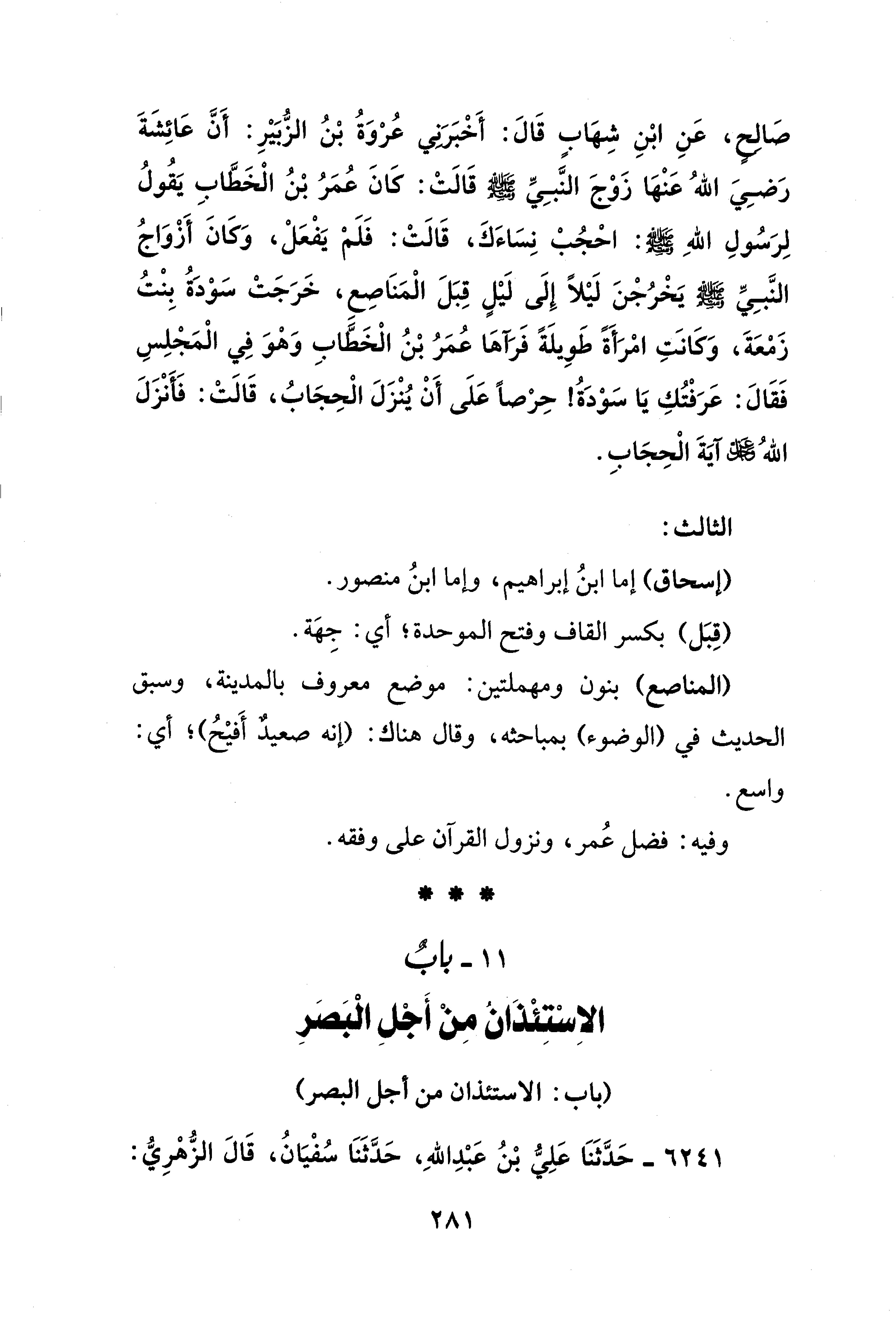 صَالِحٍ، عَنِ ابْنِ شِهَابِ قَالَ: أَخْبَرَني عُرْوَةُ بْنُ الزُّبَيْرِ: أَنَّ عَائِشَةَ رَضِيَ اللهُ عَنْهَا زَوْجَ النَّبِيِّ - صلى الله عليه وسلم - قَالَتْ: كَانَ عُمَرُ بْنُ الْخَطَّابِ يَقُولُ لِرَسُولِ اللهِ - صلى الله عليه وسلم -: احْجُبْ نِسَاءَكَ، قَالَتْ: فَلَمْ يَفْعَلْ، وَكَانَ أَزْوَاجُ النَّبِيِّ - صلى الله عليه وسلم - يَخْرُجْنَ لَيْلًا إِلَى لَيْلٍ قِبَلَ الْمَنَاصِعِ، خَرَجَتْ سَوْدَةُ بِنْتُ زَمْعَةَ، وَكَانَتِ امْرَأَةً طَوِيلَةً فَرَآهَا عُمَرُ بْنُ الْخَطَّابِ وَهْوَ فِي الْمَجْلِسِ فَقَالَ: عَرَفْتُكِ يَا سَوْدَةُ! حِرْصًا عَلَى أَنْ يُنْزَلَ الْحِجَابُ، قَالَتْ: فَأَنْزَلَ اللهُ عز وجل آيَةَ الْحِجَابِ.