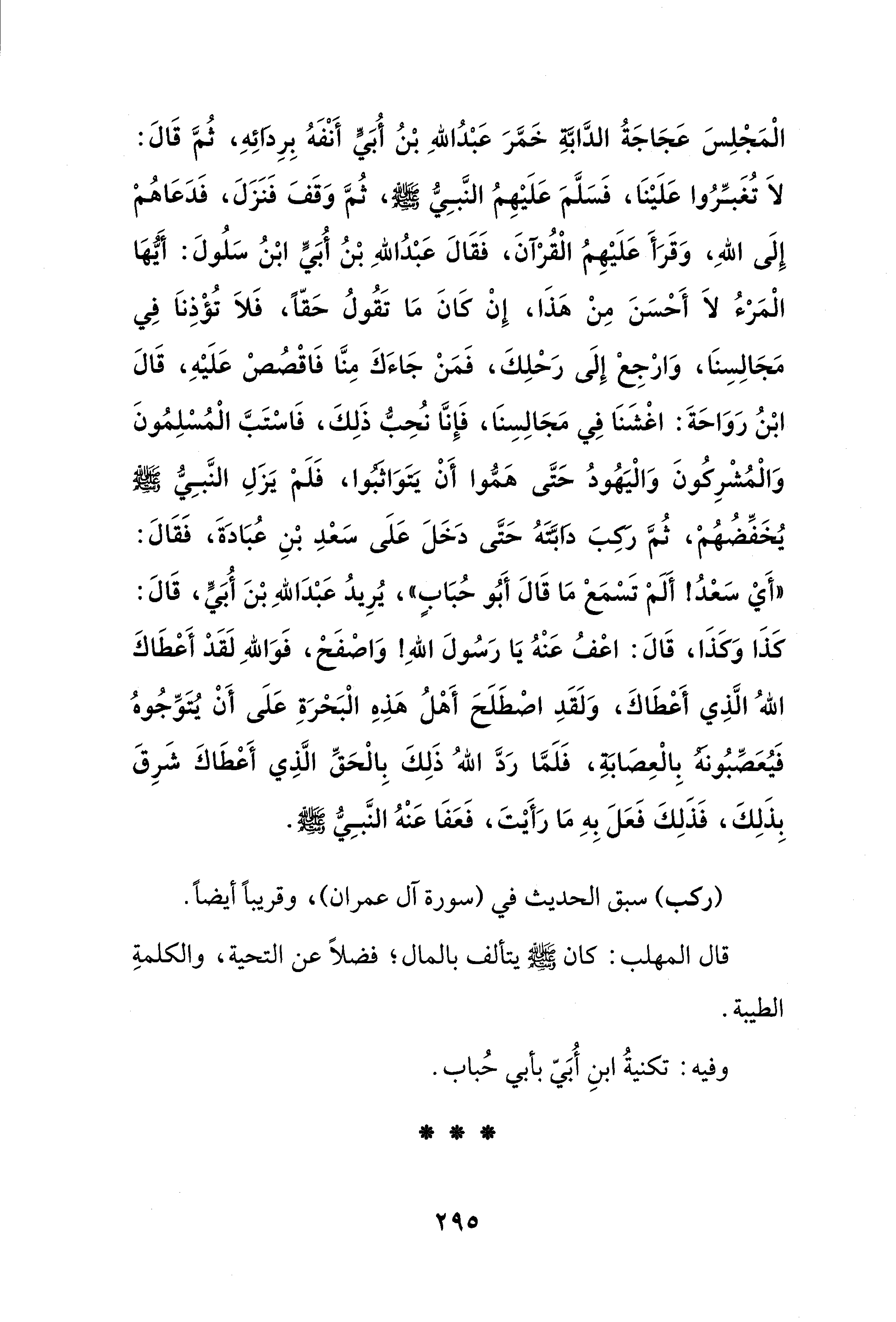 الْمَجْلِسَ عَجَاجَةُ الدَّابَّةِ خَمَّرَ عَبْدُ اللهِ بْنُ أُبَيٍّ أَنْفَهُ بِرِدَائِهِ، ثُمَّ قَالَ: لَا تُغَبِّرُوا عَلَيْنَا، فَسَلَّمَ عَلَيْهِمُ النَّبِيُّ - صلى الله عليه وسلم -، ثُمَّ وَقَفَ فَنَزَلَ، فَدَعَاهُمْ إِلَى اللهِ، وَقَرَأَ عَلَيْهِمُ الْقُرْآنَ، فَقَالَ عَبْدُ اللهِ بْنُ أُبَيٍّ بْنُ سَلُولَ: أَيُّهَا الْمَرْءُ لَا أَحْسَنَ مِنْ هَذَا، إِنْ كَانَ مَا تَقُولُ حَقًّا، فَلَا تُؤْذِنَا فِي مَجَالِسِنَا، وَارْجِعْ إِلَى رَحْلِكَ، فَمَنْ جَاءَكَ مِنَّا فَاقْصُصْ عَلَيْهِ، قَالَ ابْنُ رَوَاحَةَ: اغْشَنَا فِي مَجَالِسِنَا، فَإِنَّا نُحِبُّ ذَلِكَ، فَاسْتَبَّ الْمُسْلِمُونَ وَالْمُشْرِكُونَ وَالْيَهُودُ حَتَّى هَمُّوا أَنْ يَتَوَاثَبُوا، فَلَمْ يَزَلِ النَّبِيُّ - صلى الله عليه وسلم - يُخَفِّضُهُمْ، ثُمَّ ركبَ دابَّتَهُ حَتَّى دَخَلَ عَلَى سَعْدِ بْنِ عُبَادَةَ، فَقَالَ: "أَيْ سَعْدُ! أَلَمْ تَسْمَعْ مَا قَالَ أَبُو حُبَابٍ"، يُرِيدُ عَبْدَ اللهِ بْنَ أبُيٍّ، قَالَ: كَذَا وَكَذَا، قَالَ: اعْفُ عَنْهُ يَا رَسُولَ اللهِ! وَاصْفَحْ، فَوَاللهِ لَقَدْ أَعْطَاكَ اللهُ الَّذِي أَعْطَاكَ، وَلَقَدِ اصْطَلَحَ أَهْلُ هَذِهِ الْبَحْرَةِ عَلَى أَنْ يُتَوِّجُوهُ فَيُعَصِّبُونَهُ بِالْعِصَابَةِ، فَلَمَّا رَدَّ اللهُ ذَلِكَ بِالْحَقِّ الَّذِي أَعْطَاكَ شَرِقَ بِذَلِكَ، فَذَلِكَ فَعَلَ بِهِ مَا رَأَيْتَ، فَعَفَا عَنْهُ النَّبِيُّ - صلى الله عليه وسلم -.