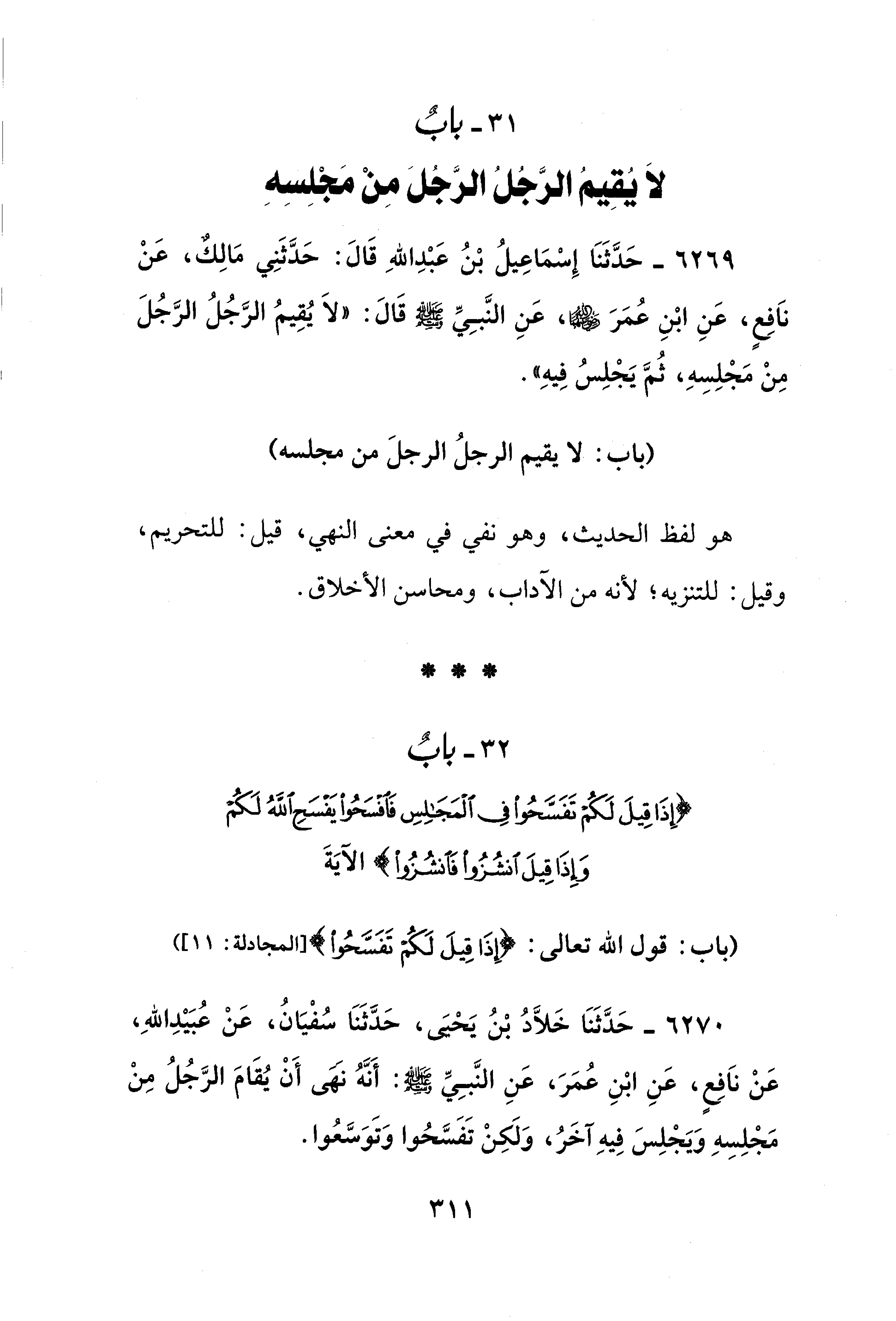 31 - بابٌ لاَ يُقِيمُ الرَّجُلُ الرَّجُلَ مِنْ مَجْلِسِهِ