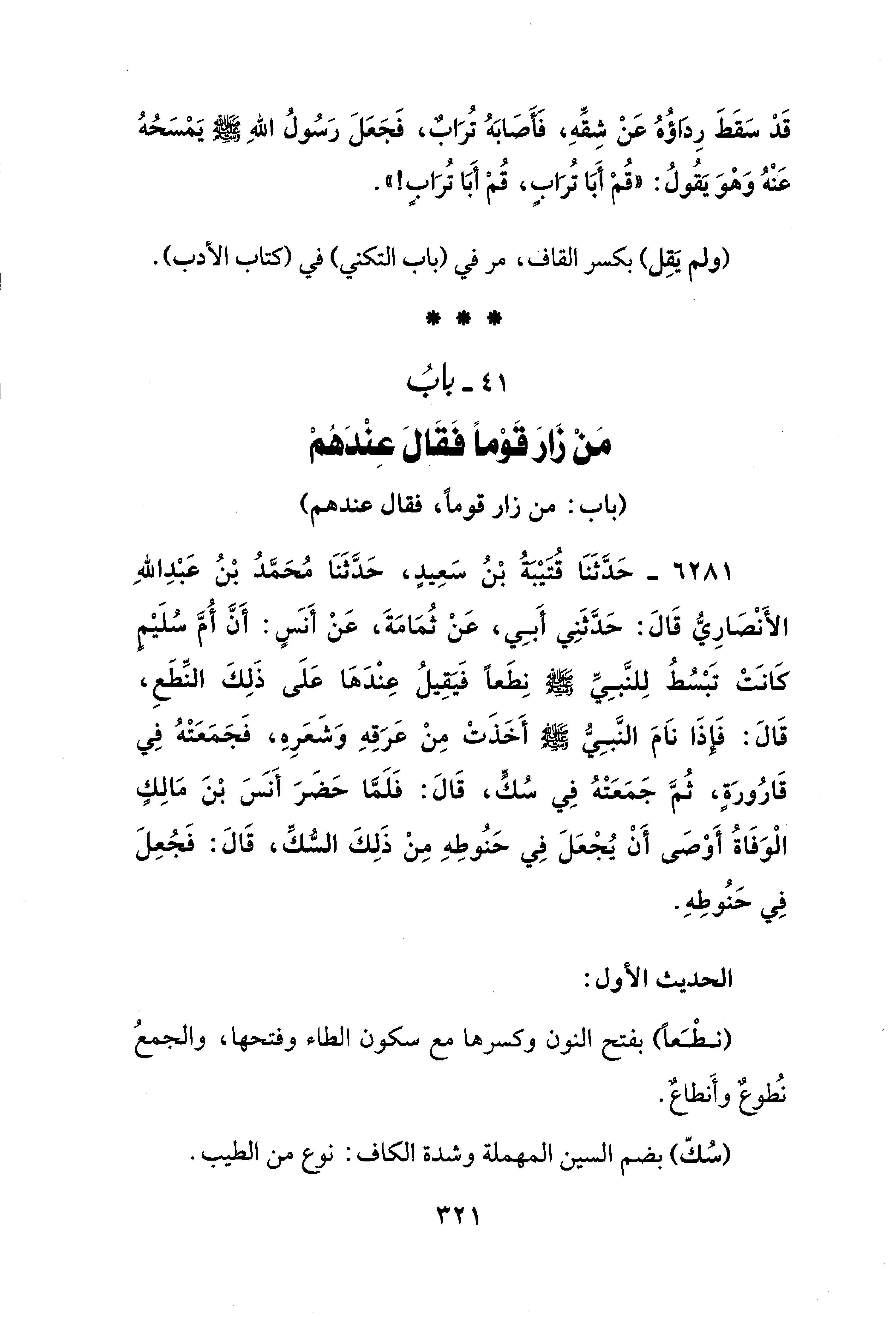 6281 - حَدَّثَنَا قُتَيْبَةُ بْنُ سَعِيدٍ، حَدَّثَنَا مُحَمَّدُ بْنُ عَبْدِ اللهِ الأَنْصَارِيُّ قَالَ: حَدَّثَنِي أَبِي، عَنْ ثُمَامَةَ، عَنْ أَنسٍ: أَنَّ أُمَّ سُلَيْمٍ كَانَتْ تَبْسُطُ لِلنَّبيِّ - صلى الله عليه وسلم - نِطَعًا فَيَقِيلُ عِنْدَهَا عَلَى ذَلِكَ النِّطَعِ، قَالَ: فَإِذَا نَامَ النَّبِيُّ - صلى الله عليه وسلم - أَخَذَتْ مِنْ عَرَقِهِ وَشَعَرِهِ، فَجَمَعَتْهُ فِي قَارُورَةٍ، ثُمَّ جَمَعَتْهُ فِي سُكٍّ، قَالَ: فَلَمَّا حَضَرَ أَنس بْنَ مَالِكٍ الْوَفَاةُ أَوْصَى أَنْ يُجْعَلَ فِي حَنُوطِهِ مِنْ ذَلِكَ السُّكِّ، قَالَ: فَجُعِلَ فِي حَنُوطِهِ.