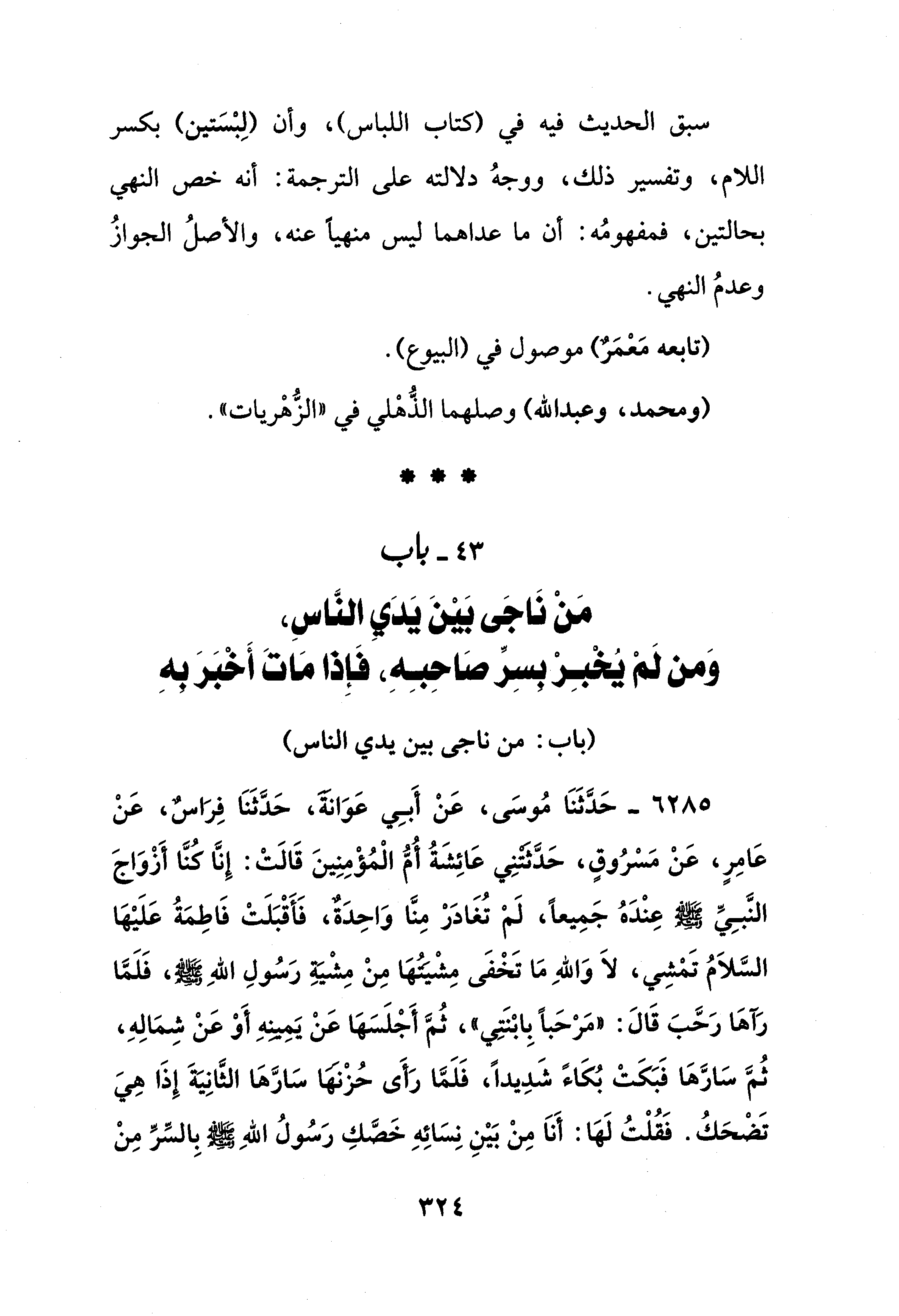 6285 - حَدَّثَنَا مُوسَى، عَنْ أَبِي عَوَانةَ، حَدَّثَنَا فِرَاسٌ، عَنْ عَامِرٍ، عَنْ مَسْرُوقٍ، حَدَّثَتْنِي عَائِشَةُ أُمُّ الْمُؤْمِنِينَ قَالَتْ: إِنَّا كُنَّا أَزْوَاجَ النَّبِيِّ - صلى الله عليه وسلم - عِنْدَهُ جَمِيعًا، لَمْ تُغَادَرْ مِنَّا وَاحِدَةٌ، فَأَقْبَلَتْ فَاطِمَةُ عَلَيْهَا السَّلاَمُ تَمْشِي، لَا وَاللهِ مَا تَخْفَى مِشْيَتُهَا مِنْ مِشْيَةِ رَسُولِ اللهِ - صلى الله عليه وسلم -، فَلَمَّا رَآهَا رَحَّبَ قَالَ: "مَرْحَبًا بِابْنَتِي"، ثُمَّ أَجْلَسَهَا عَنْ يَمِينهِ أَوْ عَنْ شِمَالِهِ، ثُمَّ سَارَّهَا فَبَكَتْ بُكَاءً شَدِيدًا، فَلَمَّا رَأَى حُزْنها سَارَّهَا الثَّانِيةَ إِذَا هِيَ تَضْحَكُ. فَقُلْتُ لَهَا: أَنَا مِنْ بَيْنِ نِسَائِهِ خَصَّكِ رَسُولُ اللهِ - صلى الله عليه وسلم - بِالسِّرِّ مِنْ