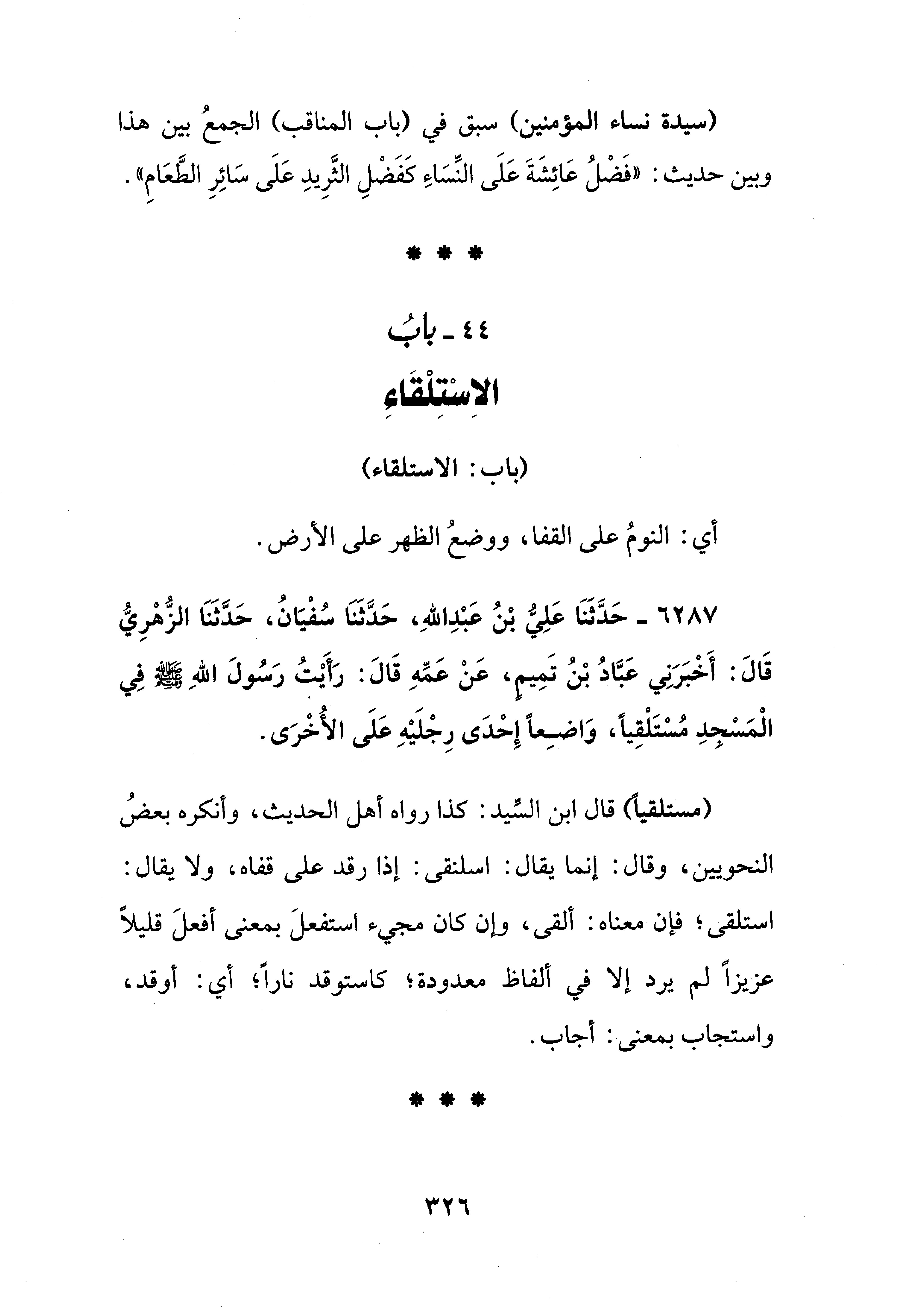 6287 - حَدَّثَنَا عَلِيُّ بْنُ عَبْدِ اللهِ، حَدَّثَنَا سُفْيَانُ، حَدَّثَنَا الزُّهْرِيُّ قَالَ: أَخْبَرَنِي عبَّادُ بْنُ تَمِيمِ، عَنْ عَمِّهِ قَالَ: رَأَيْتُ رَسُولَ اللهِ - صلى الله عليه وسلم - فِي الْمَسْجدِ مُسْتَلْقِيًا، وَاضِعًا إِحْدَى رِجْلَيْهِ عَلَى الأُخْرَى.