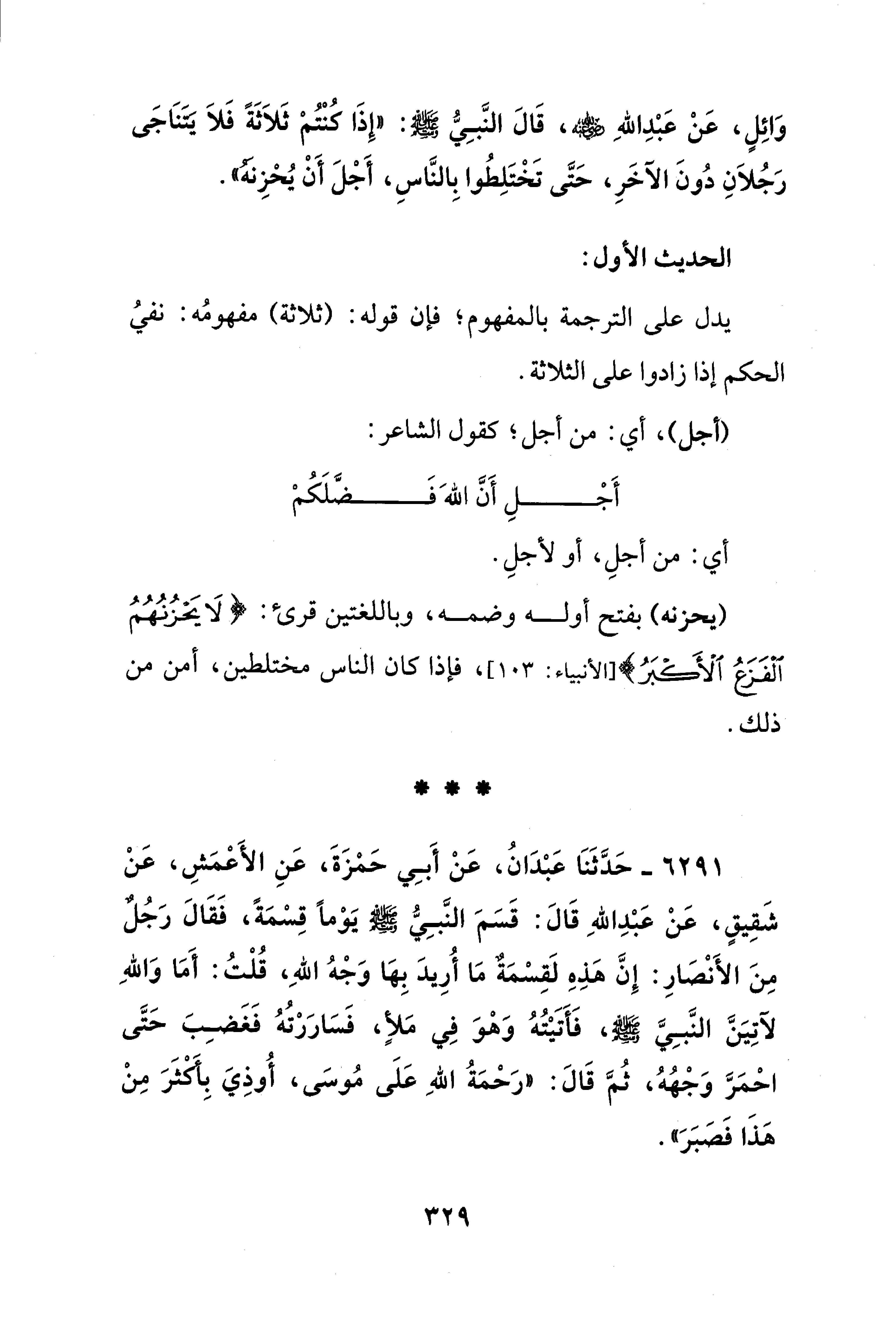 وَائِلٍ، عَنْ عَبْدِ اللهِ - رضي الله عنه -، قَالَ النَّبِيُّ - صلى الله عليه وسلم -: "إِذَا كُنْتُمْ ثَلاَثَةً فَلَا يَتَنَاجَى رَجُلاَنِ دُونَ الآخَرِ، حَتَّى تَخْتَلِطُوا بِالنَّاسِ، أَجْلَ أَنْ يُحْزِنَهُ".
