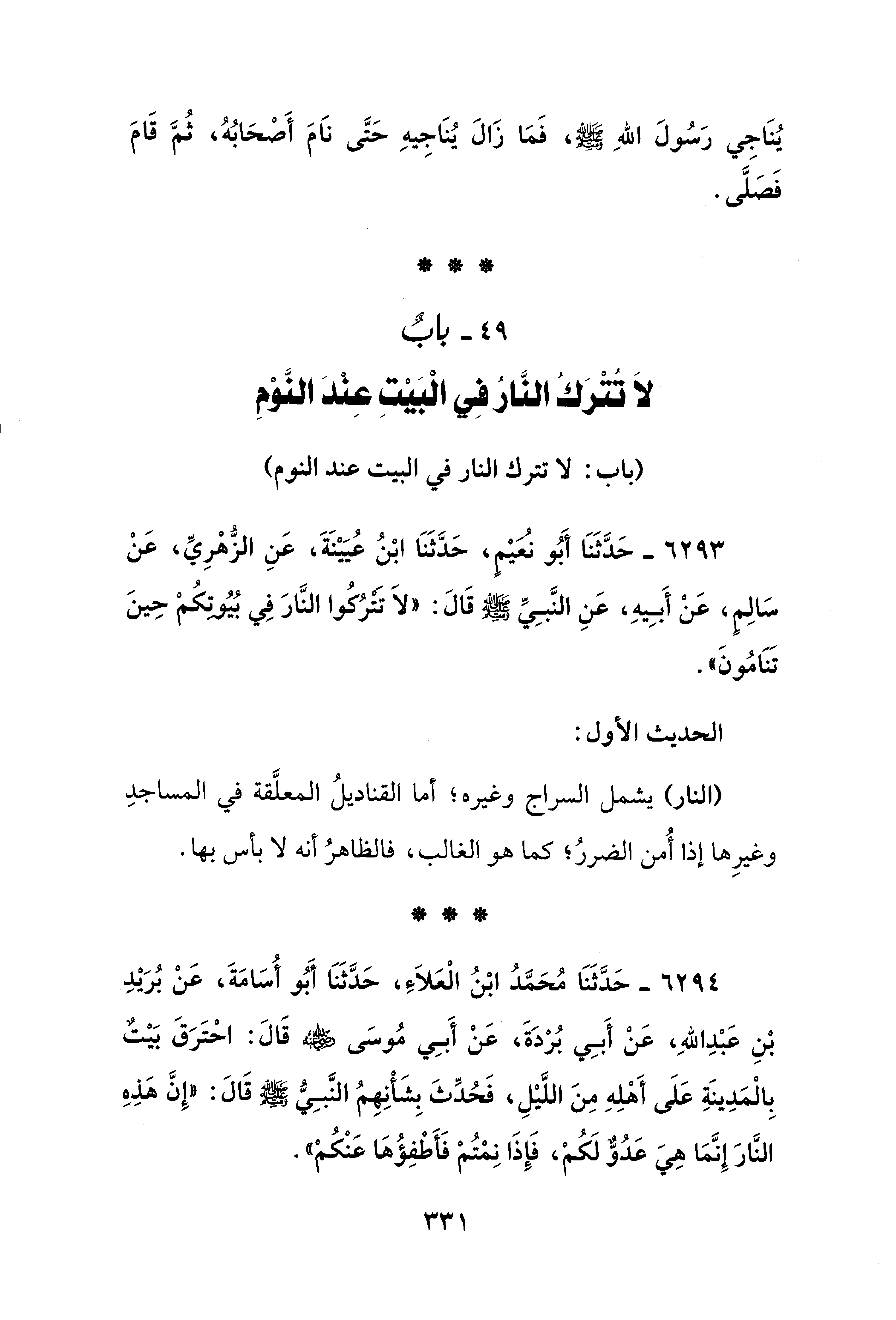 6294 - حَدَّثَنَا مُحَمَّدُ ابْنُ الْعَلاَءِ، حَدَّثَنَا أَبُو أُسَامَةَ، عَنْ بُرَيْدِ بْنِ عَبْدِ اللهِ، عَنْ أَبِي بُرْدَةَ، عَنْ أَبِي مُوسَى - رضي الله عنه - قَالَ: احْتَرَقَ بَيْتٌ بِالْمَدِينَةِ عَلَى أَهْلِهِ مِنَ اللَّيْلِ، فَحُدِّثَ بِشَأْنِهِمُ النَّبِيُّ - صلى الله عليه وسلم - قَالَ: "إِنَّ هَذِهِ النَّارَ إِنَّمَا هِيَ عَدُوٌّ لَكُمْ، فَإِذَا نِمْتُمْ فَأَطْفِؤُهَا عَنْكُمْ".