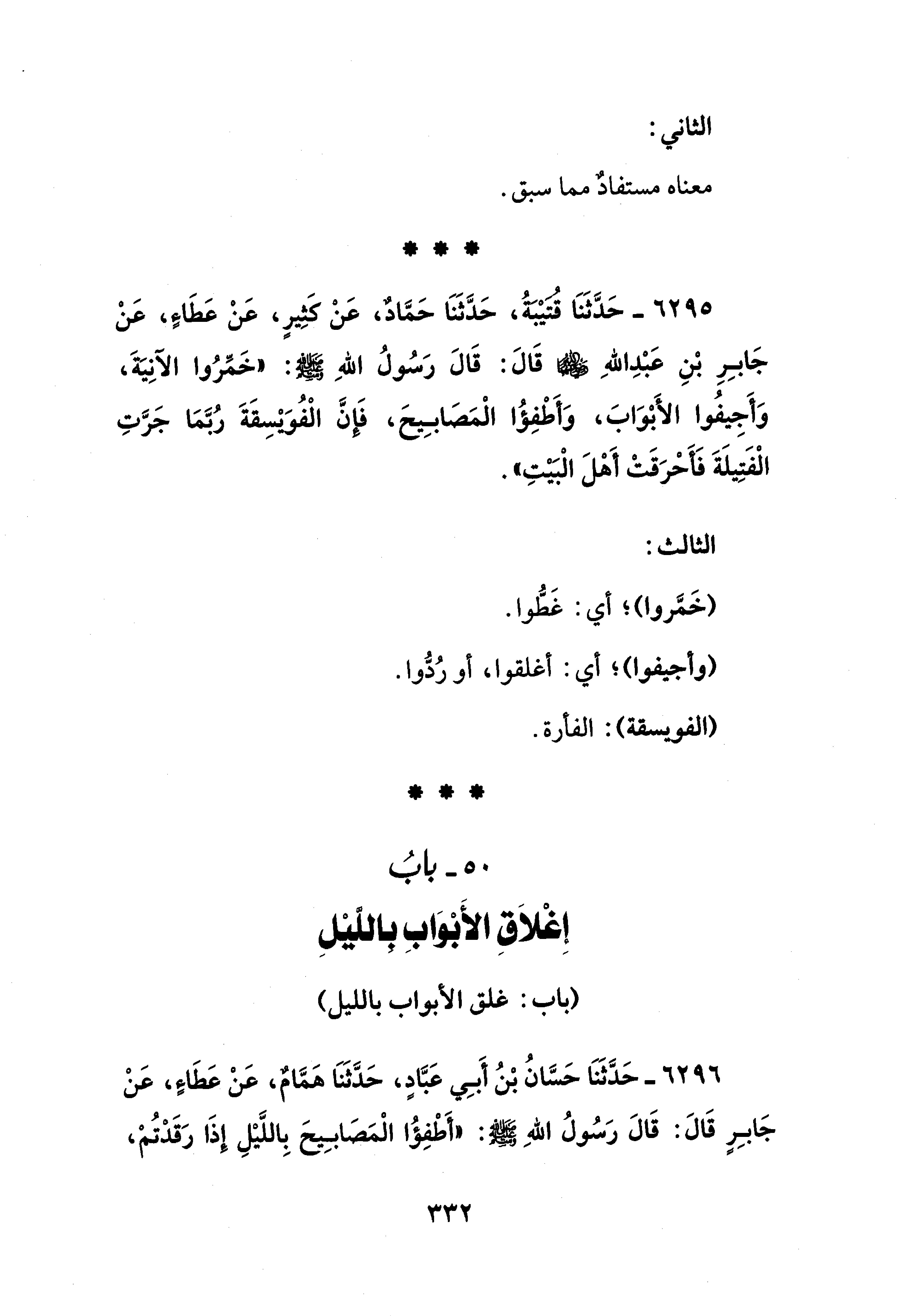 6295 - حَدَّثَنَا قُتَيْبَةُ، حَدَّثَنَا حَمَّادٌ، عَنْ كثِيرٍ، عَنْ عَطَاءٍ، عَنْ جَابِرِ بْنِ عَبْدِ اللهِ - رضي الله عنهما - قَالَ: قَالَ رَسُولُ اللهِ - صلى الله عليه وسلم -: "خَمِّرُوا الآنِيَةَ، وَأَجِيفُوا الأَبْوَابَ، وَأَطْفِؤُا الْمَصَابِيحَ، فَإِنَّ الْفُويسِقَةَ رُبَّمَا جَرَّتِ الْفَتِيلَةَ فَأَحْرَقَتْ أَهْلَ الْبَيْت".