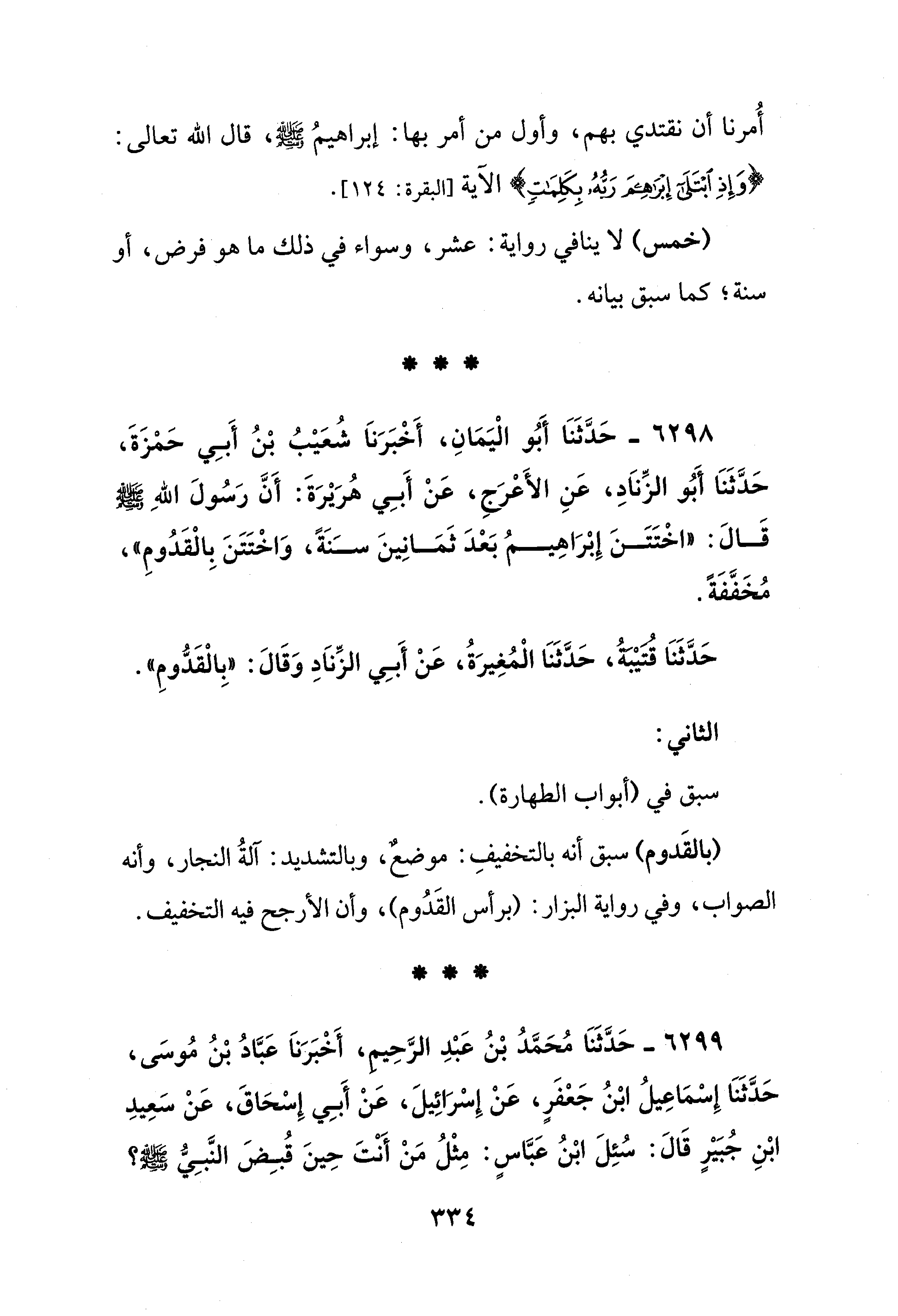 6298 - حَدَّثَنَا أَبُو الْيَمَانِ، أَخْبَرَنَا شُعَيْبُ بْنُ أَبِي حَمْزَةَ، حَدَّثَنَا أَبُو الزِّنَادِ، عَنِ الأَعْرَجِ، عَنْ أَبِي هُرَيْرَةَ: أَنَّ رَسُولَ اللهِ - صلى الله عليه وسلم - قَالَ: "اخْتَتَنَ إِبْرَاهِيمُ بَعْدَ ثَمَانِينَ سَنَةً، وَاخْتَتَنَ بِالْقَدُومِ"، مُخَفَّفَةً.