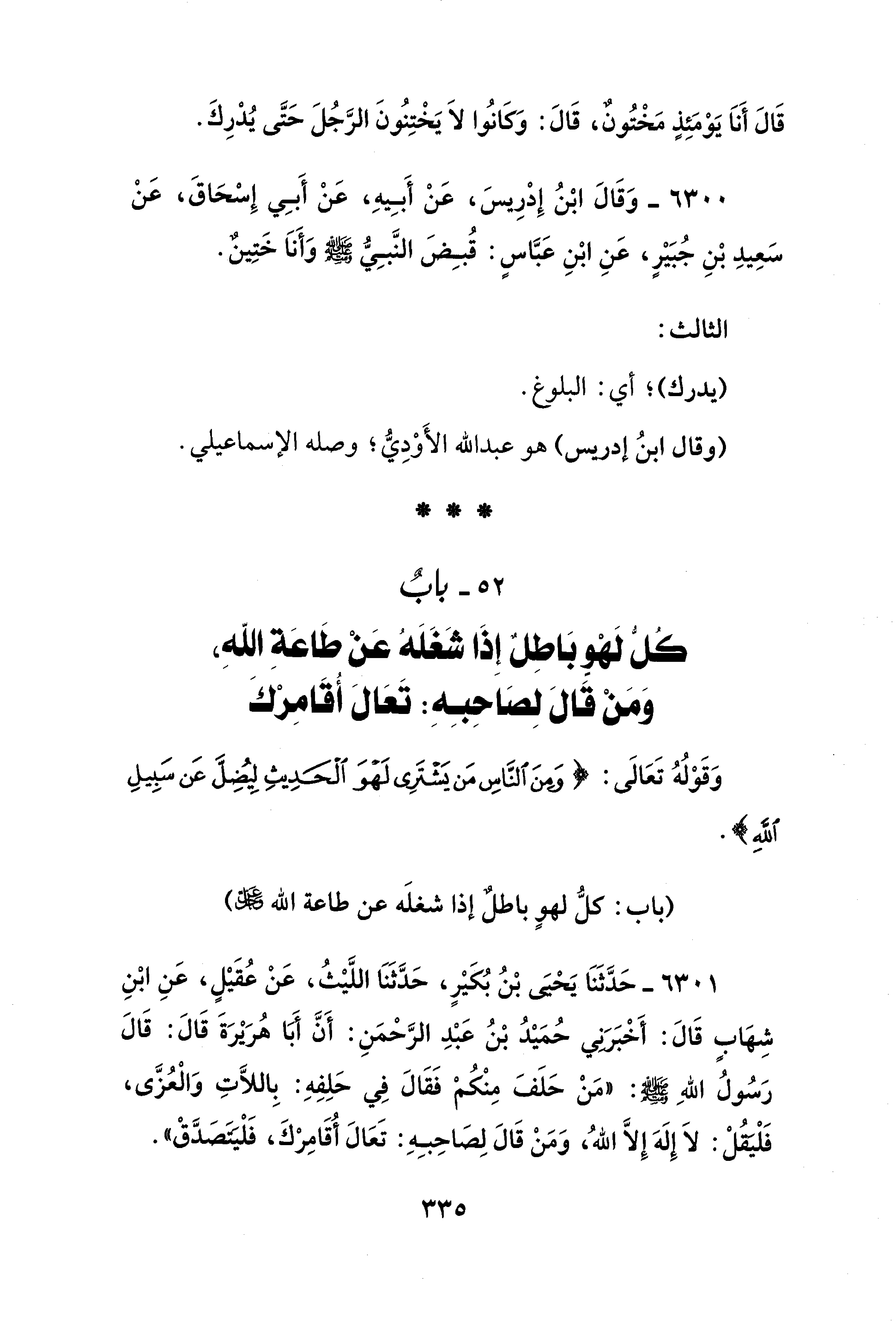 52 - بابٌ كُلُّ لَهْوٍ بَاطِلٌ إِذَا شَغَلَهُ عَنْ طَاعَةِ اللهِ، وَمَنْ قَالَ لِصَاحِبِهِ: تَعَالَ أُقَامِرْكَ