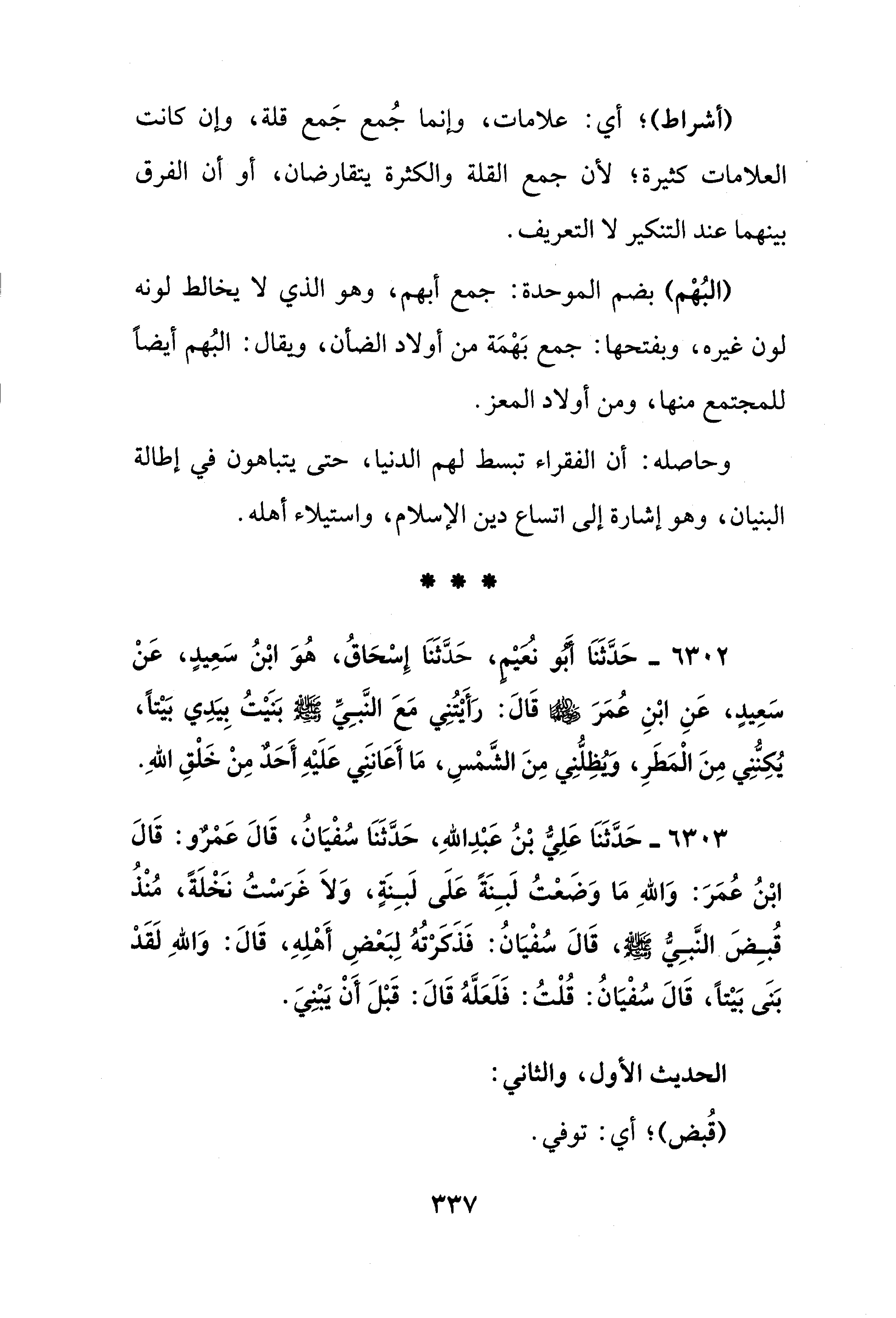 6303 - حَدَّثَنَا عَلِيُّ بْنُ عَبْدِ اللهِ، حَدَّثَنَا سُفْيَانُ، قَالَ عَمْرٌو: قَالَ ابْنُ عُمَرَ: وَاللهِ مَا وَضَعْتُ لَبِنَةً عَلَى لَبِنَةٍ، وَلَا غَرَسْتُ نَخْلَةً، مُنْذُ قُبِضَ النَّبِيُّ - صلى الله عليه وسلم -، قَالَ سُفْيَانُ: فَذَكَرْتُهُ لِبَعْضِ أَهْلِهِ، قَالَ: وَاللهِ لَقَدْ بَنَى بَيْتًا، قَالَ سُفْيَانُ: قُلْتُ: فَلَعَلَّهُ قَالَ: قَبْلَ أَنْ يَبْنِيَ.