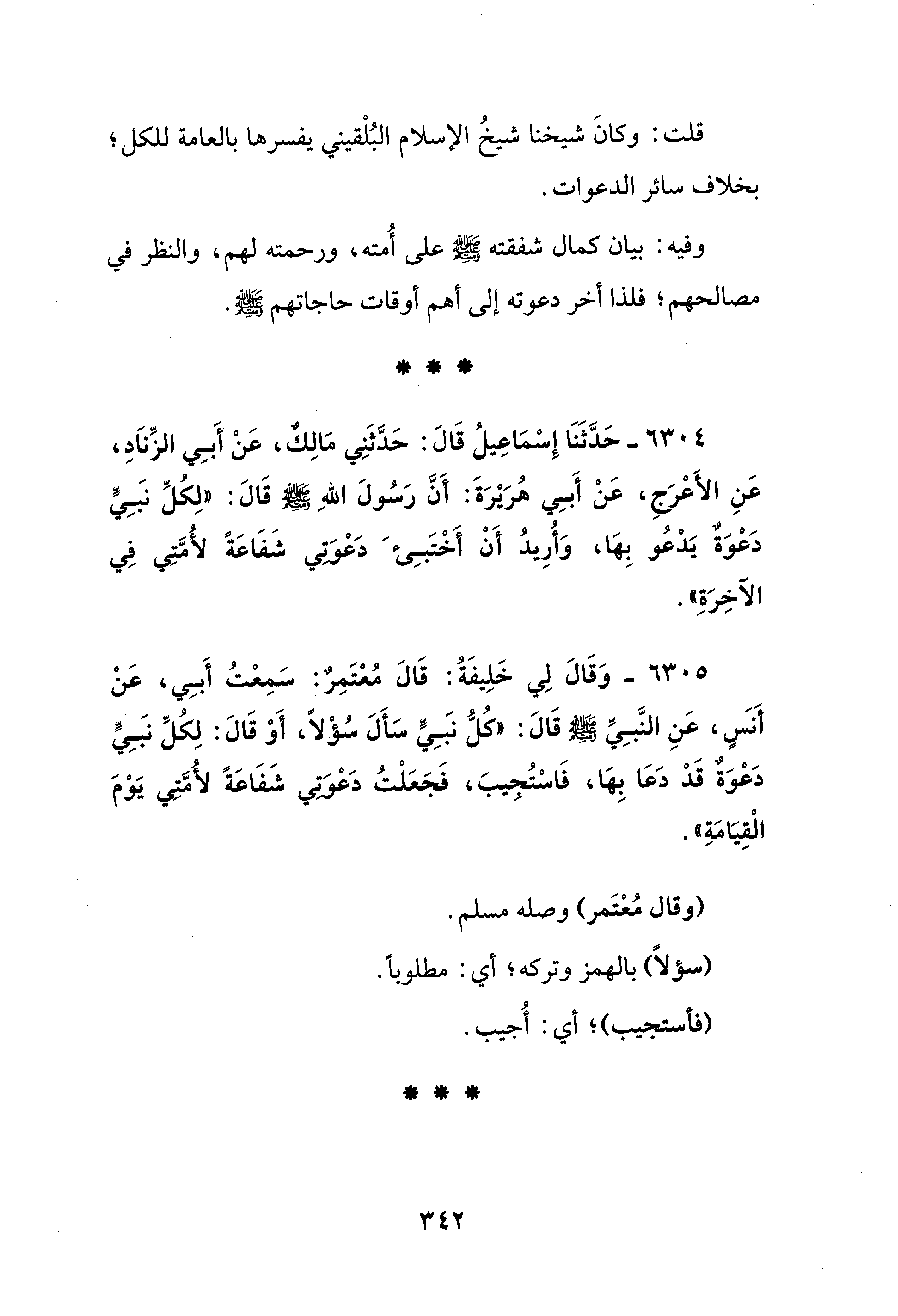 6304 - حَدَّثَنَا إِسْمَاعِيلُ قَالَ: حَدَّثَنِي مَالِكٌ، عَنْ أَبِي الزِّنَادِ، عَنِ الأَعْرَجِ، عَنْ أَبِي هُرَيْرَةَ: أَنَّ رَسُولَ اللهِ - صلى الله عليه وسلم - قَالَ: "لِكُلِّ نبَيٍّ دَعْوَةٌ يَدْعُو بِهَا، وَأُرِيدُ أَنْ أَخْتَبِئَ دَعْوَتِي شَفَاعَةً لأُمَّتِي فِي الآخِرَة".