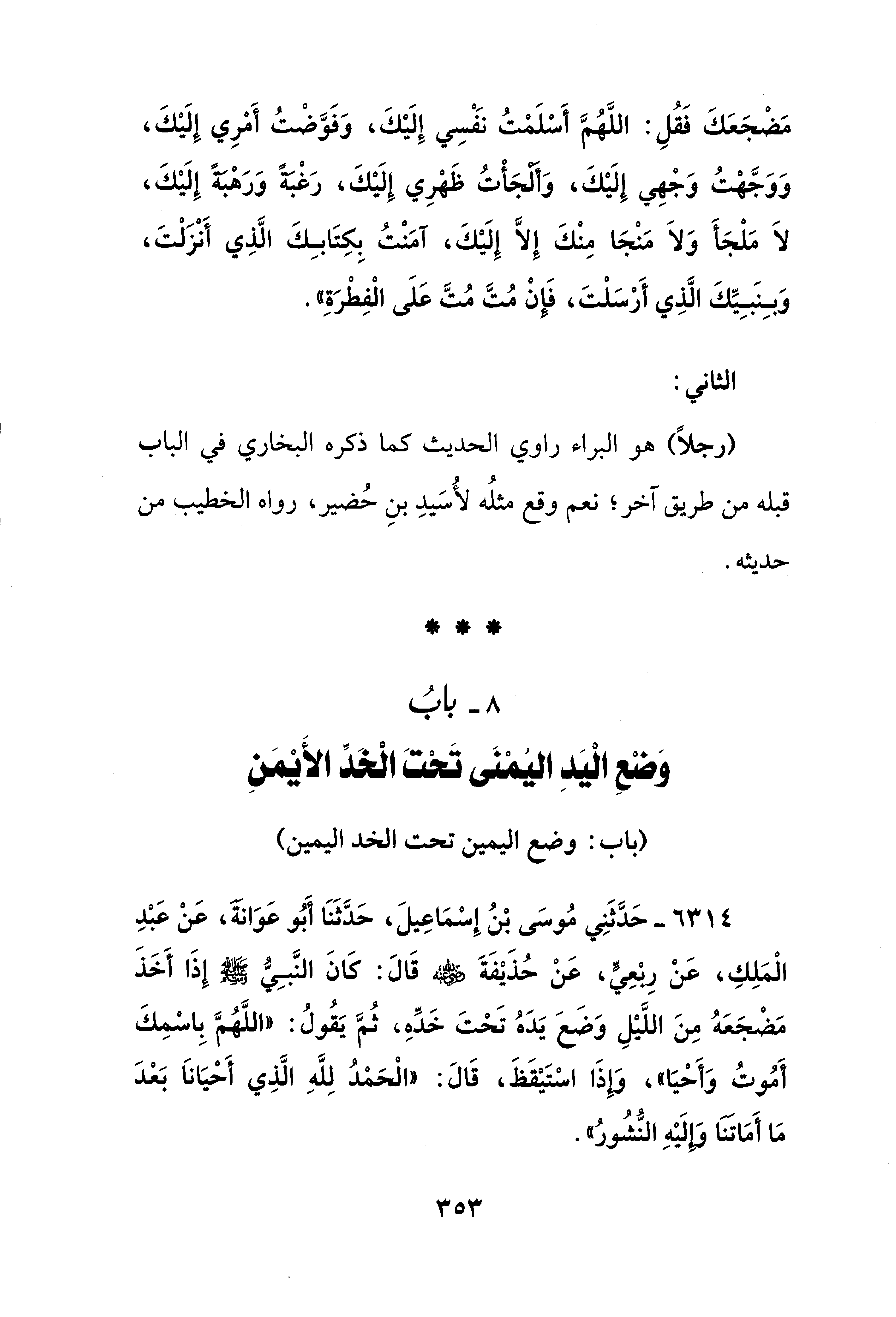 8 - بابُ وَضْعِ الْيَدِ اليُمْنَى تَحْتَ الْخَدِّ الأَيْمَنِ