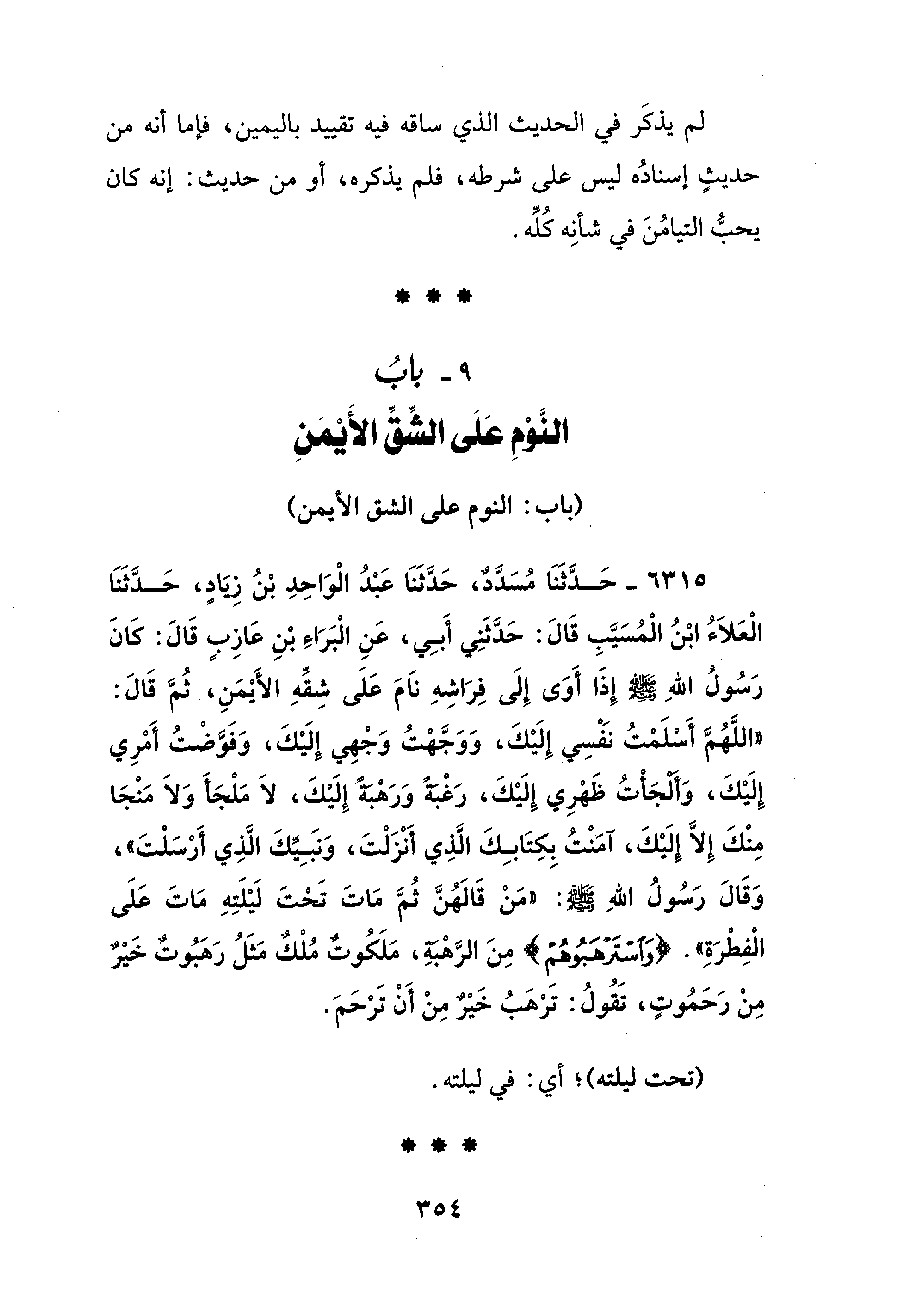 6315 - حَدَّثَنَا مُسَدَّدٌ، حَدَّثَنَا عَبْدُ الْوَاحِدِ بْنُ زِيَادٍ، حَدَّثَنَا الْعَلاَءُ ابْنُ الْمُسَيَّبِ قَالَ: حَدَّثَنِي أَبِي، عَنِ الْبَرَاءِ بْنِ عَازِبٍ قَالَ: كَانَ رَسُولُ اللهِ - صلى الله عليه وسلم - إِذَا أَوَى إِلَى فِرَاشِهِ نَامَ عَلَى شِقِّهِ الأَيْمَنِ، ثُمَّ قَالَ: "اللَّهُمَّ أَسْلَمْتُ نَفْسِي إِلَيْكَ، وَوَجَّهْتُ وَجْهِي إِلَيْكَ، وَفَوَّضْتُ أَمْرِي إِلَيْكَ، وَأَلْجَأْتُ ظَهْرِي إِلَيْكَ، رَغْبَةً وَرَهْبَةً إِلَيْكَ، لَا مَلْجَأَ وَلَا مَنْجَا مِنْكَ إِلَّا إِلَيْكَ، آمَنْتُ بِكِتَابِكَ الَّذِي أَنْزَلْتَ، وَنبَيِّكَ الَّذِي أَرْسَلْتَ"، وَقَالَ رَسُولُ اللهِ - صلى الله عليه وسلم -: "مَنْ قَالَهُنَّ ثُمَّ مَاتَ تَحْتَ لَيْلَتِهِ مَاتَ عَلَى الْفِطْرَةِ". {وَاسْتَرْهَبُوهُمْ} مِنَ الرَّهْبَةِ، مَلَكُوتٌ مُلْكٌ مَثَلُ رَهَبُوتٌ خَيْرٌ مِنْ رَحَمُوتٍ، تَقُولُ: ترْهَبُ خَيْرٌ مِنْ أَنْ تَرْحَمَ.