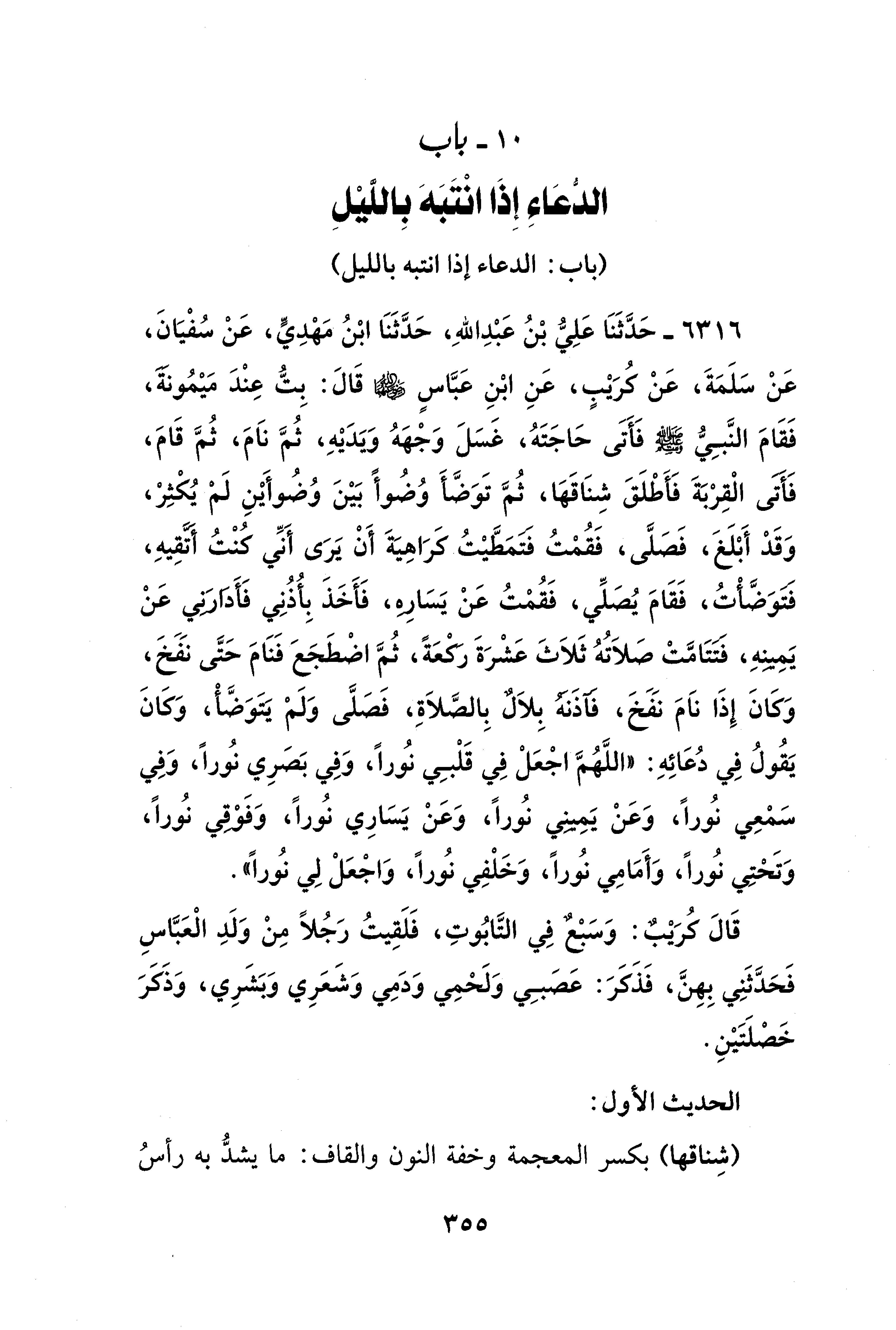 6316 - حَدَّثَنَا عَلِيُّ بْنُ عَبْدِ اللهِ، حَدَّثَنَا ابْنُ مَهْدِيٍّ، عَنْ سُفْيَانَ، عَنْ سَلَمَةَ، عَنْ كُرَيْبٍ، عَنِ ابْنِ عَبَّاسٍ - رضي الله عنهما - قَالَ: بِتُّ عِنْدَ مَيْمُونَةَ، فَقَامَ النَّبِيُّ - صلى الله عليه وسلم - فَأَتَى حَاجَتَهُ، غَسَلَ وَجْهَهُ وَيَدَيْهِ، ثُمَّ نَامَ، ثُمَّ قَامَ، فَأَتَى الْقِرْبَةَ فَأَطْلَقَ شِنَاقَهَا، ثُمَّ تَوَضَّأَ وُضُوأً بَيْنَ وُضُوأَيْنِ لَمْ يُكْثِرْ، وَقَدْ أَبْلَغَ، فَصَلَّى، فَقُمْتُ فتمَطَّيْتُ كَرَاهِيَهَ أَنْ يَرَى أنِّي كُنْتُ أَتَّقِيهِ، فتوَضَّأْتُ، فَقَامَ يُصَلِّي، فَقُمْتُ عَنْ يَسَارِهِ، فَأَخَذَ بِأُذُنِي فَأَدَارَنِي عَنْ يَمِينِهِ، فتتَامَّتْ صَلاَتُهُ ثَلاَثَ عَشْرَةَ رَكْعَةً، ثُمَّ اضْطَجَعَ فَنَامَ حَتَّى نَفَخَ، وَكَانَ إِذَا نَامَ نَفَخَ، فَآذَنه بِلاَلٌ بِالصَّلاَةِ، فَصَلَّى وَلَمْ يَتَوَضَّأْ، وَكَانَ يَقُولُ فِي دُعَائِهِ: "اللَّهُمَّ اجْعَلْ فِي قَلْبِي نُورًا، وَفِي بَصَرِي نُورًا، وَفِي سَمْعِي نُورًا، وَعَنْ يَمِينِي نُورًا، وَعَنْ يَسَارِي نُورًا، وَفَوْقِي نُورًا، وَتَحْتِي نُورًا، وَأَمَامِي نُورًا، وَخَلْفِي نُورًا، وَاجْعَلْ لِي نُورًا".