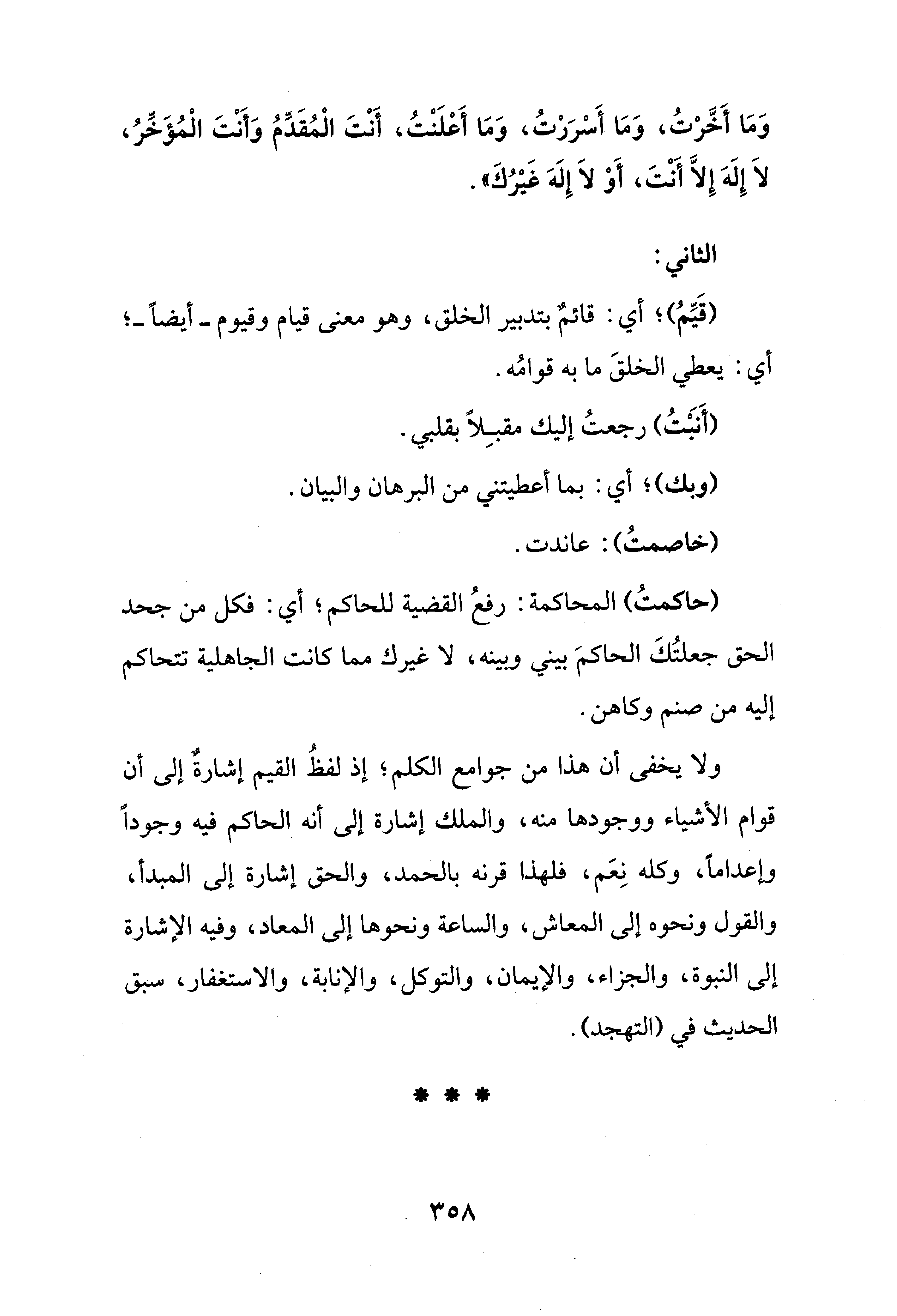 ولا يخفى أن هذا من جوامع الكلم؛ إذ لفظُ القيم إشارةٌ إلى أن قوام الأشياء ووجودها منه، والملك إشارة إلى أنه الحاكم فيه وجودًا وإعدامًا، وكله نِعَم، فلهذا قرنه بالحمد، والحق إشارة إلى المبدأ، والقول ونحوه إلى المعاش، والساعة ونحوها إلى المعاد، وفيه الإشارة إلى النبوة، والجزاء، والإيمان، والتوكل، والإنابة، والاستغفار، سبق الحديث في (التهجد).
