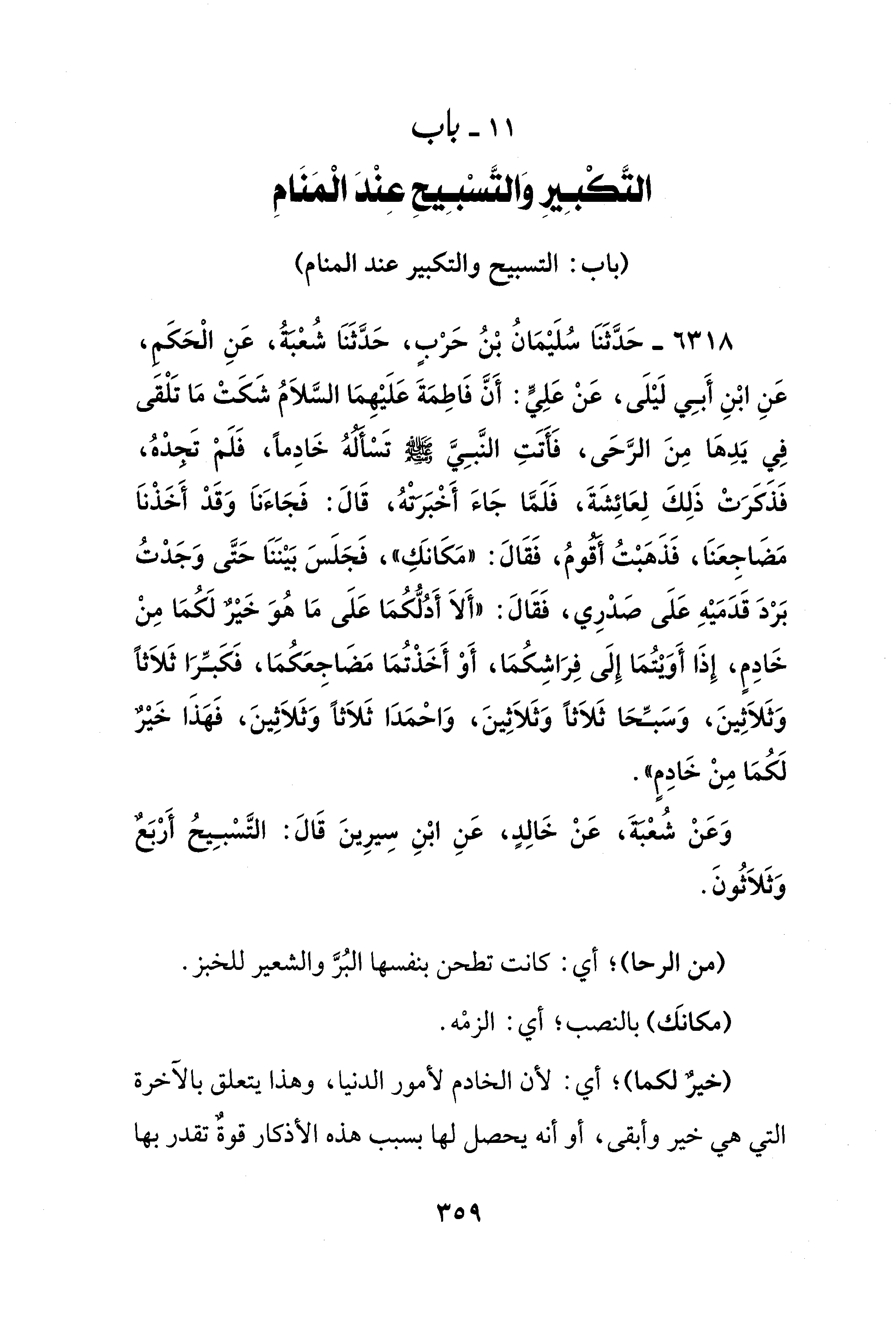 6318 - حَدَّثَنَا سُلَيْمَانُ بْنُ حَرْبٍ، حَدَّثَنَا شُعْبَةُ، عَنِ الْحَكَمِ، عَنِ ابْنِ أَبِي لَيْلَى، عَنْ عَلِيٍّ: أَنَّ فَاطِمَةَ عَلَيْهِمَا السَّلاَمُ شَكَتْ مَا تَلْقَى فِي يَدِهَا مِنَ الرَّحَى، فَأَتَتِ النَّبِيَّ - صلى الله عليه وسلم - تَسْأَلُهُ خَادِمًا، فَلَمْ تَجدْهُ، فَذَكَرَتْ ذَلِكَ لِعَائِشَةَ، فَلَمَّا جَاءَ أَخْبَرتْهُ، قَالَ: فَجَاءَنَا وَقَدْ أَخَذْنَا مَضَاجِعَنَا، فَذَهَبْتُ أَقُومُ، فَقَالَ: "مَكَانَكِ"، فَجَلَسَ بَيْنَنَا حَتَّى وَجَدْتُ بَرْدَ قَدَمَيْهِ عَلَى صَدْرِي، فَقَالَ: "أَلاَ أَدُلُّكُمَا عَلَى مَا هُوَ خَيْرٌ لَكُمَا مِنْ خَادِمٍ، إِذَا أَوَيْتُمَا إِلَى فِرَاشِكُمَا، أَوْ أَخَذْتُمَا مَضَاجِعَكُمَا، فَكَبِّرَا ثَلاَثًا وَثَلاَثِينَ، وَسَبِّحَا ثَلاَثًا وَثَلاَثِينَ، وَاحْمَدَا ثَلاَثًا وَثَلاَثِينَ، فَهَذَا خَيْرٌ لَكُمَا مِنْ خَادِمٍ".