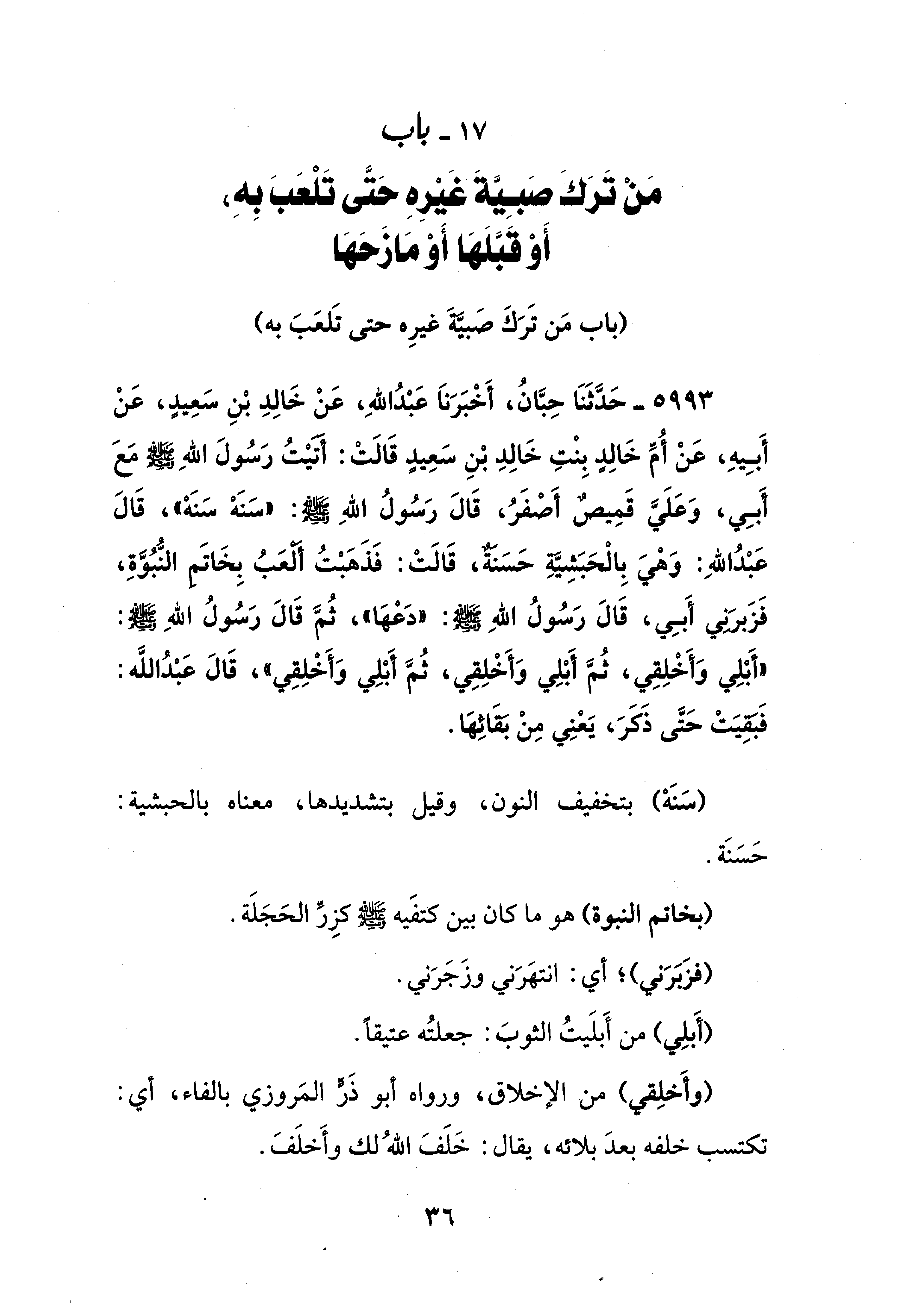 17 - باب مَنْ تَرَك صَبِيَّةَ غَيْرِهِ حَتَّى تَلْعَبَ بِهِ، أَوْ قَبَّلَهَا أَوْ مَازَحَهَا