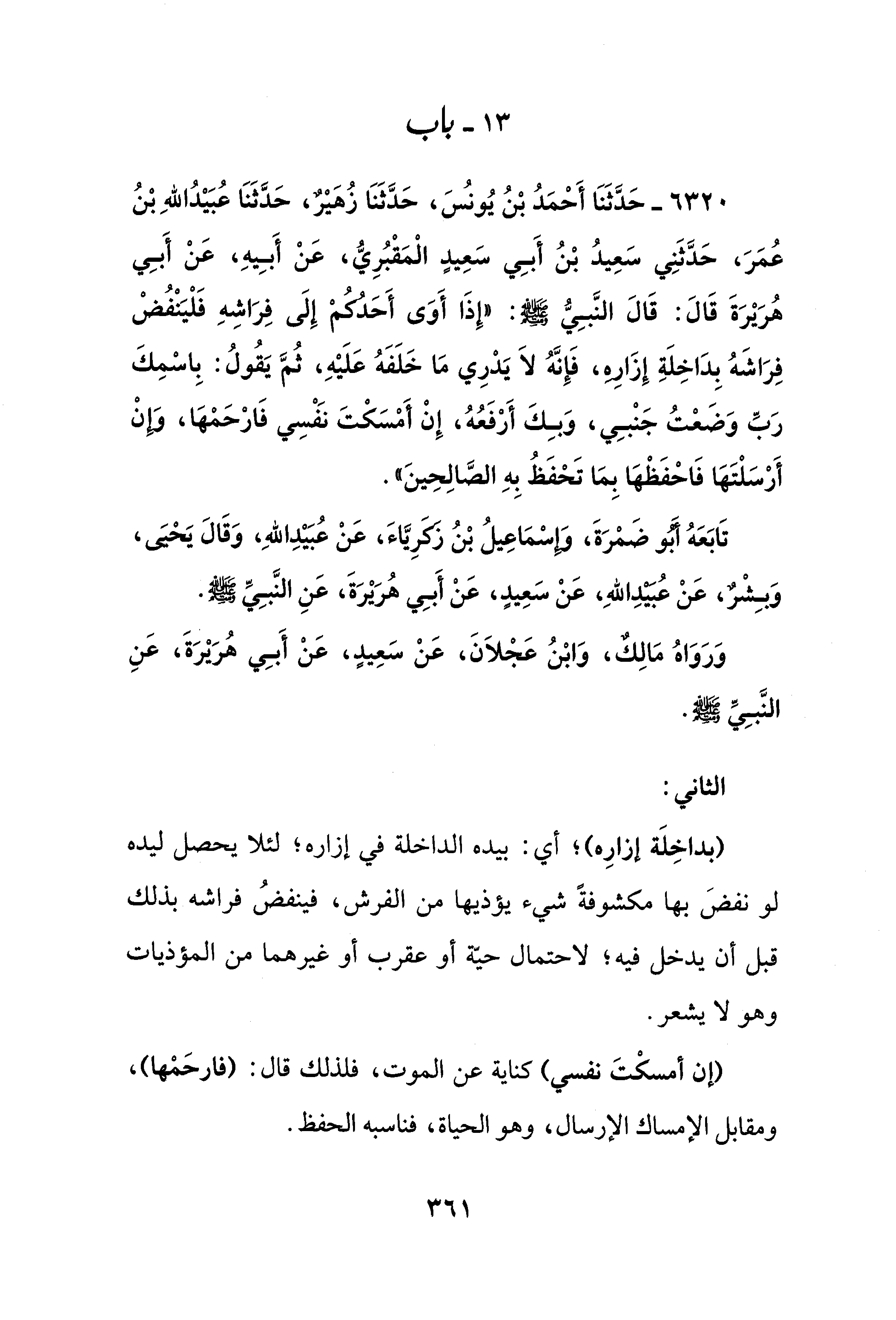 6320 - حَدَّثَنَا أَحْمَدُ بْنُ يُونس، حَدَّثَنَا زُهَيْرٌ، حَدَّثَنَا عُبَيْدُ اللهِ بْنُ عُمَرَ، حَدَّثَنِي سَعِيدُ بْنُ أَبِي سَعِيدٍ الْمَقْبُرِيُّ، عَنْ أَبِيهِ، عَنْ أَبِي هُرَيْرَةَ قَالَ: قَالَ النَّبِيُّ - صلى الله عليه وسلم -: "إِذَا أَوَى أَحَدُكُمْ إِلَى فِرَاشِهِ فَلْينفُضْ فِرَاشَهُ بِدَاخِلَةِ إِزَارِهِ، فَإنَّهُ لَا يَدْرِي مَا خَلَفَهُ عَلَيْهِ، ثُمَّ يَقُولُ: بِاسْمِكَ رَبِّ وَضَعْتُ جَنْبِي، وَبِكَ أَرْفَعُهُ، إِنْ أَمْسَكْتَ نَفْسِي فَارْحَمْهَا، وَإِنْ أَرْسَلْتَهَا فَاحْفَظْهَا بِمَا تَحْفَظُ بِهِ الصَّالِحِينَ".