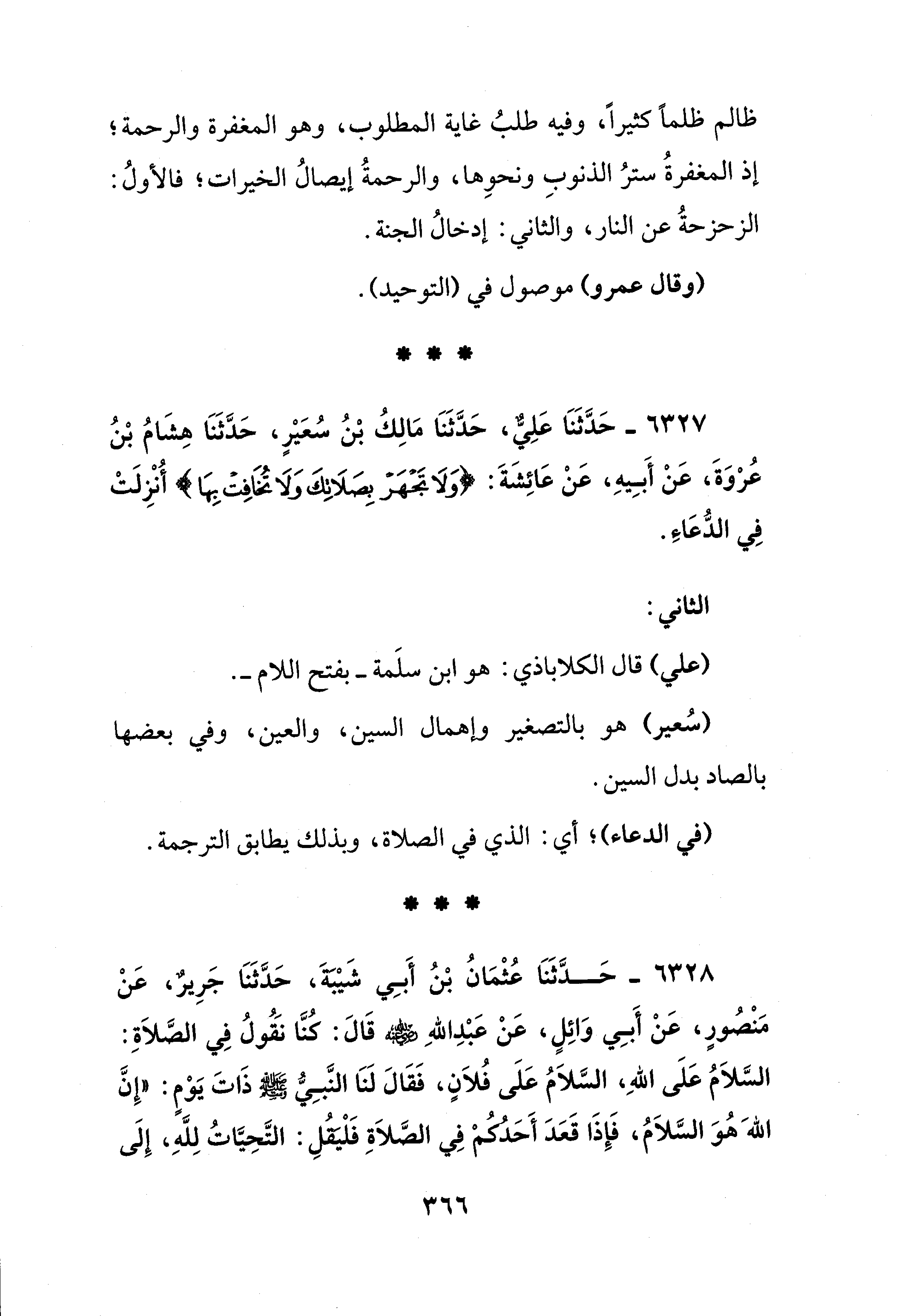 6327 - حَدَّثَنَا عَلِيٌّ، حَدَّثَنَا مَالِكُ بْنُ سُعَيْرٍ، حَدَّثَنَا هِشَامُ بْنُ عُرْوَةَ، عَنْ أَبِيهِ، عَنْ عَائِشَةَ: {وَلَا تَجْهَرْ بِصَلَاتِكَ وَلَا تُخَافِتْ بِهَا} أُنْزِلَتْ فِي الدُّعَاءِ.