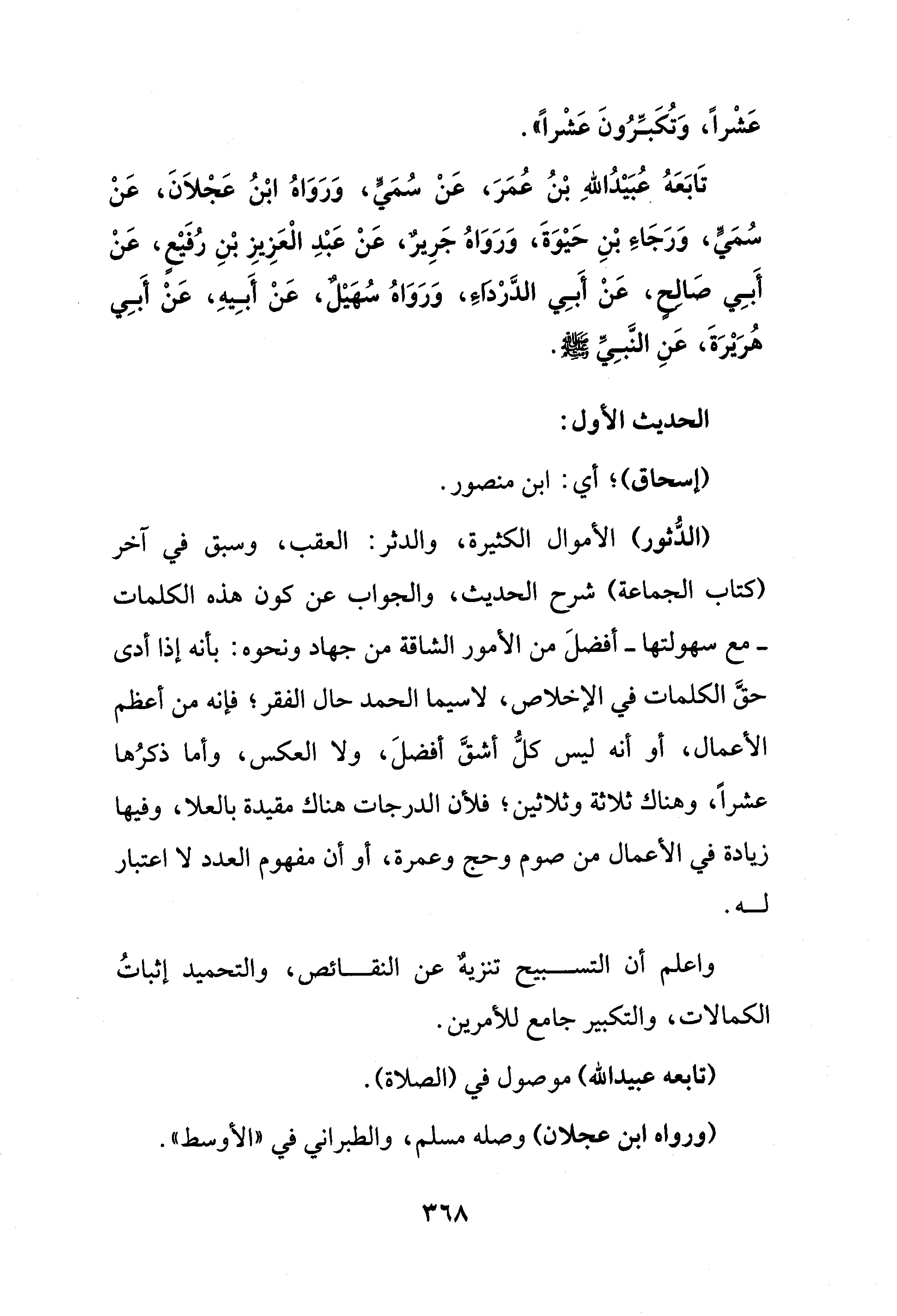 (الدُّثور) الأموال الكثيرة، والدثر: العقب، وسبق في آخر (كتاب الجماعة) شرح الحديث، والجواب عن كون هذه الكلمات -مع سهولتها- أفضلَ من الأمور الشاقة من جهاد ونحوه: بأنه إذا أدى حقَّ الكلمات في الإخلاص، لا سيما الحمد حال الفقر؛ فإنه من أعظم الأعمال، أو أنه ليس كلُّ أشقَّ أفضلَ، ولا العكس، وأما ذكرُها عشرًا، وهناك ثلاثة وثلاثين؛ فلأن الدرجات هناك مقيدة بالعلا، وفيها زيادة في الأعمال من صوم وحج وعمرة، أو أن مفهوم العدد لا اعتبار له.