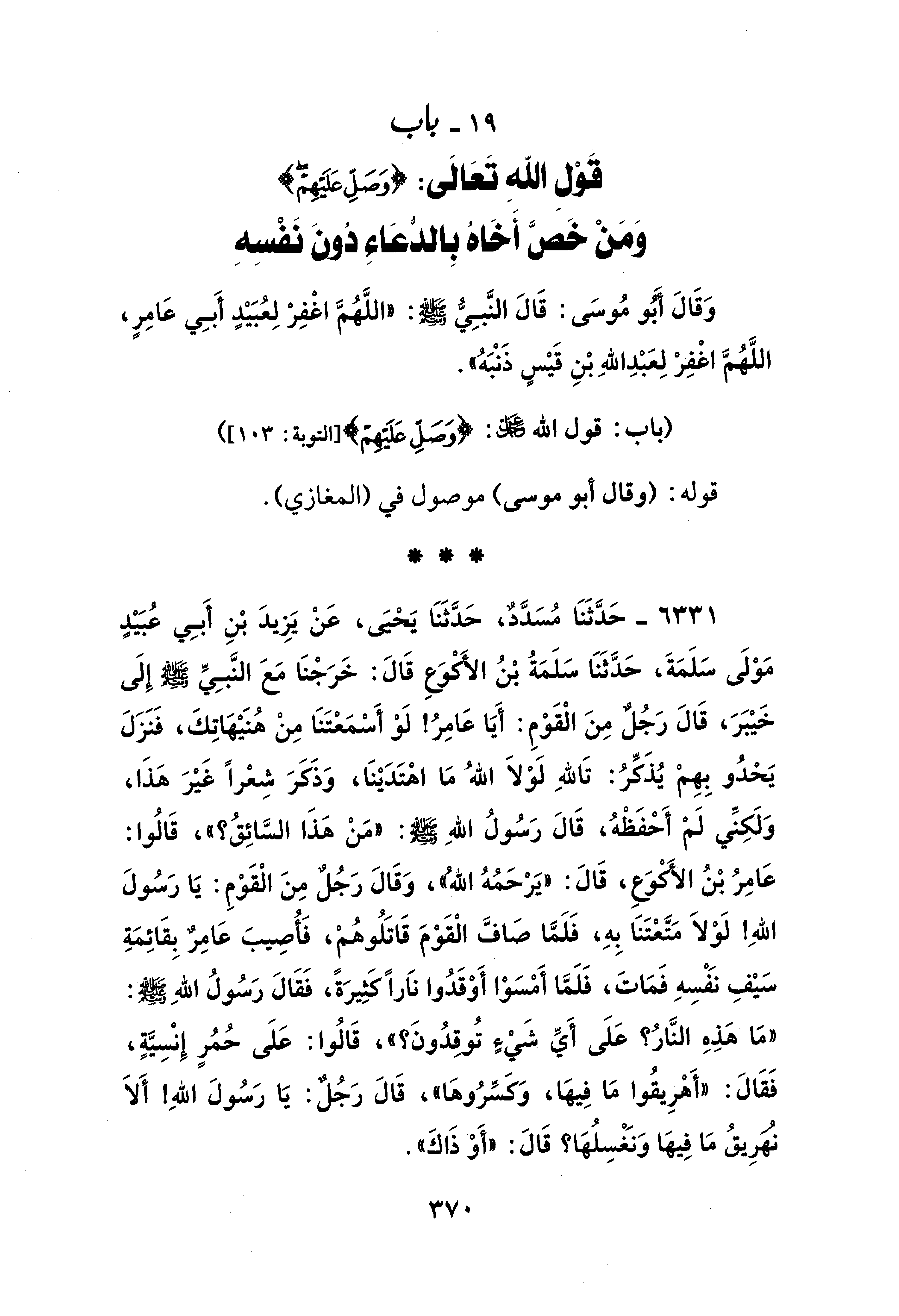 وَقَالَ أَبُو مُوسَى: قَالَ النَّبِيُّ - صلى الله عليه وسلم -: "اللَّهُمَّ اغْفِرْ لِعُبَيْدٍ أَبِي عَامِرٍ، اللَّهُمَّ اغْفِرْ لِعَبْدِ اللهِ بْنِ قَيْسٍ ذَنْبَهُ".