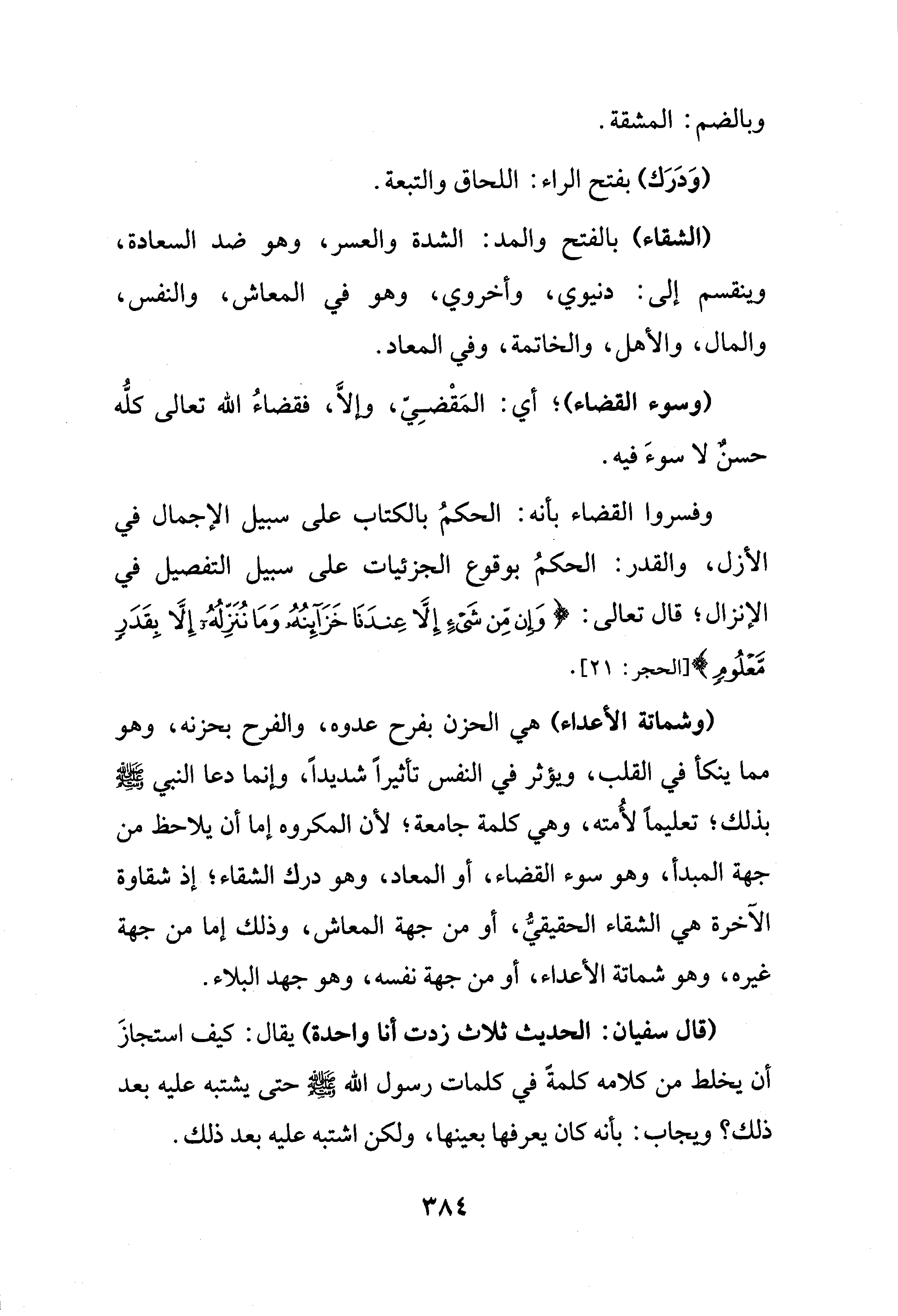 وفسروا القضاء بأنه: الحكمُ بالكتاب على سبيل الإجمال في الأزل، والقدر: الحكمُ بوقوع الجزئيات على سبيل التفصيل في الإنزال؛ قال تعالى: {وَإِنْ مِنْ شَيْءٍ إلا عِنْدَنَا خَزَائِنُهُ وَمَا نُنَزِّلُهُ إلا بِقَدَرٍ مَعْلُومٍ} [الحجر: 21].